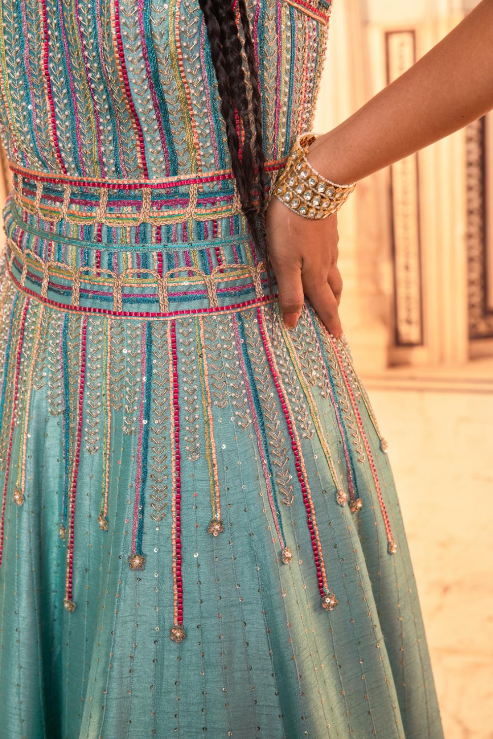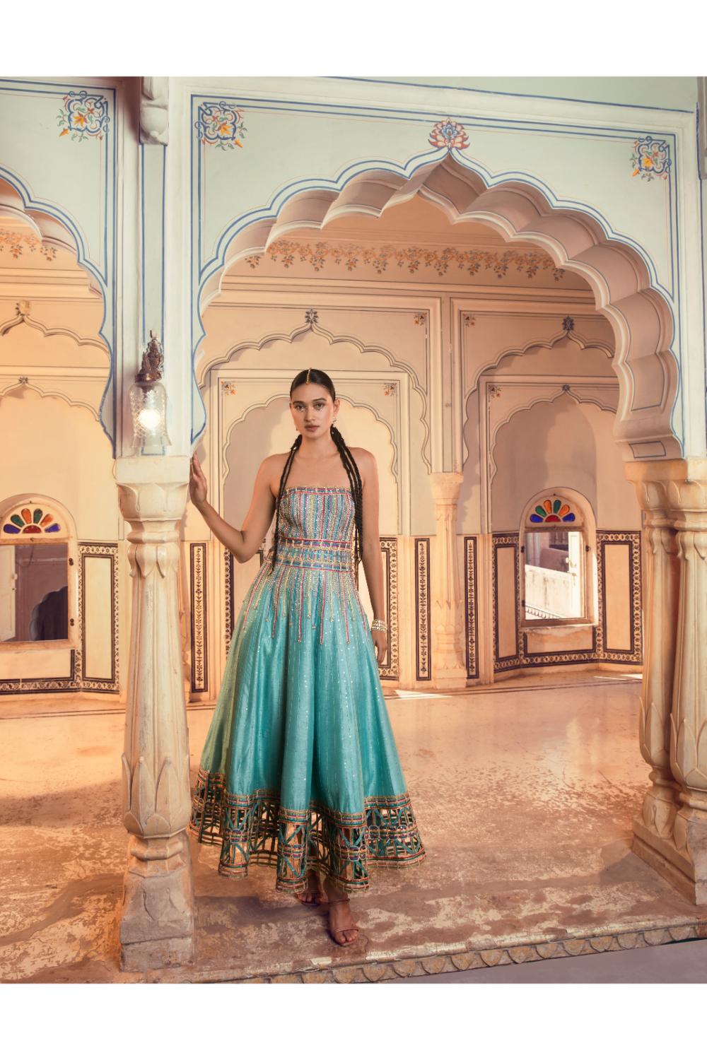 A fluid aqua-blue dress defined by intricate craftsmanship and graceful movement. The fitted bodice is adorned with fine linear embroidery, accentuated by delicate hand-set embellishments that create a rhythmic, vertical flow. The flared skirt is finished with a richly detailed geometric cut work border, adding structure and visual depth to the silhouette.