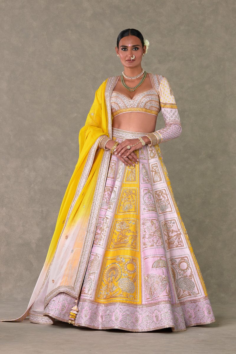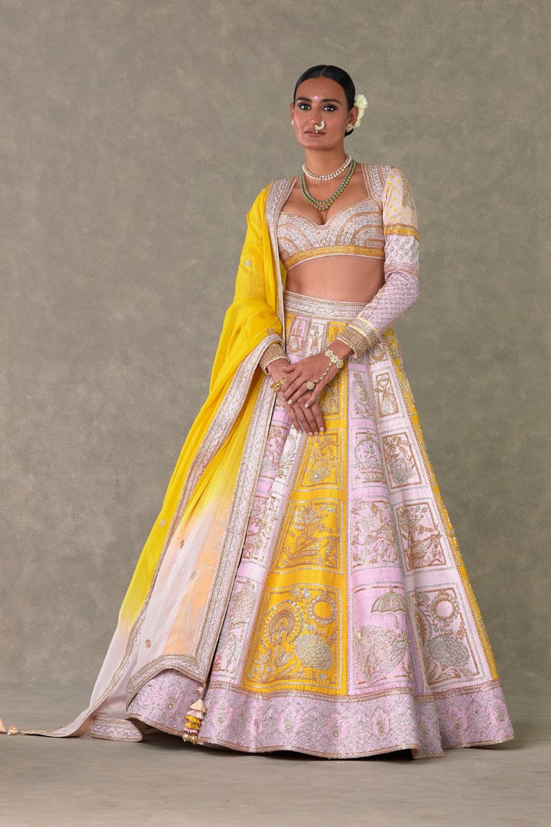 Lehenga Lehenga comes in not one but 3 different shades Lilac, Pink, yellow and is adorned with sona chandi dori, sitara, dabka and stone tikki kaam|Hemline is embellished with contrast colour block sona chandi embroidered border and is edged with nakshi scallop | Side zip closure | Pocket detail | Comes with a separate Can Can skirt Blouse Patchwork blouse adorned with sona chandi dori, sitara, dabka and stone tiki kaam |Sweetheart neckline | Patchwork full sleeves with a mix of digital print and embroidered borders and edged with kianri |Centerback closure with tie up tassel detail | Printed lining Dupatta Beautiful Ombre dyed organza dupatta embellished with embroidered border and edged with kinari | Adorned with sona chandi buti's all over |Tassel detailing