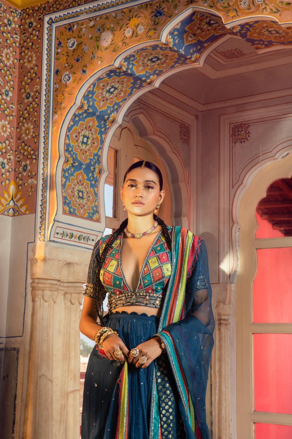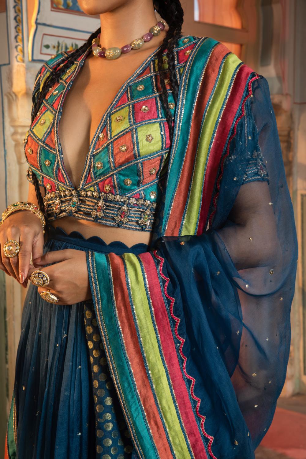 A lehenga brought to life with bold colour and artisanal detail. The ensemble features a striking blouse intricately embroidered with vibrant geometric patchwork motifs, creating a rich tapestry of texture and contrast. The flowing lehenga is subtly embellished for soft movement, while the dupatta, finished with multicolour striped borders and delicate detailing, adds a refined, graphic edge.
