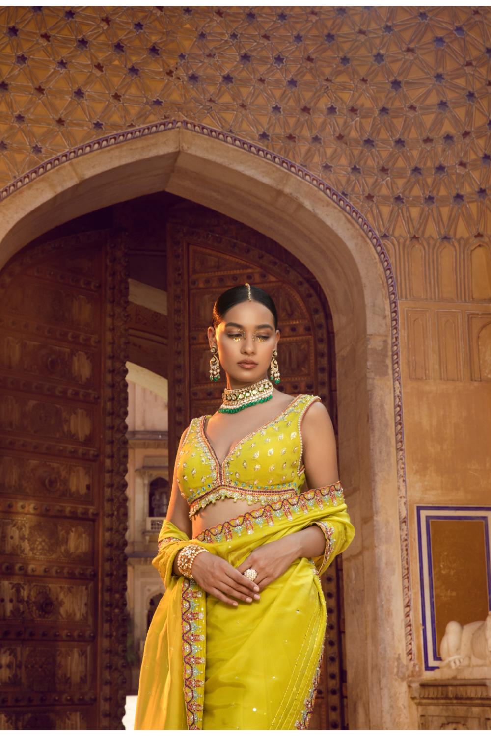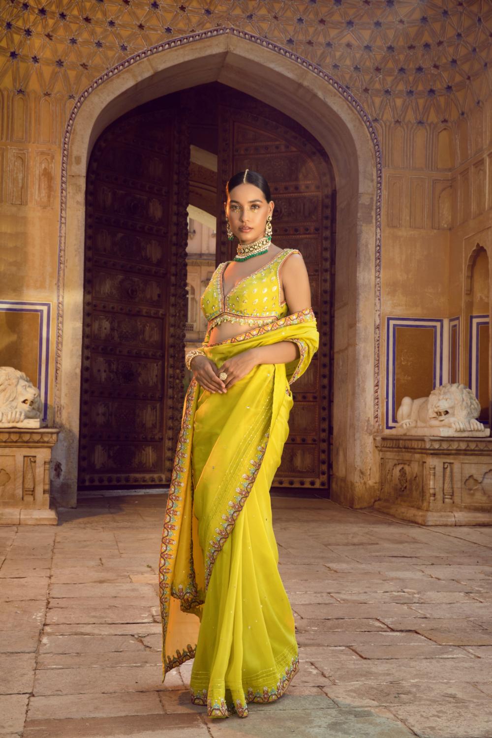 A luminous sari that blends freshness with refined craftsmanship. The fluid drape is framed with delicately embroidered borders, adding subtle definition and movement. Paired with a finely embellished blouse with pearls featuring intricate handwork, and a deep neckline