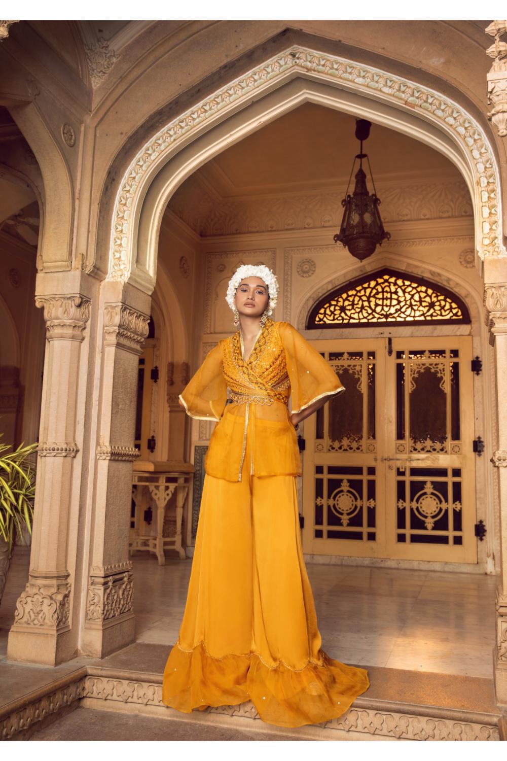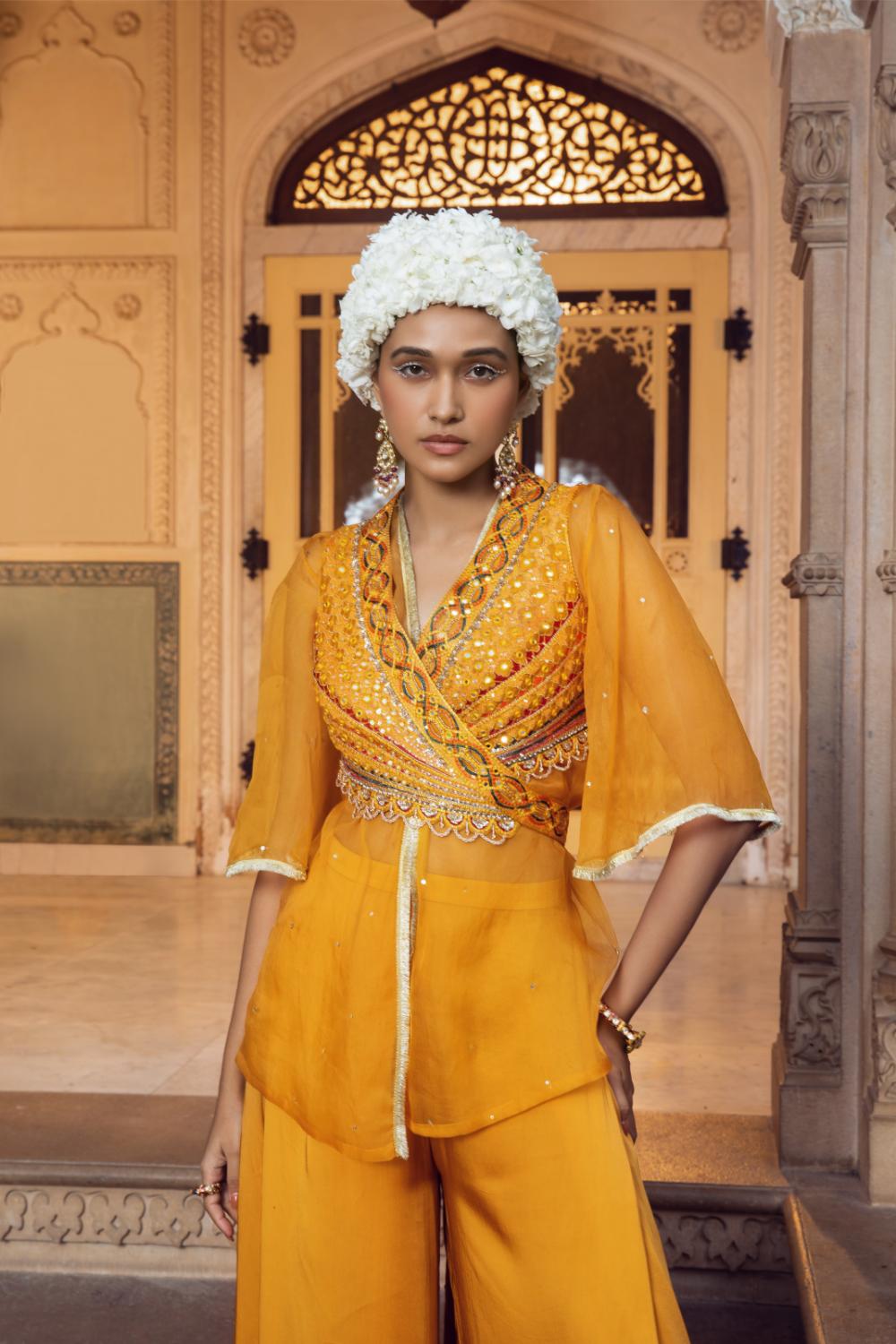 A vibrant ensemble crafted with a refined balance of structure and fluidity. The wrap-style top is intricately embellished with fine embroidery highlighted with multicolour threadwork and embellishments, layered to create depth and a softly sculpted silhouette. Sheer sleeves and delicate edging add lightness, while the flowing palazzo pants bring effortless movement and ease.