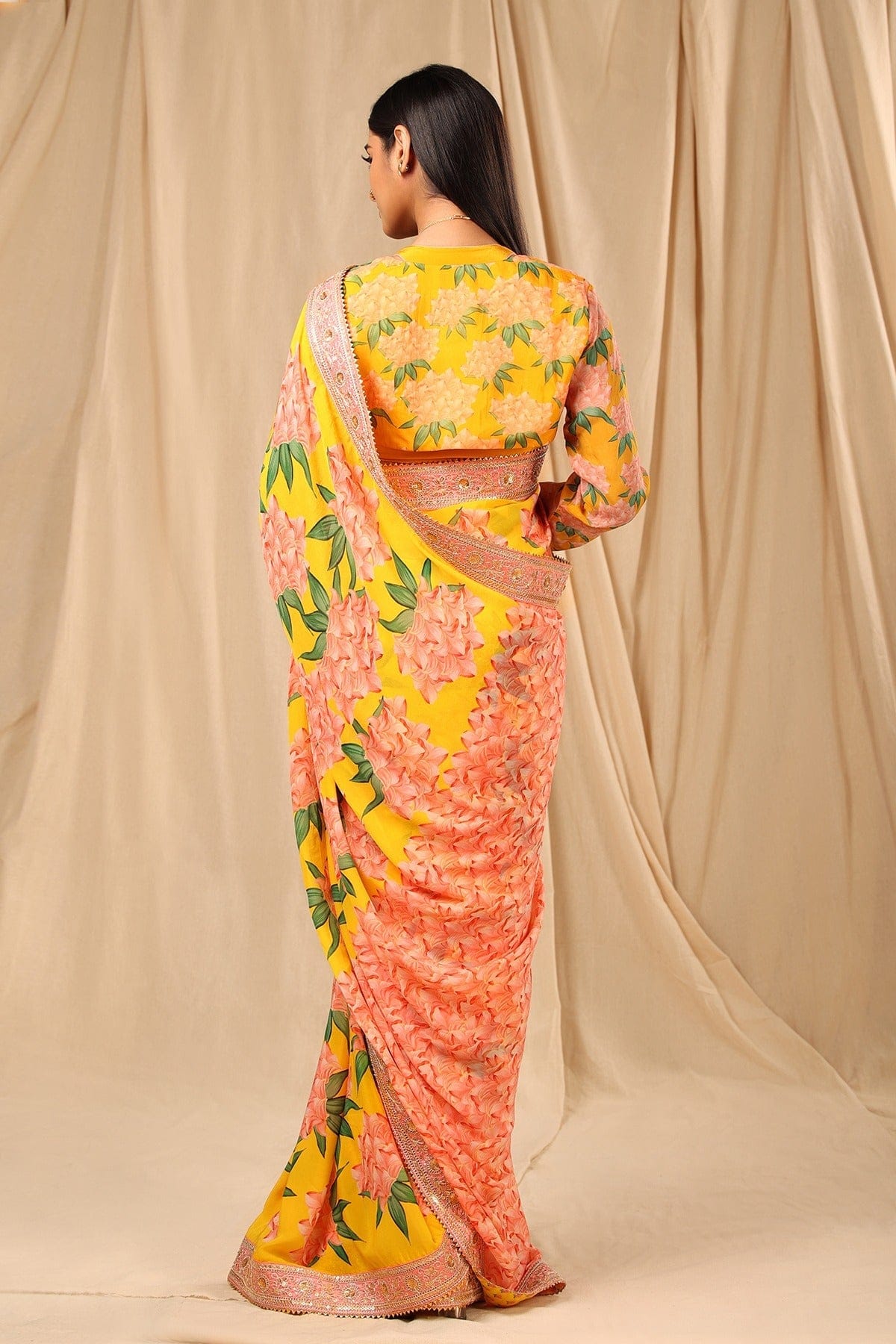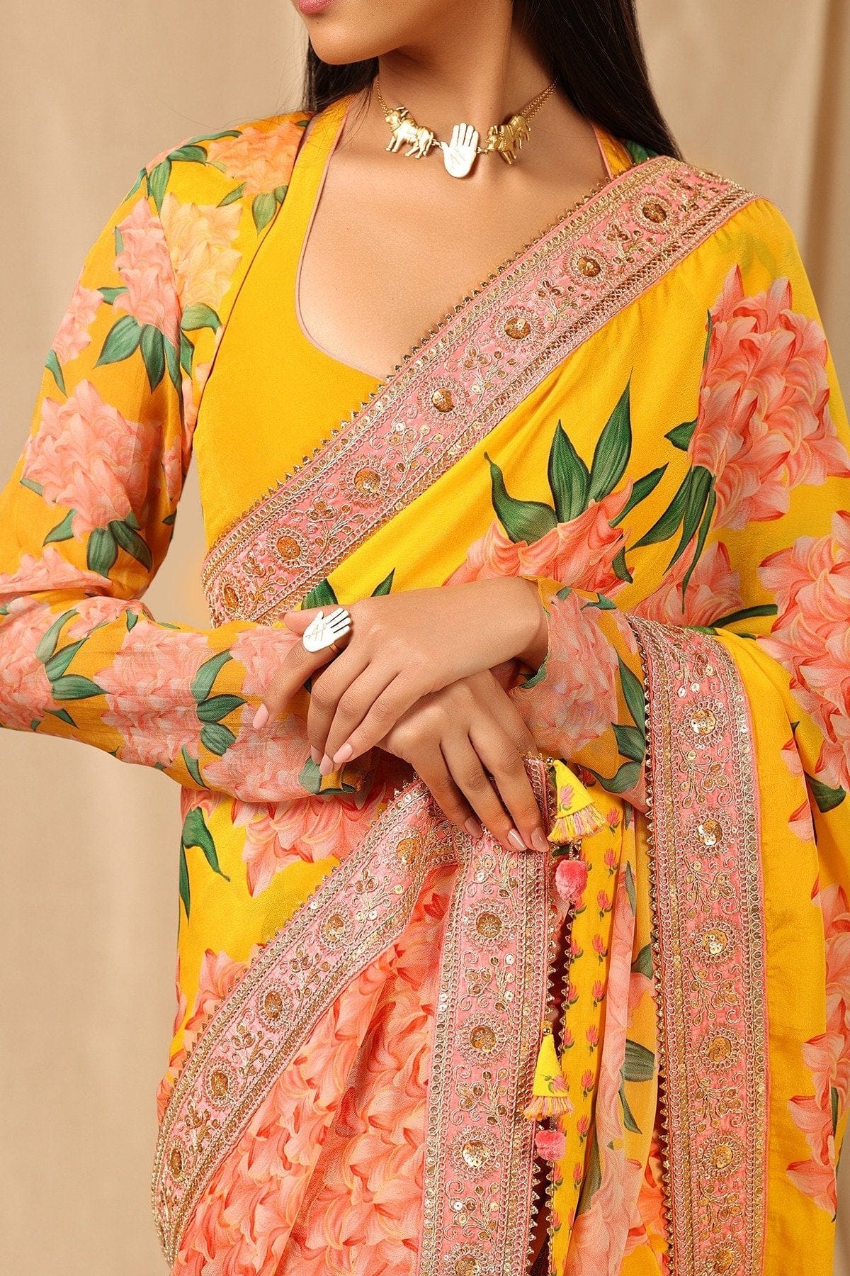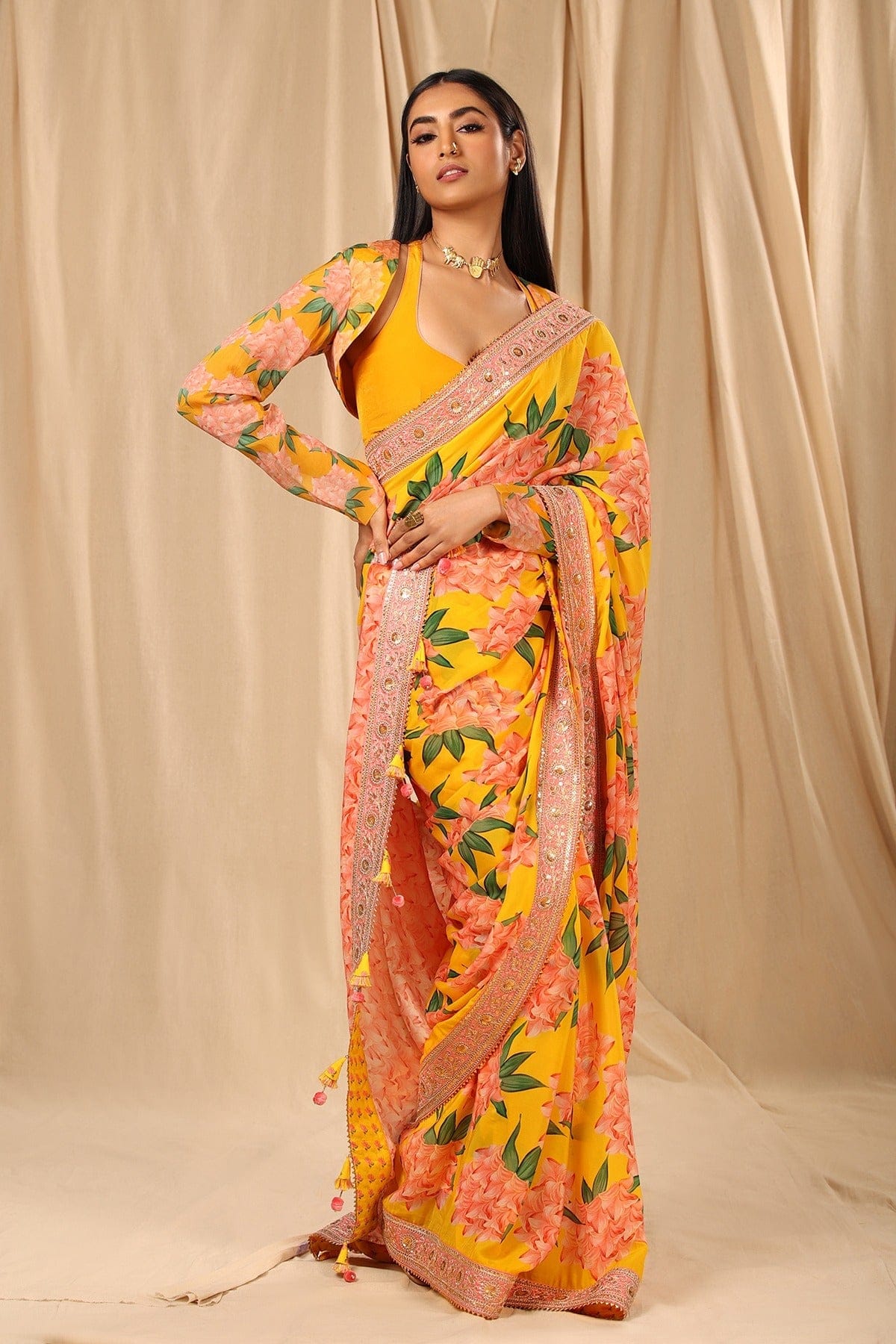 Cast a refreshing charm on the onlookers with this saree. It has a beautiful placement printed palla and is embellished with embroidered border and contrasting finish at the back. The tassel detail gives you a desi vibe.