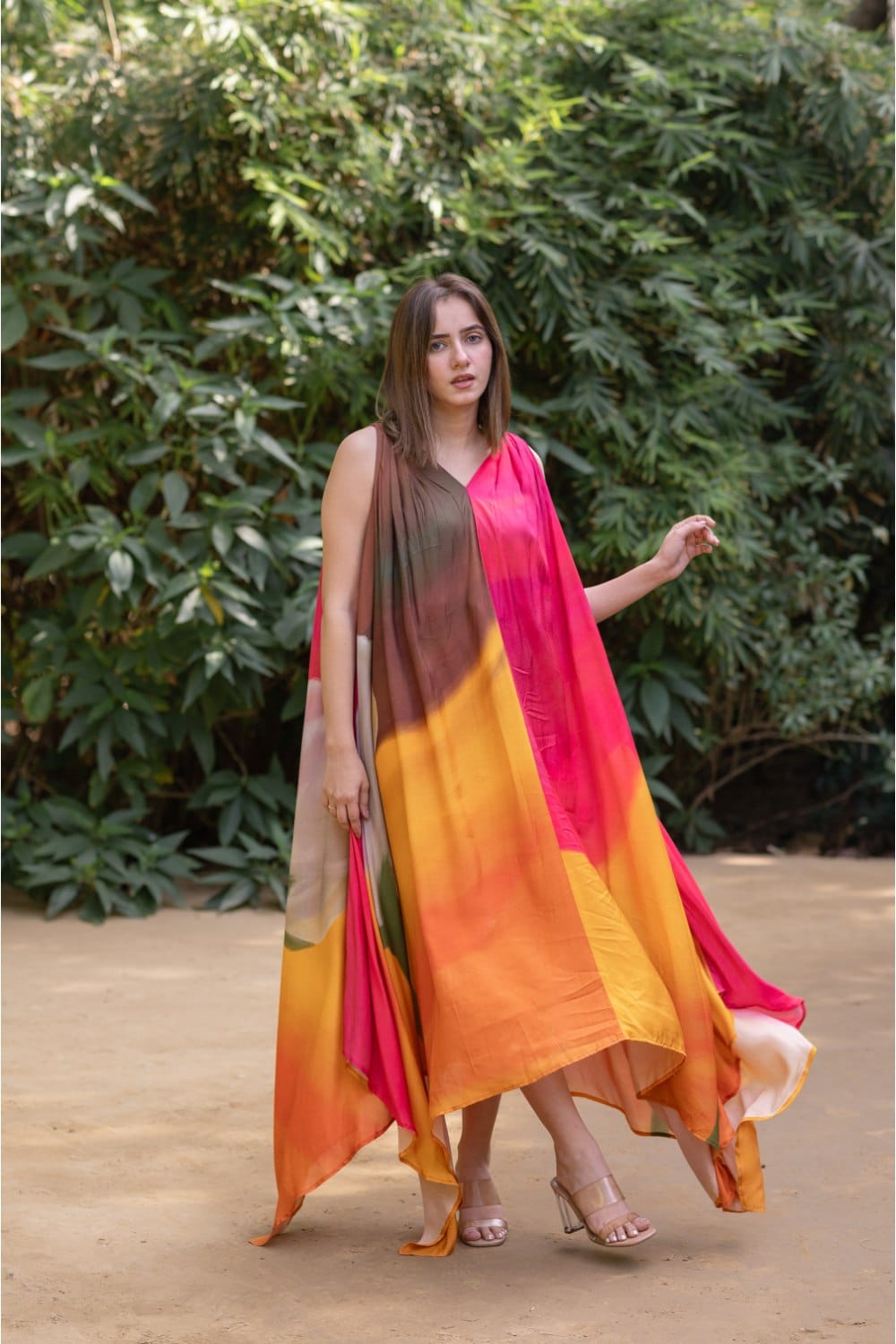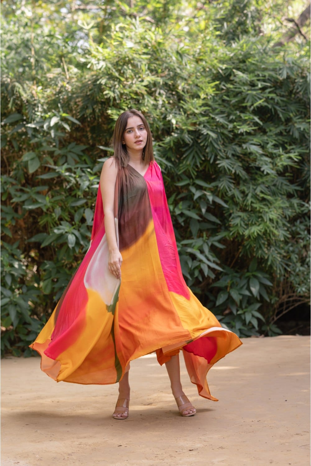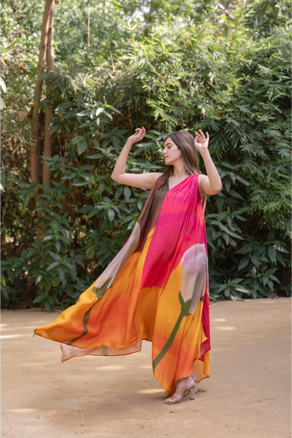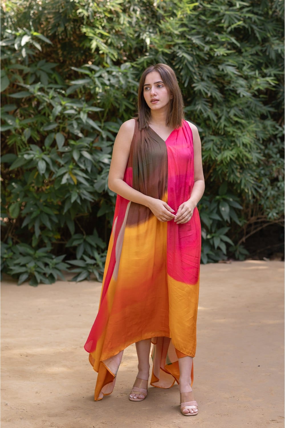 1. THIS SET INCLUDES DRESS ONLY 2. ORANGE COLOR DRESS . A.NECKLINE -V-NEECK B.SLEEVES - SLEEVELESS