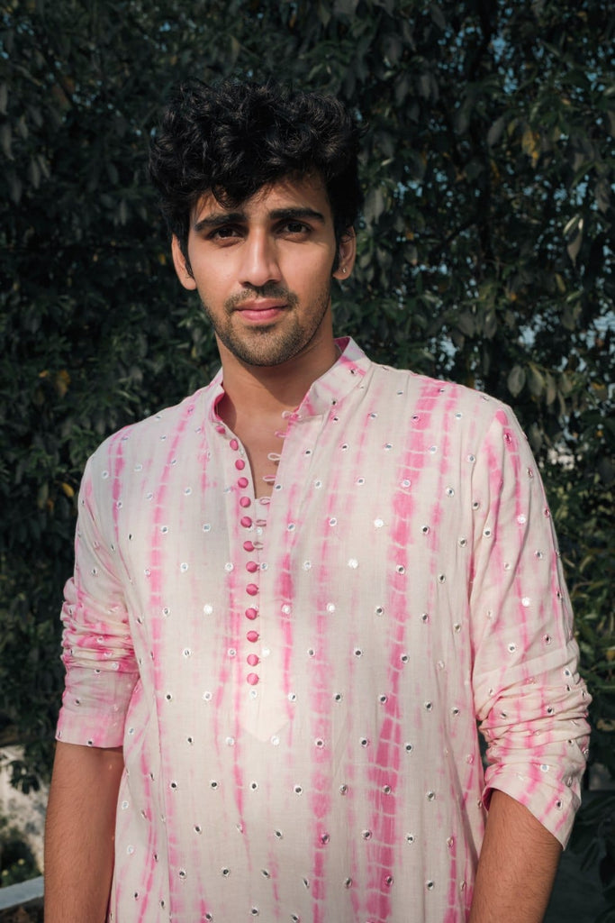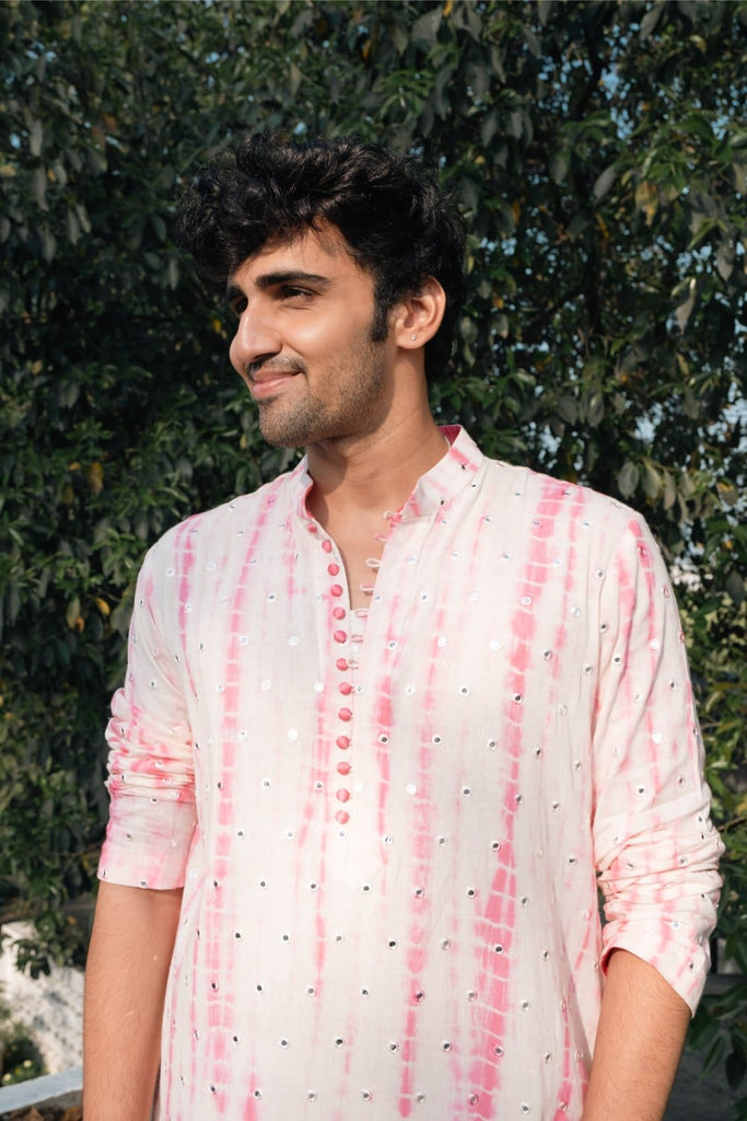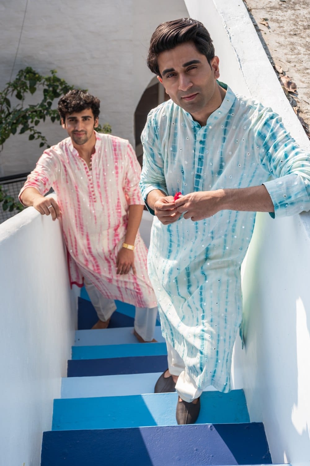 Crafted lightness. Summer in motion. Hand-dyed in soft waves of blue using the Japanese Shibori technique, this kurta is finished with delicate mirror work that adds a subtle sparkle to every fold. Lightweight, breathable, and effortlessly elegant — it’s perfect for summer festivities, sunlit celebrations. Each piece carries unique dye variations, making every kurta truly one of one. Includes: • Shibori Dyed Kurta with Mirror Work • Straight Pants