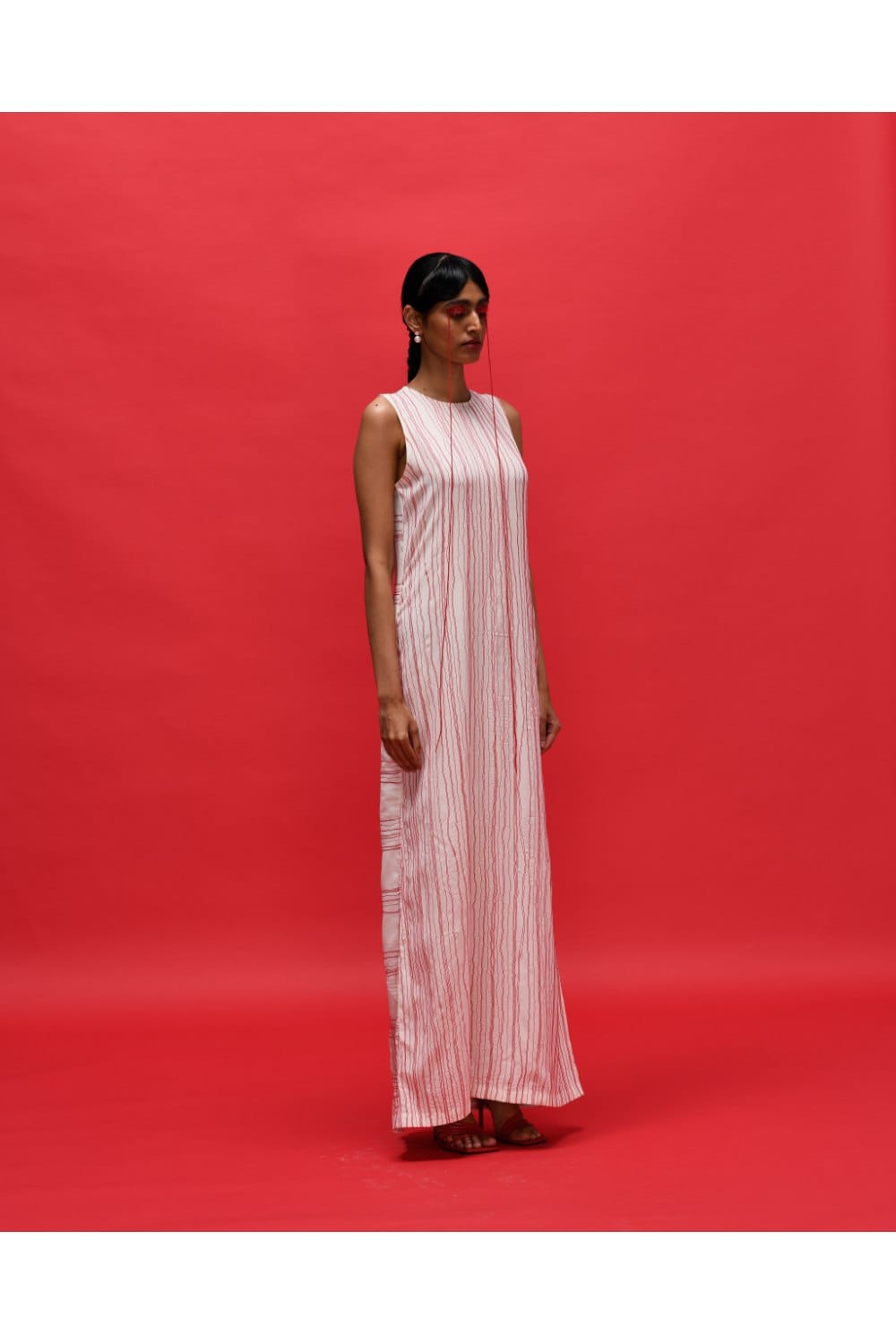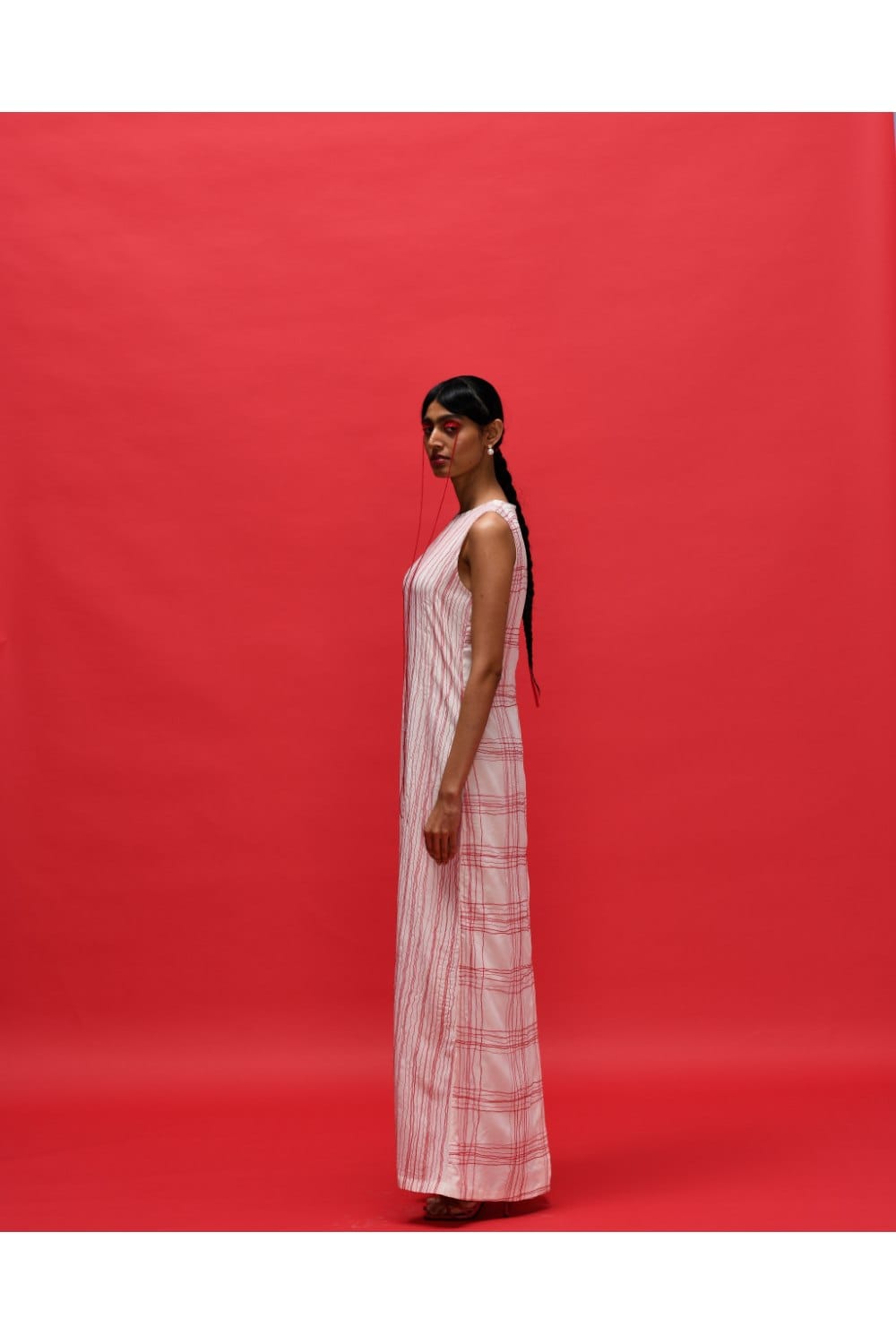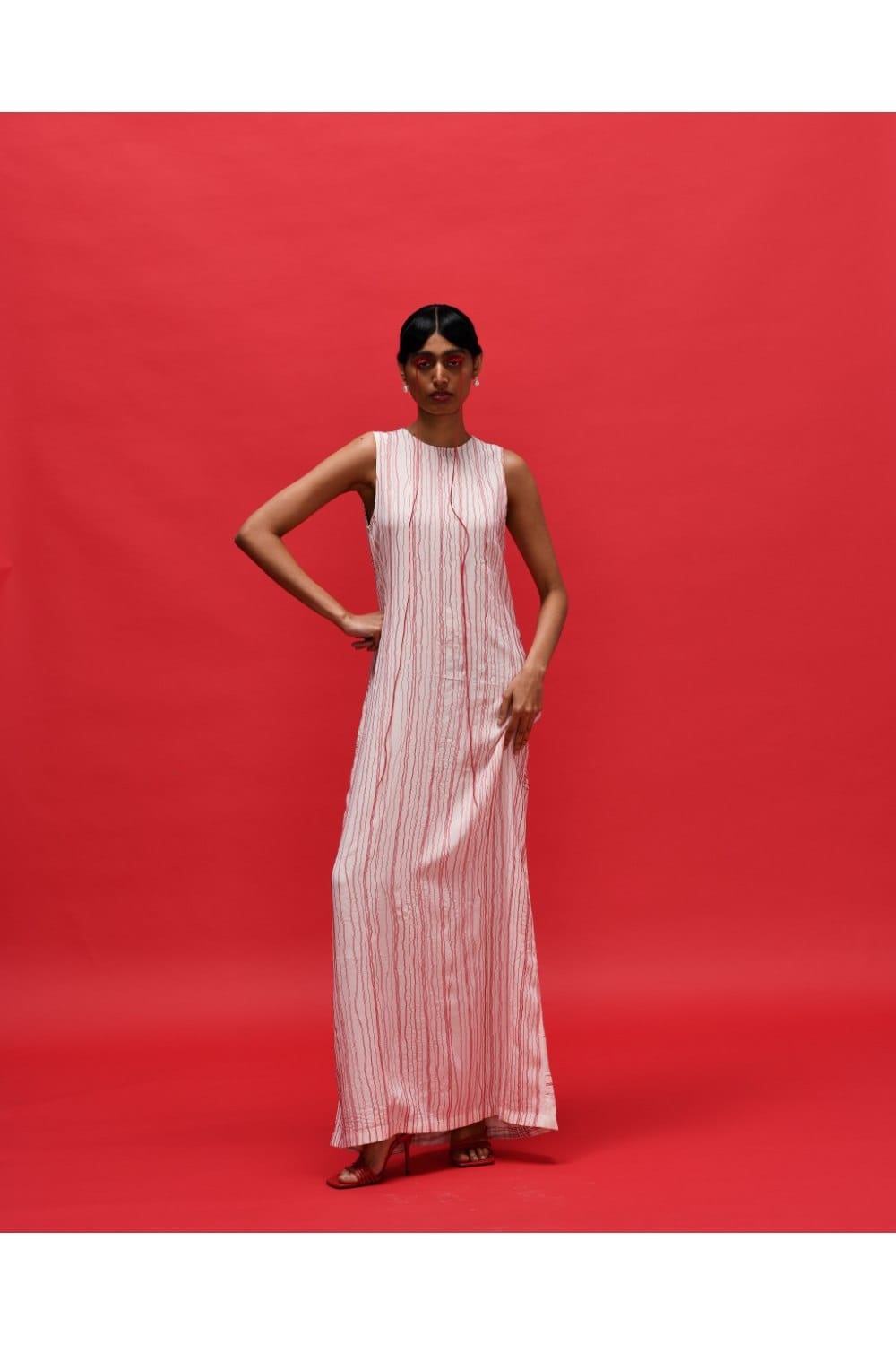 A SLEEVELESS FULL LENGTH DRESS WITH HAND EMBROIDERED ASYMMETRIC LINES ON THE FRONT AND A GRID OF ASYMMTRIC LINES AT THE BACK. IT COMES WITH A BACK CLOSURE AND SLIT.