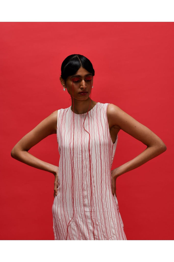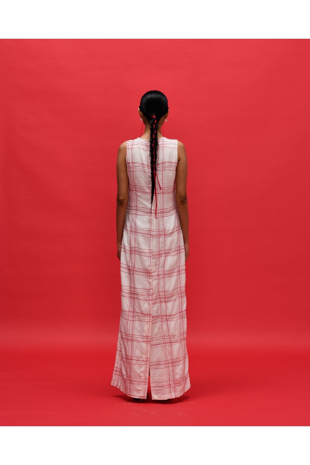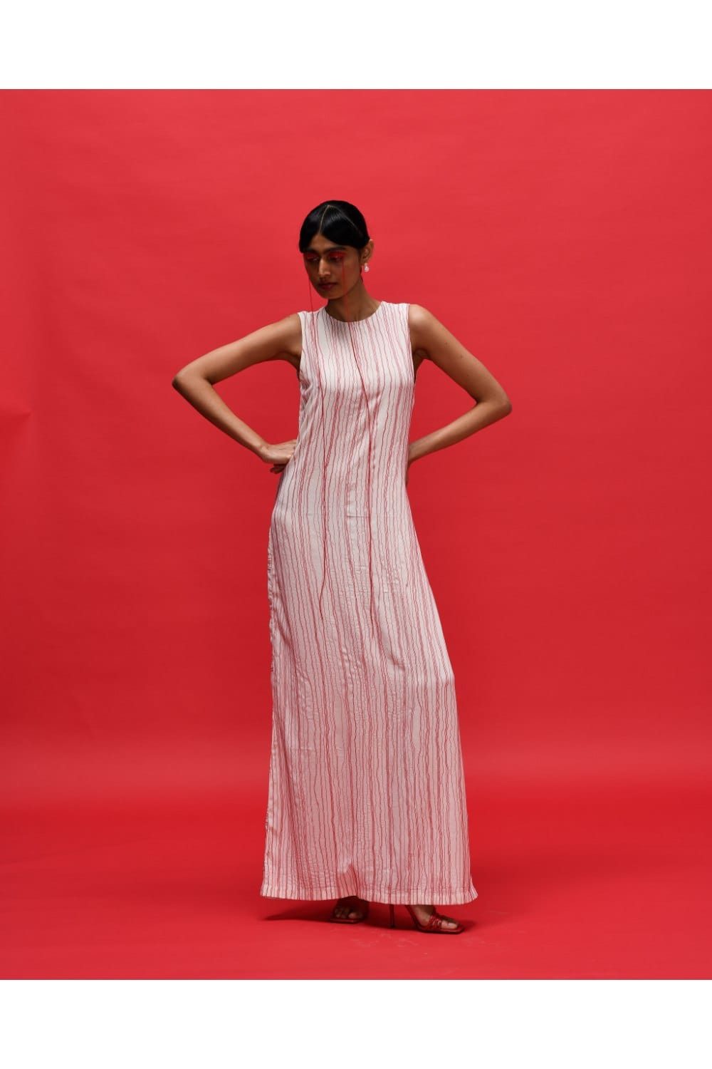 A SLEEVELESS FULL LENGTH DRESS WITH HAND EMBROIDERED ASYMMETRIC LINES ON THE FRONT AND A GRID OF ASYMMTRIC LINES AT THE BACK. IT COMES WITH A BACK CLOSURE AND SLIT.