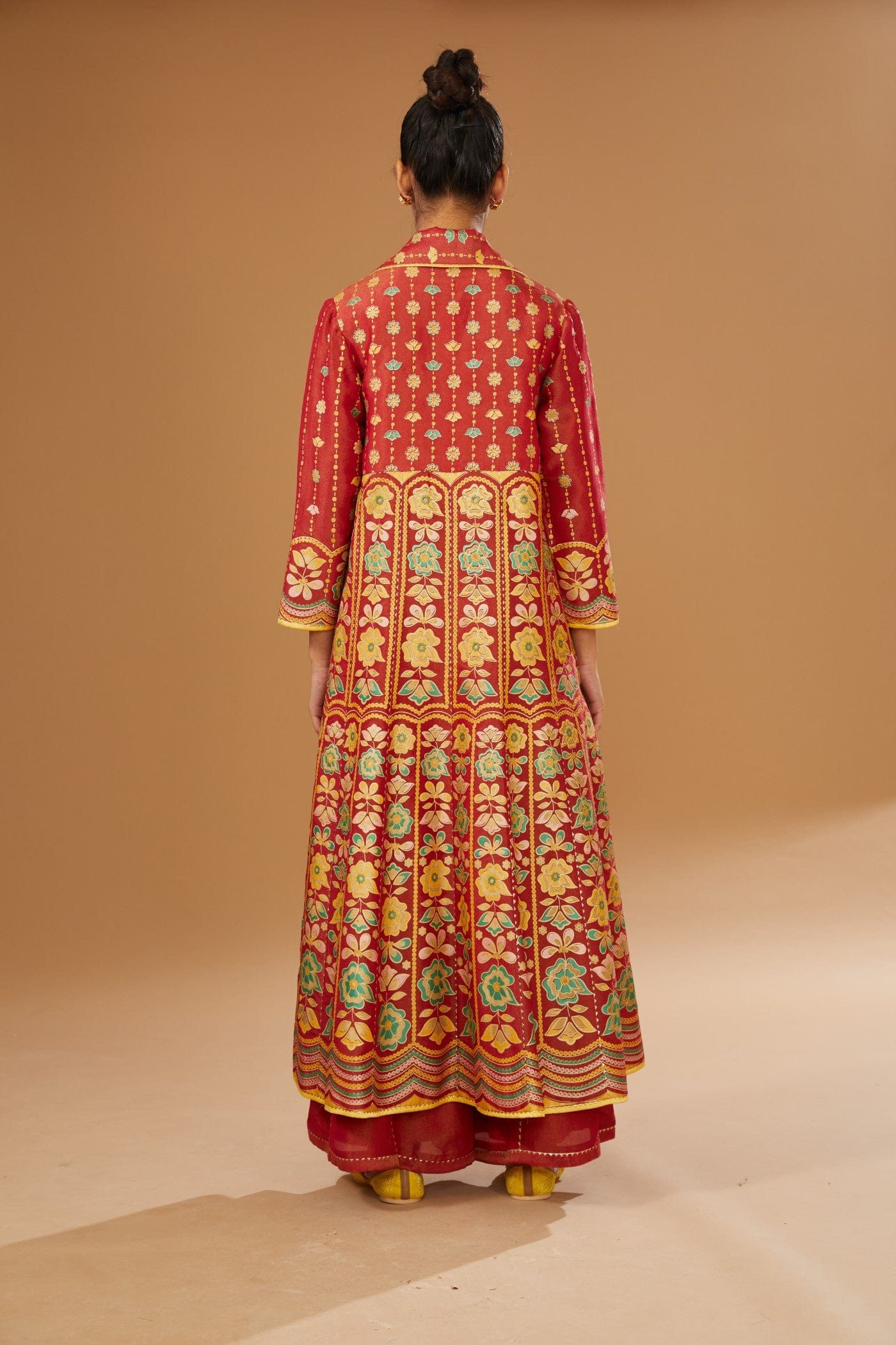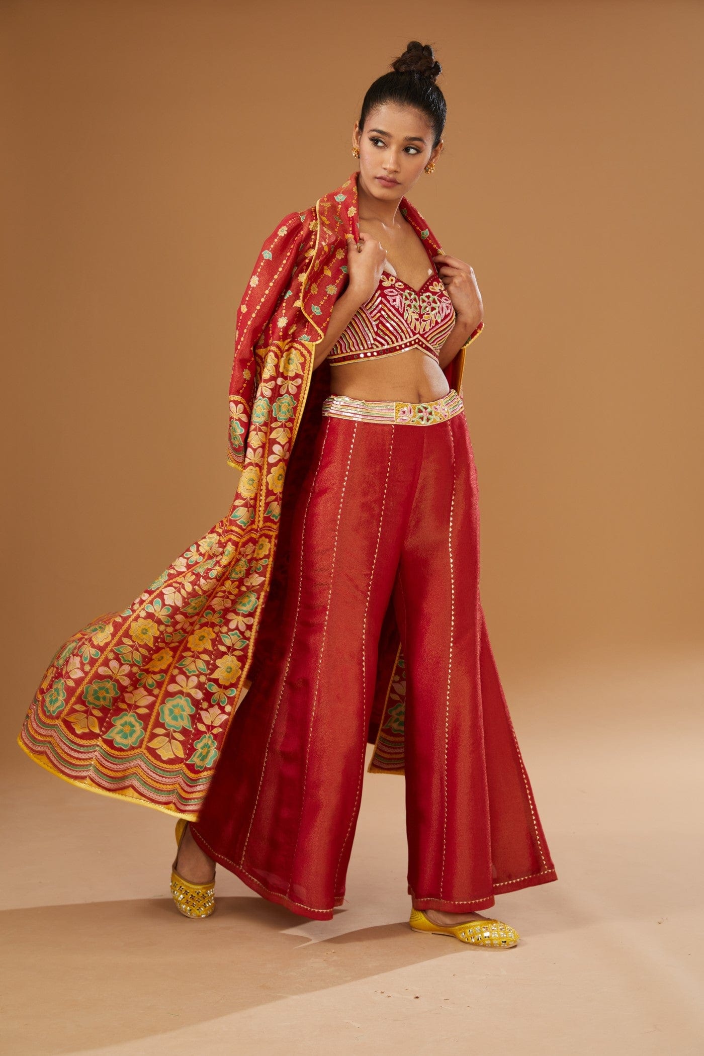 Featuring a red jacket set comprising of floral hand printed anarkali jacket, hand embroidered rawsilk bustier and a plazzo, embellished with a bling of mirrors & sequins.