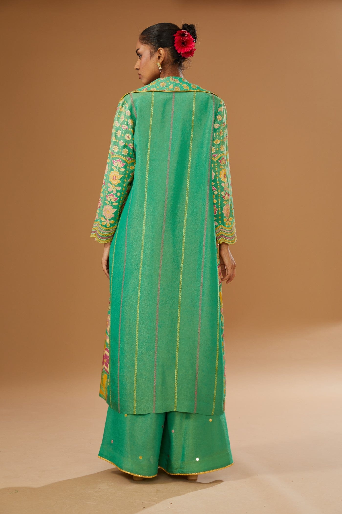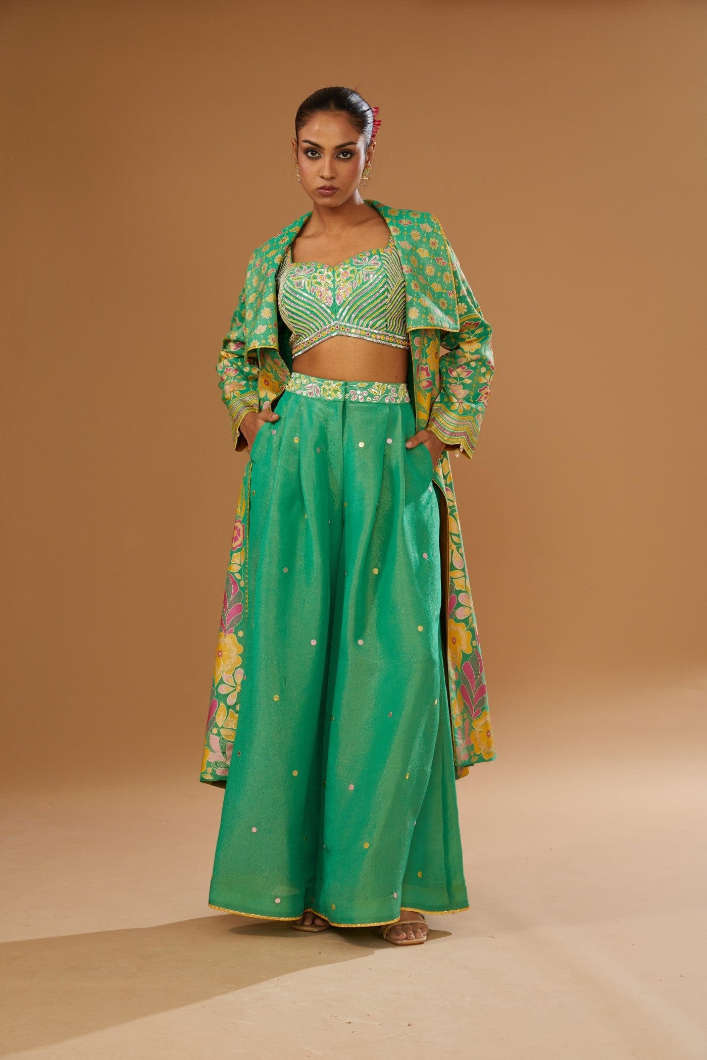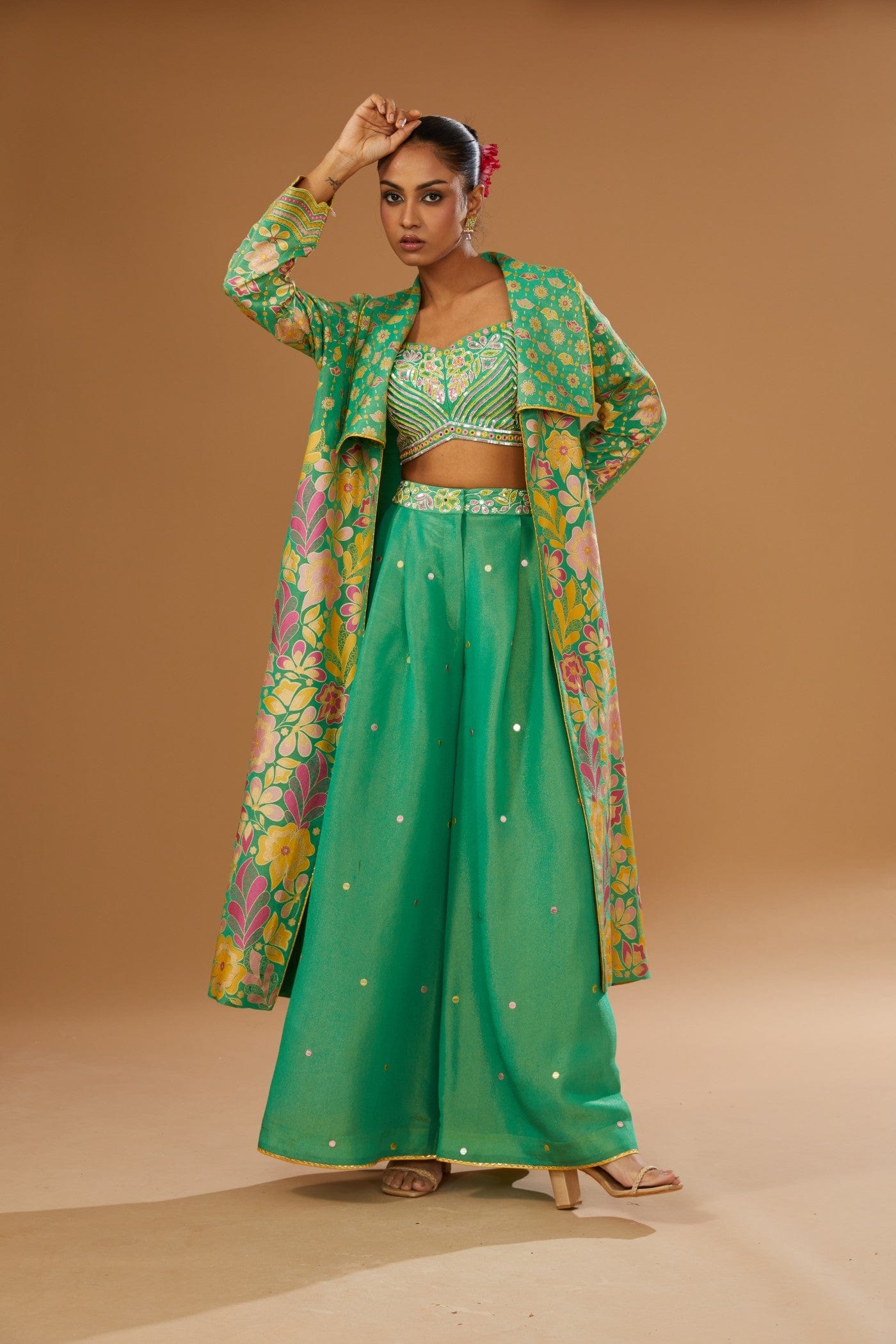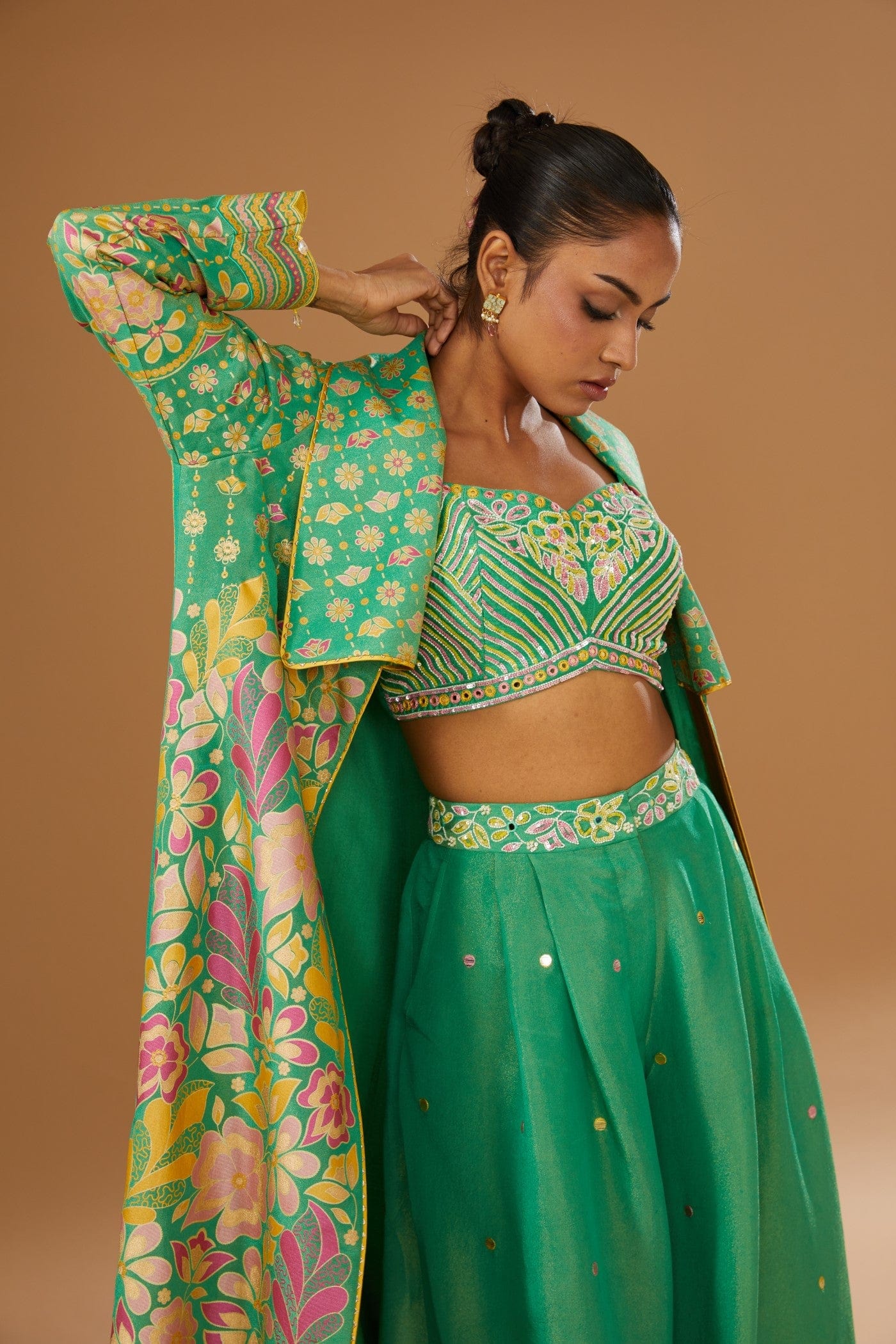 Featuring a green jacket set comprising of floral hand printed anarkali jacket, hand embroidered rawsilk bustier and a plazzo, embellished with a bling of mirrors & sequins.