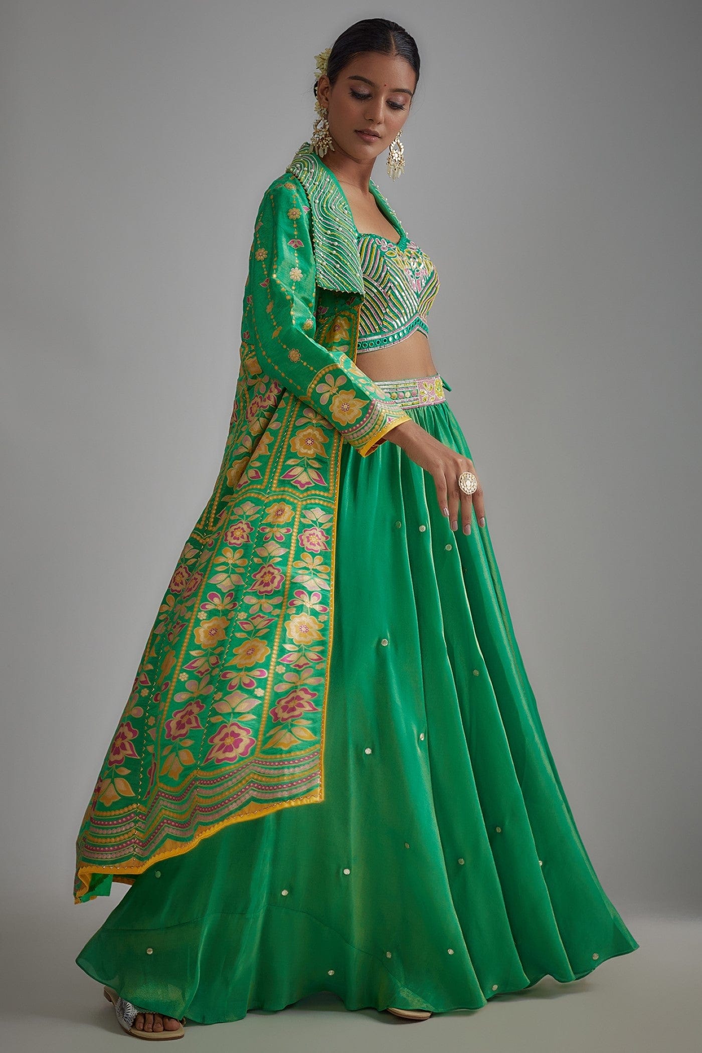 Green Silk Zari Embellished & Printed Jacket Lehenga Set