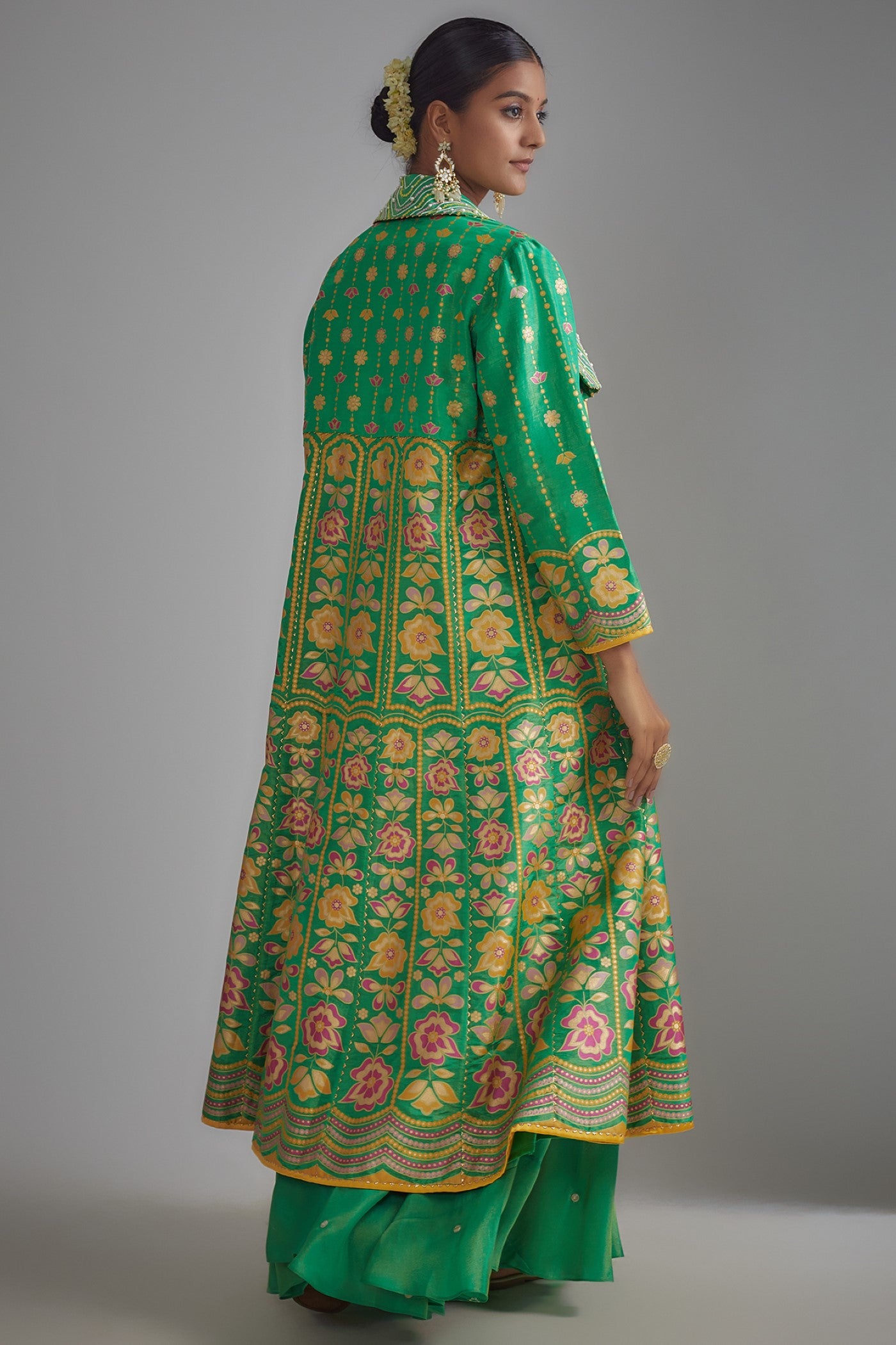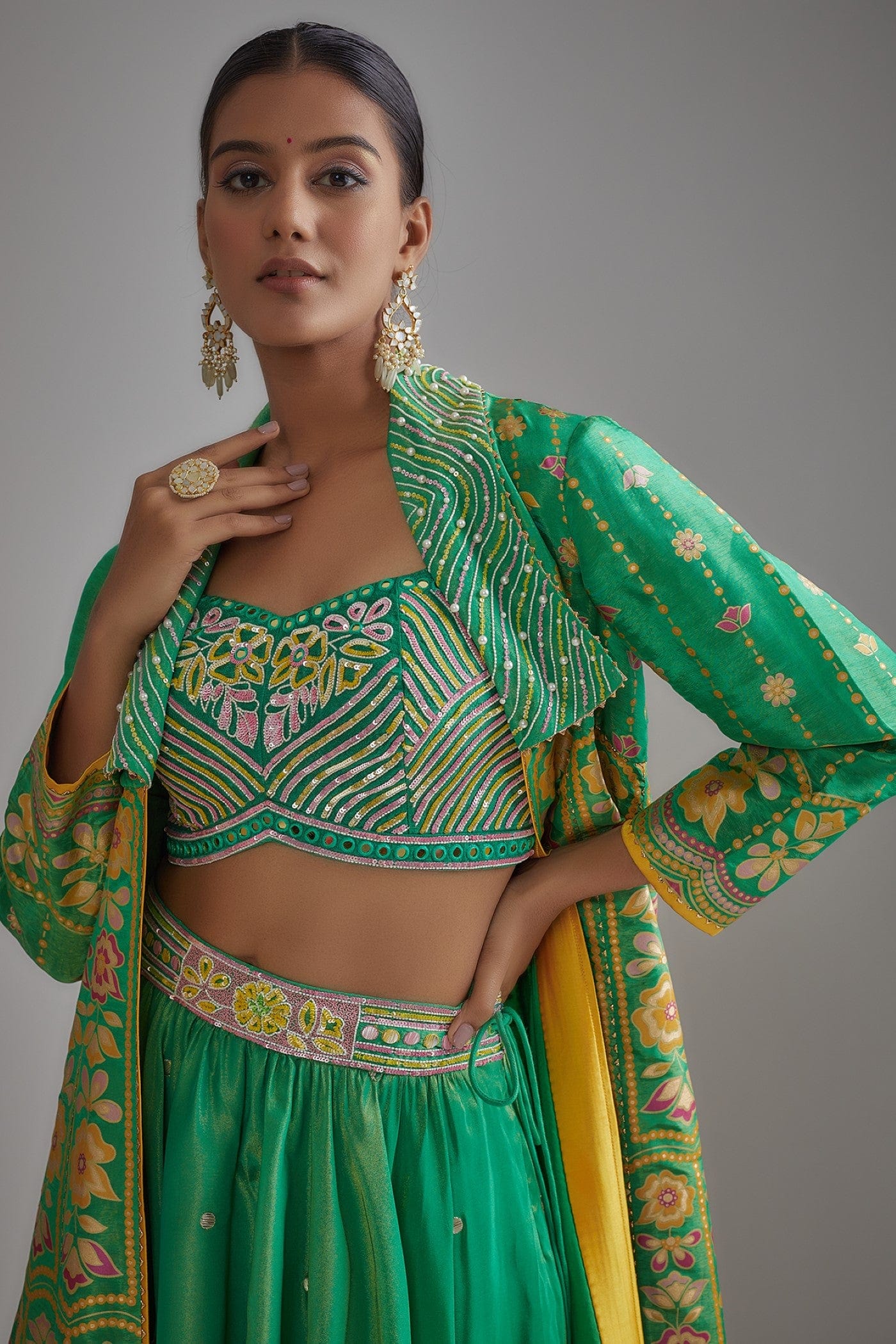 Featuring a green jacket in silk zari base with floral hand print. It is paired with a matching raw silk hand embroidered bustier and skirt having mirror and sequins embellishments.