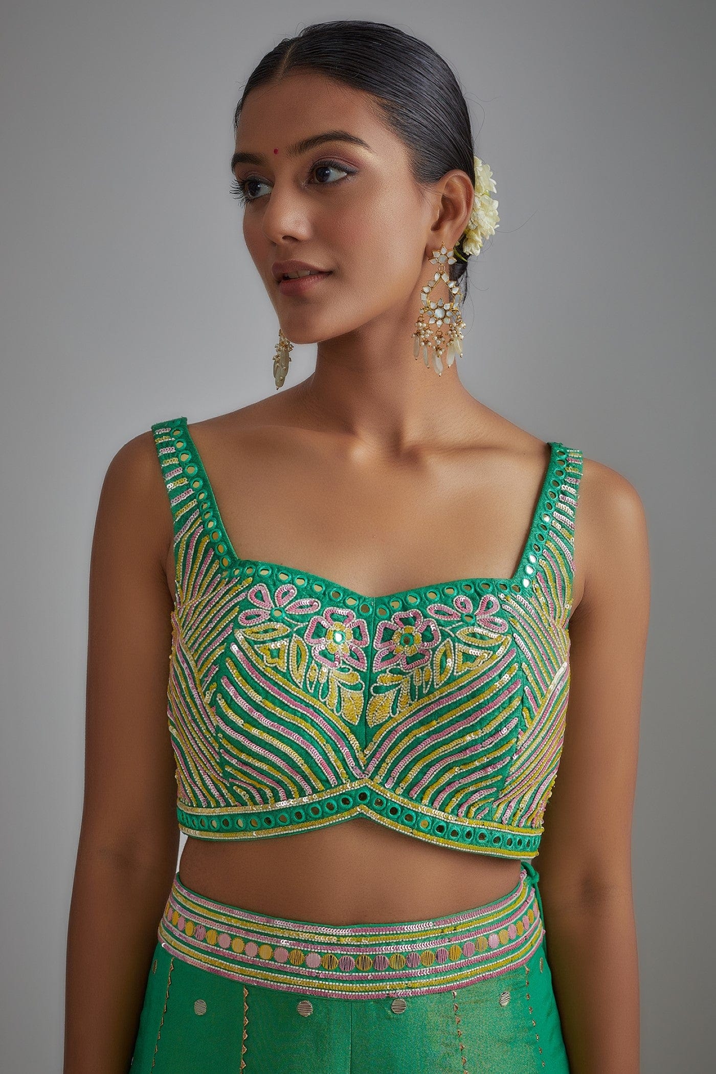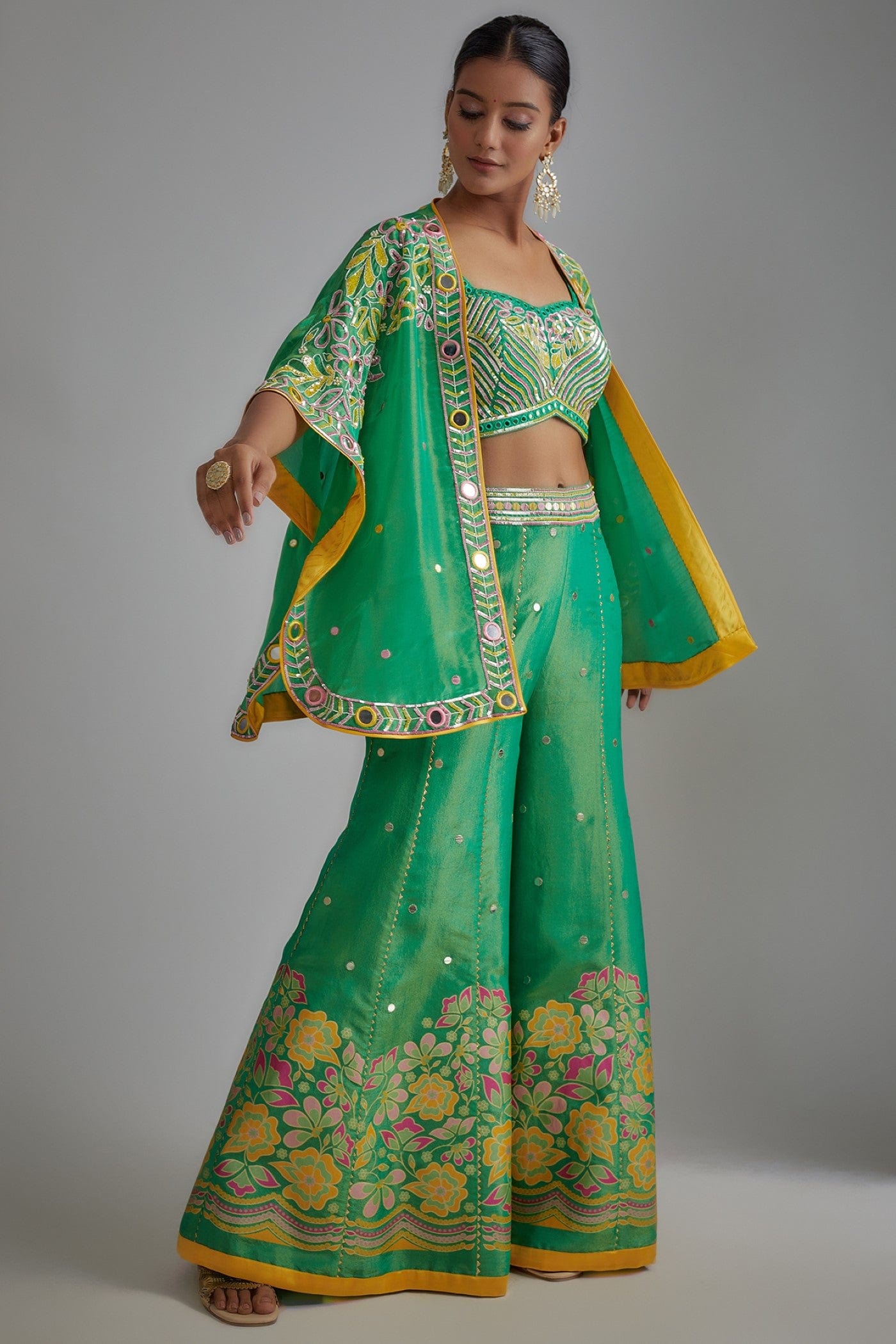 Featuring a green plazzo cum sharara set in silk zari base comprising of floral hand printed plazzo and hand embroidered cape and raw silk bustier embellished with a bling of mirrors & sequins.