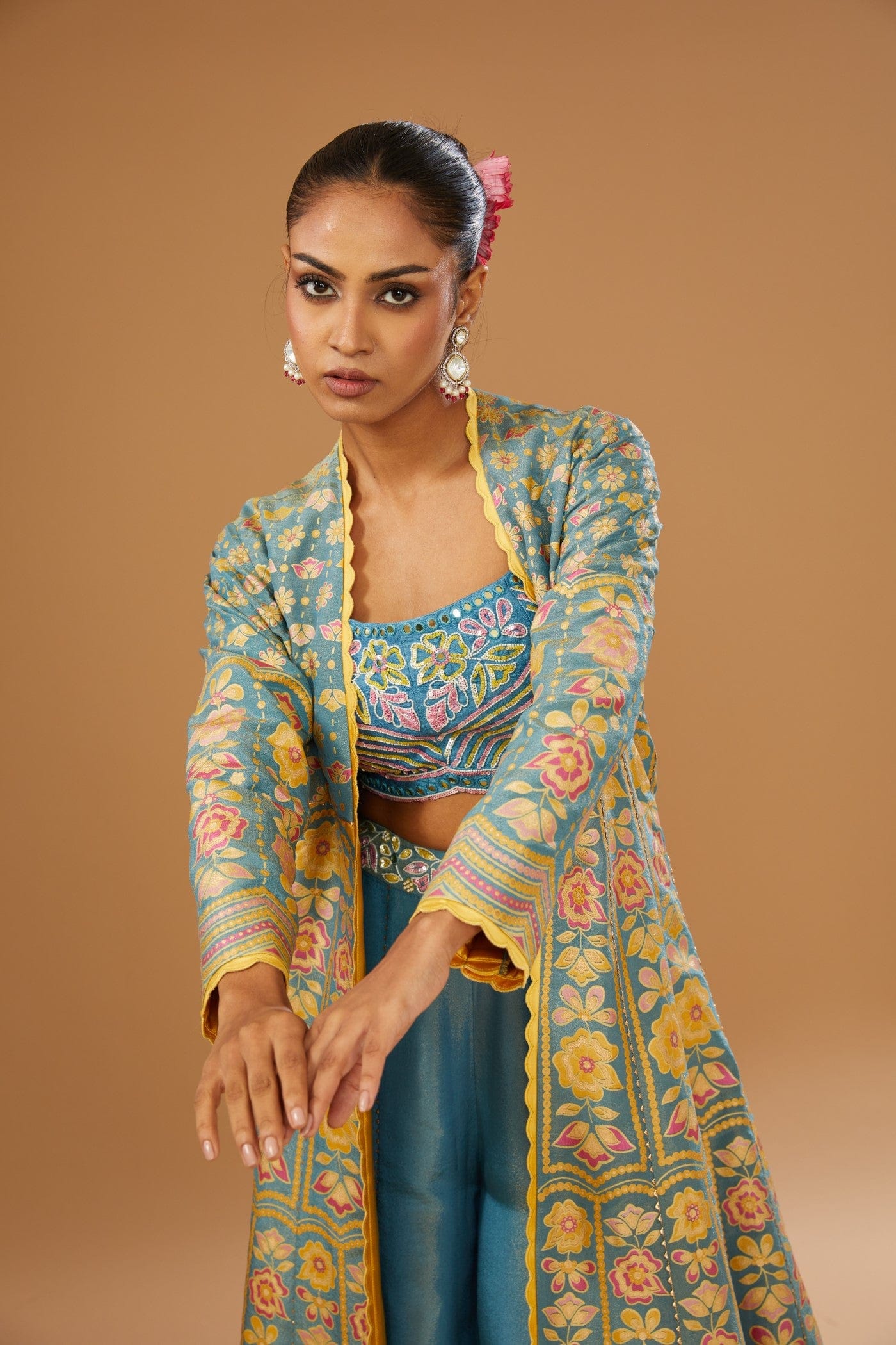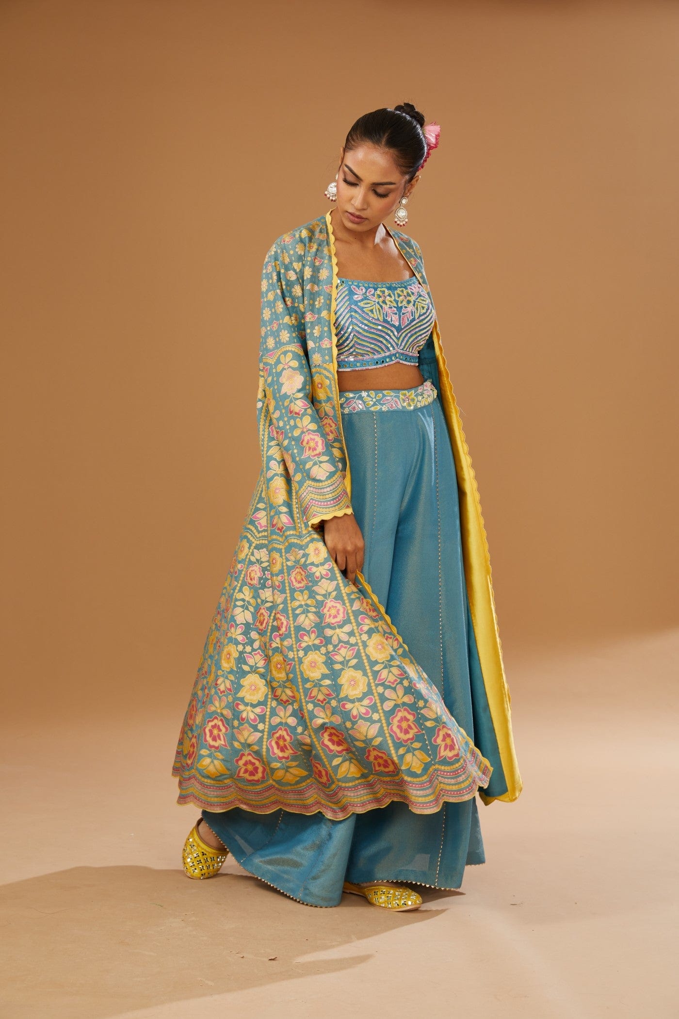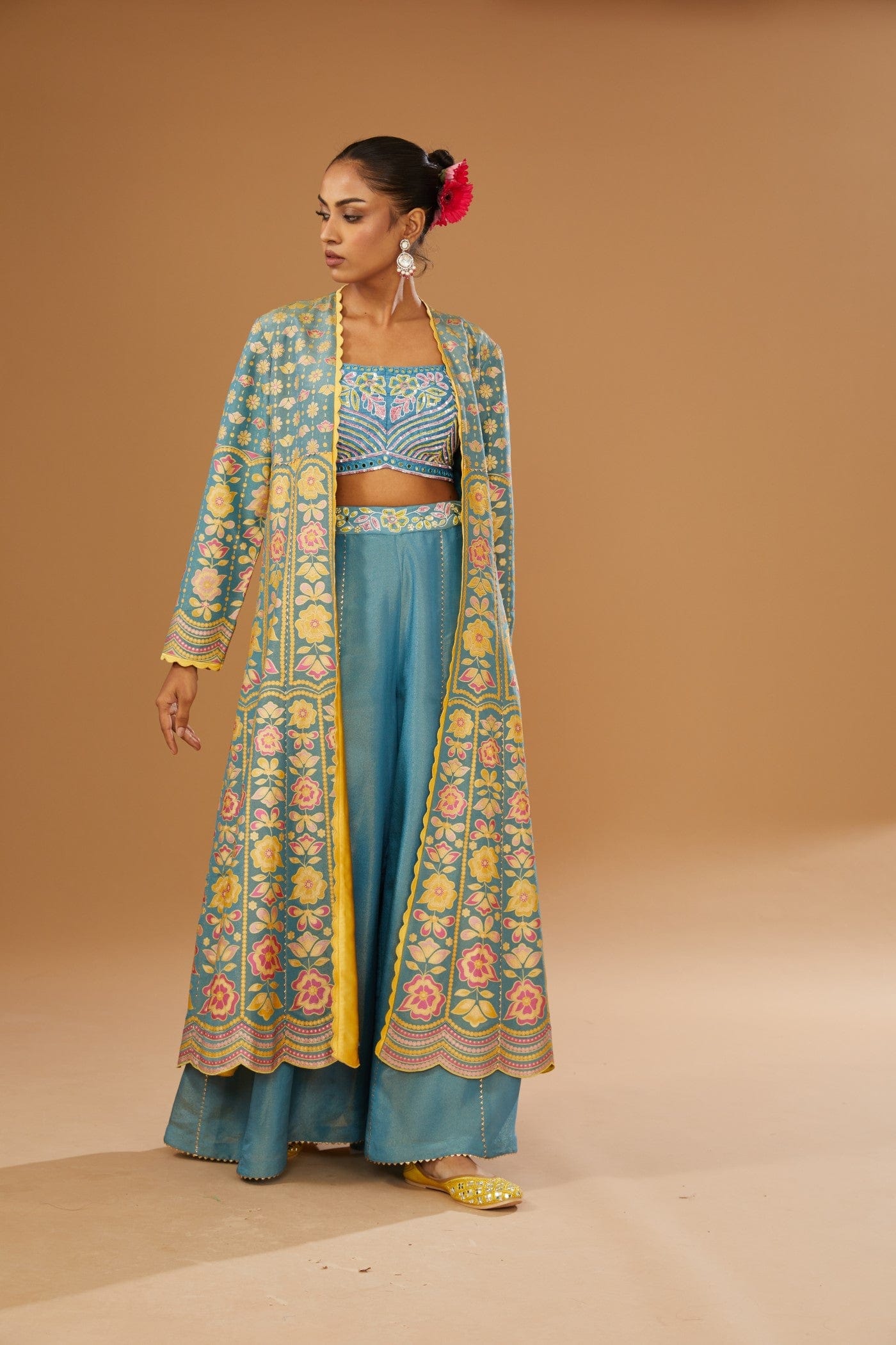 Featuring a blue jacket set comprising of floral hand printed anarkali jacket, hand embroidered rawsilk bustier and a plazzo, embellished with a bling of mirrors & sequins.