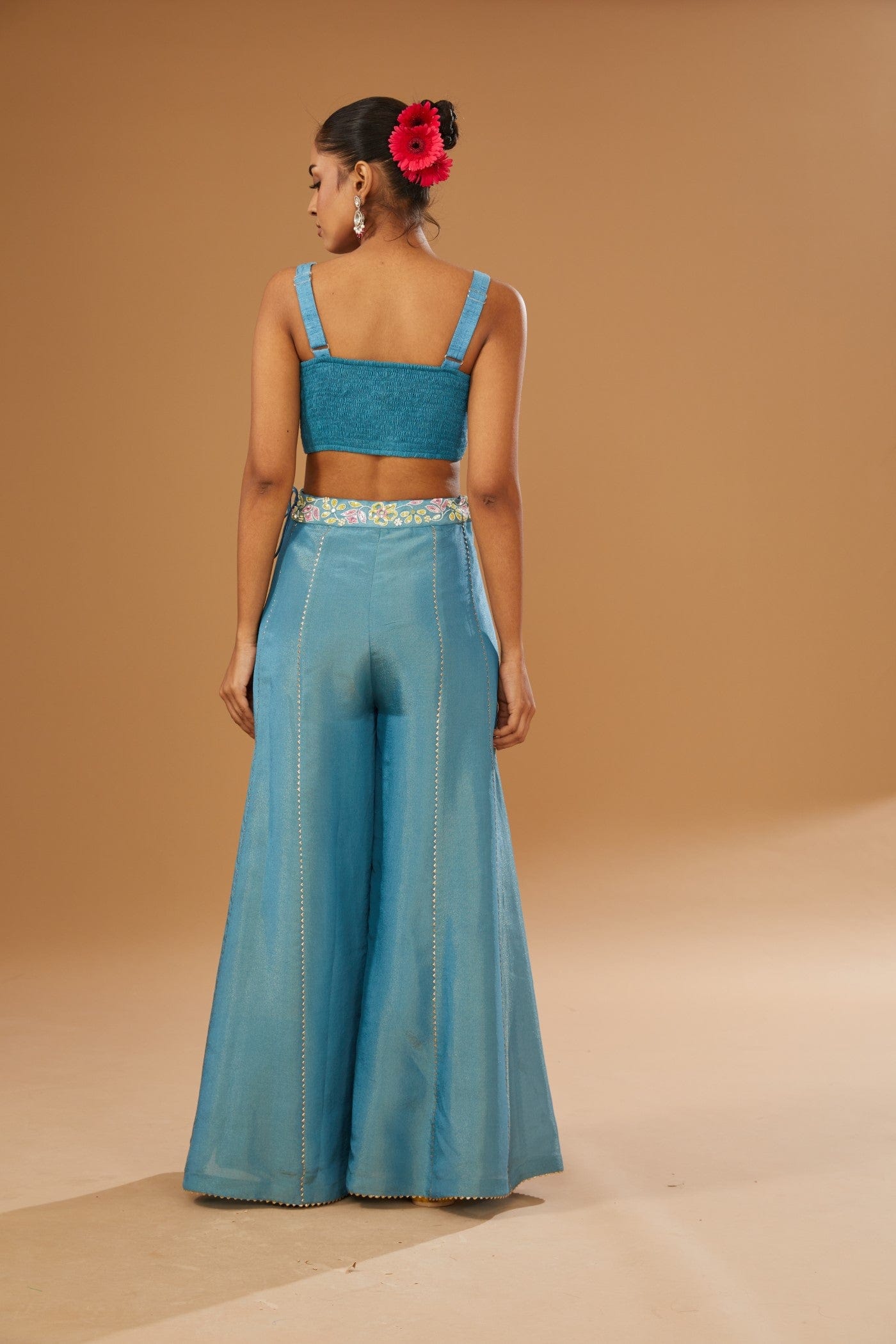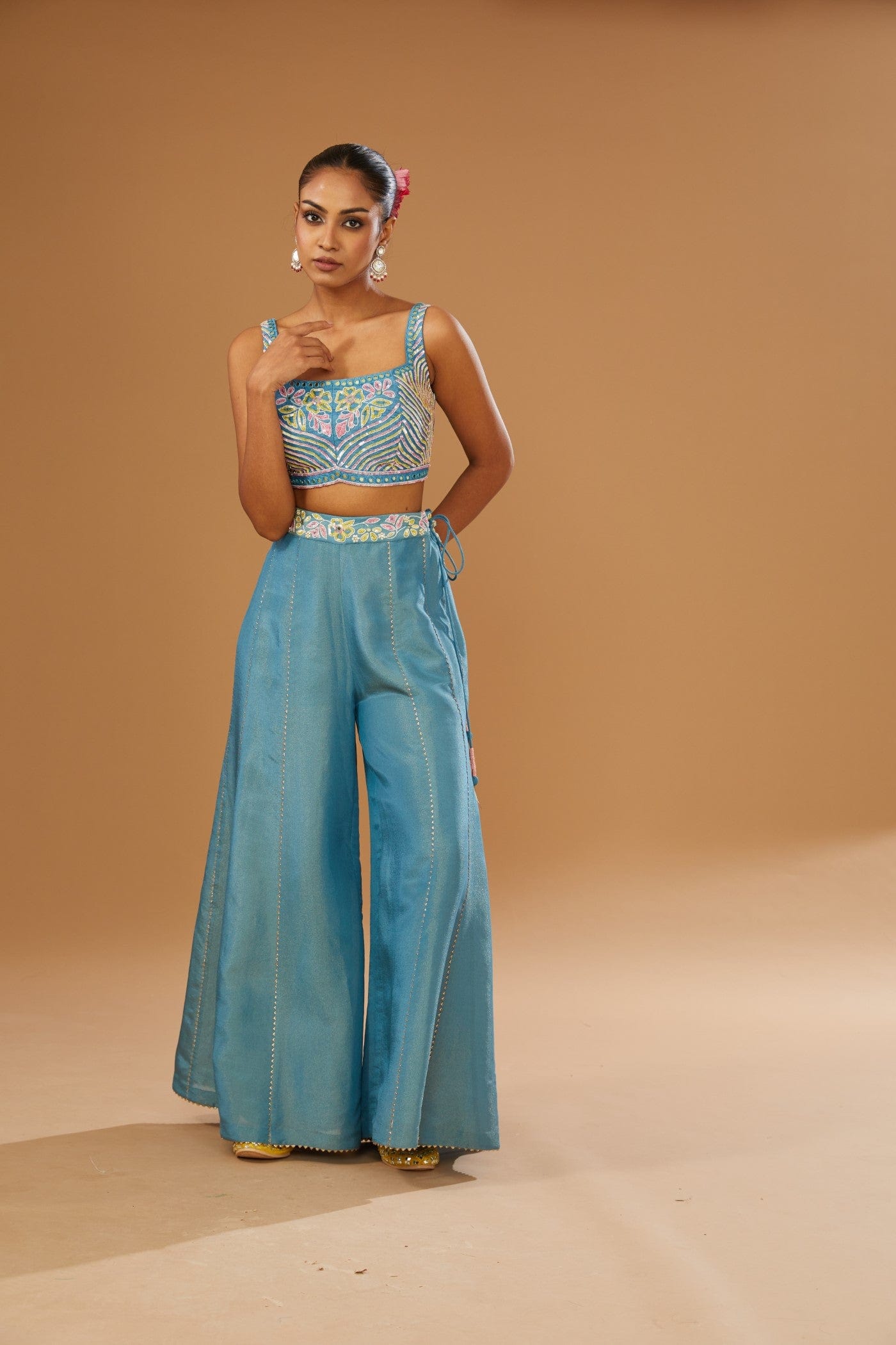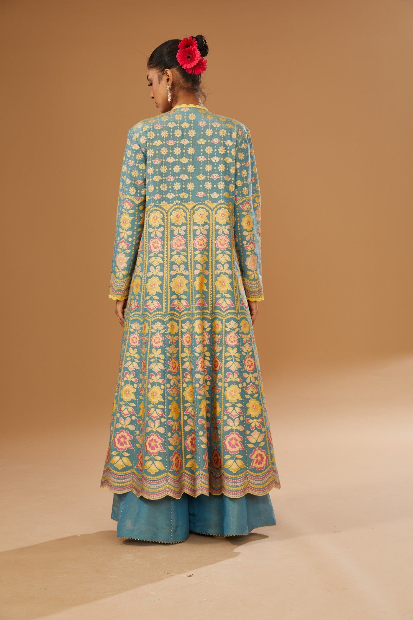 Featuring a blue jacket set comprising of floral hand printed anarkali jacket, hand embroidered rawsilk bustier and a plazzo, embellished with a bling of mirrors & sequins.