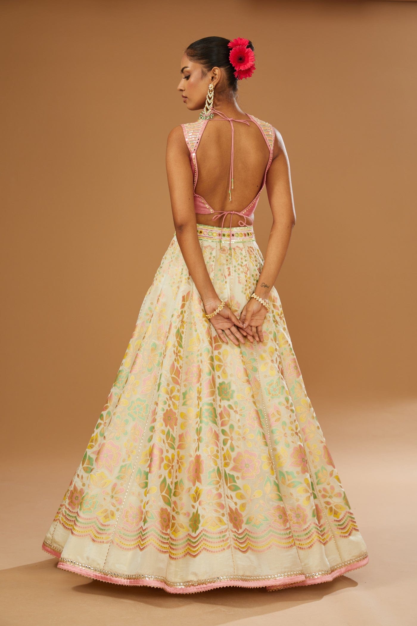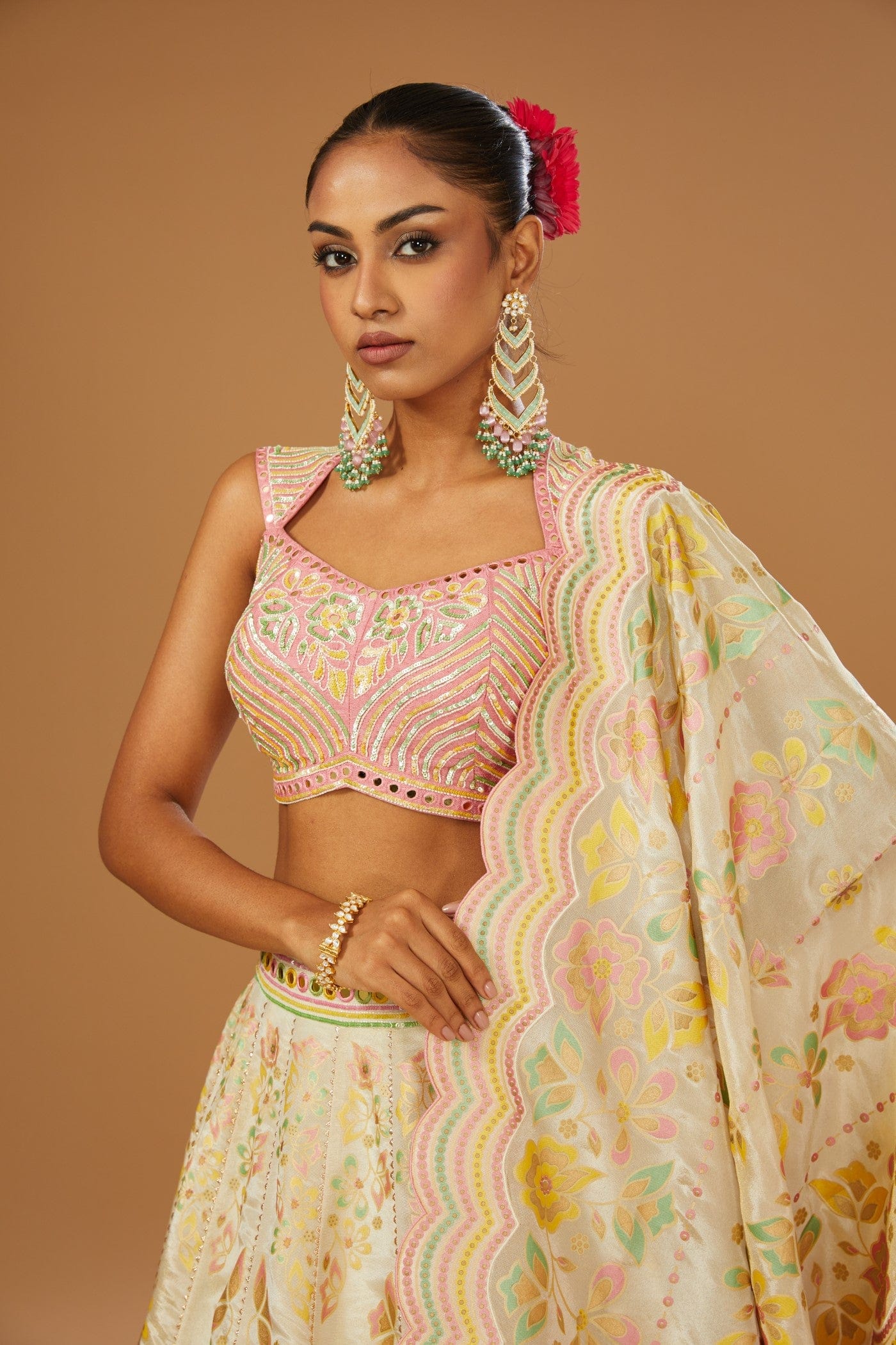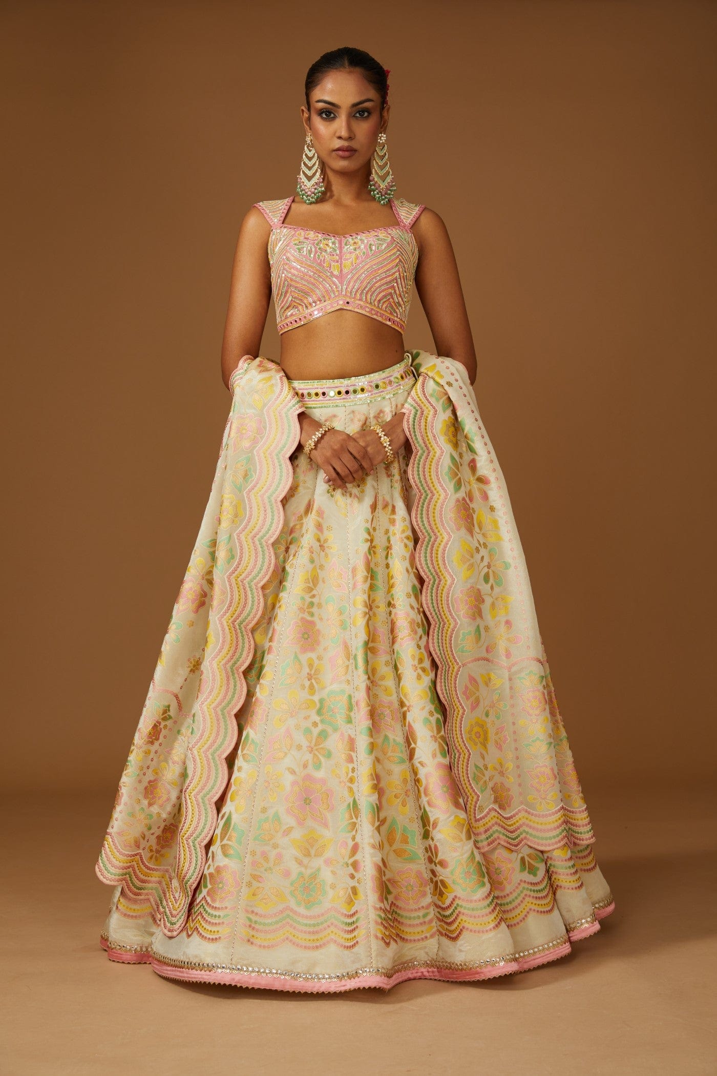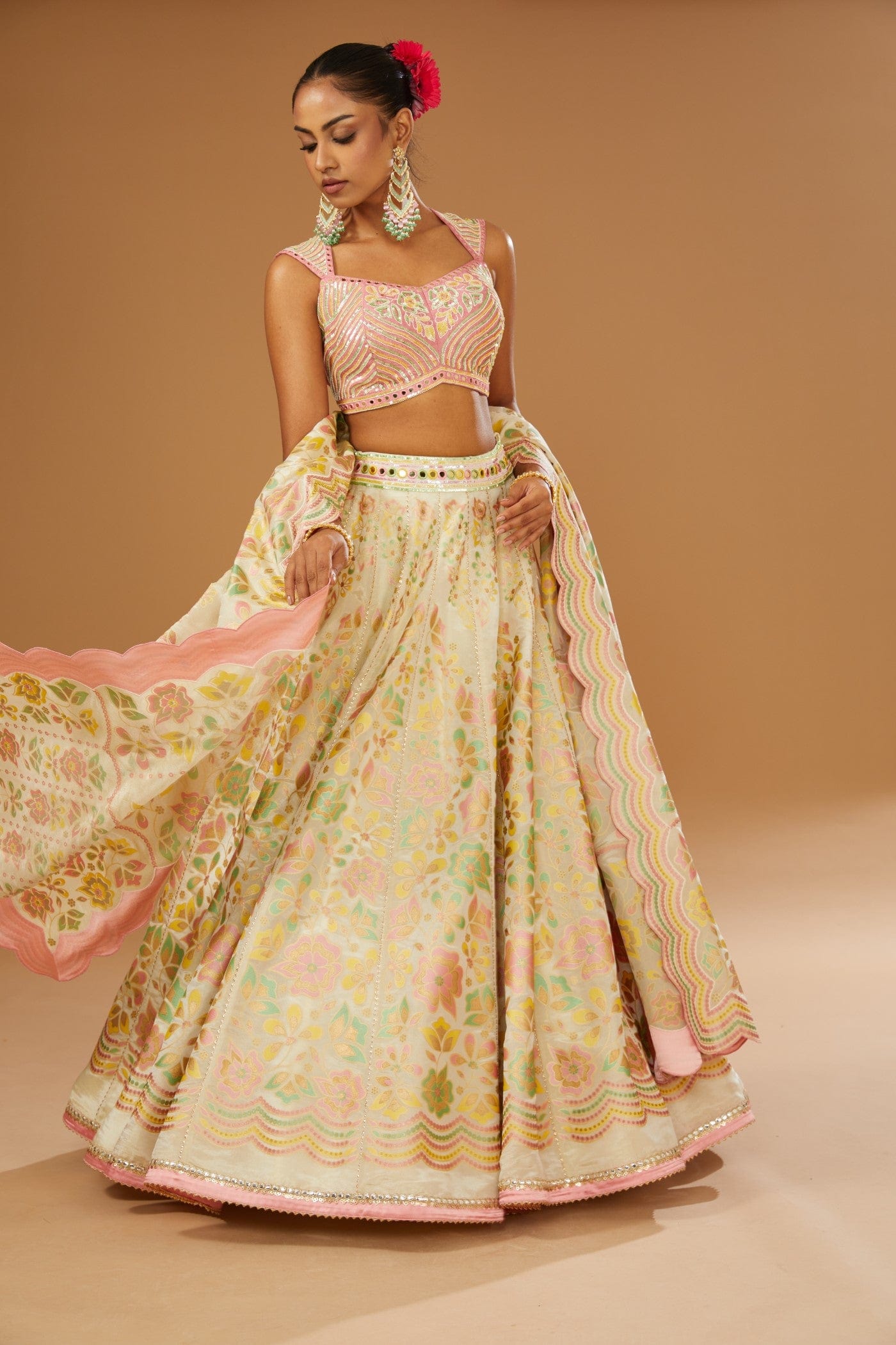 Featuring a ivory lehenga set in silk zari base comprising of floral hand printed lehenga, dupatta and hand embroidered peach blouse embellished with a bling of mirrors & sequins.