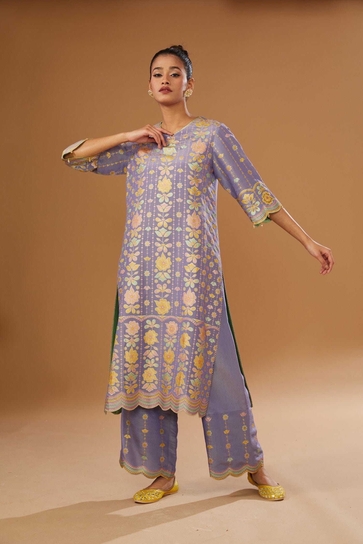 Featuring a mauve suit set in silk base with colorful floral hand print. It is paired with hand printed pant and dupatta.