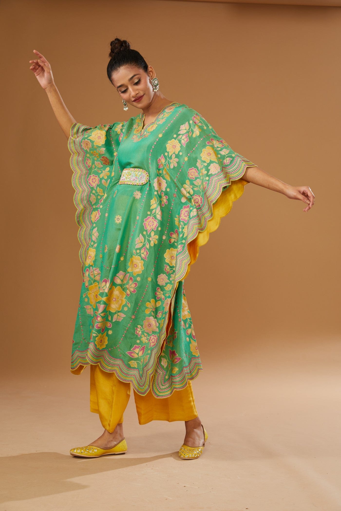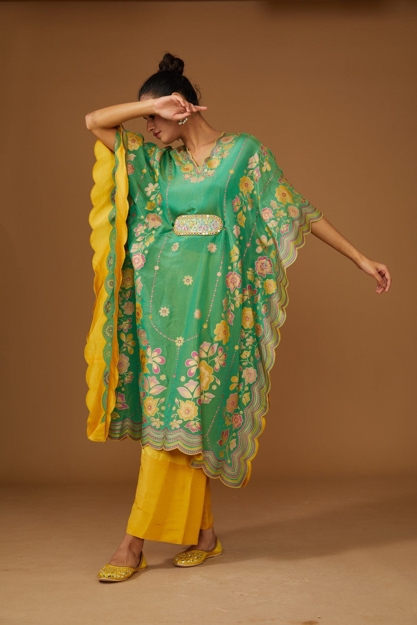 Featuring a green kaftan set with colorful floral hand print and hand embriodered belt, embellished with a bling of mirrors and sequins. It is paired with a slip and a contrast mustard pant.