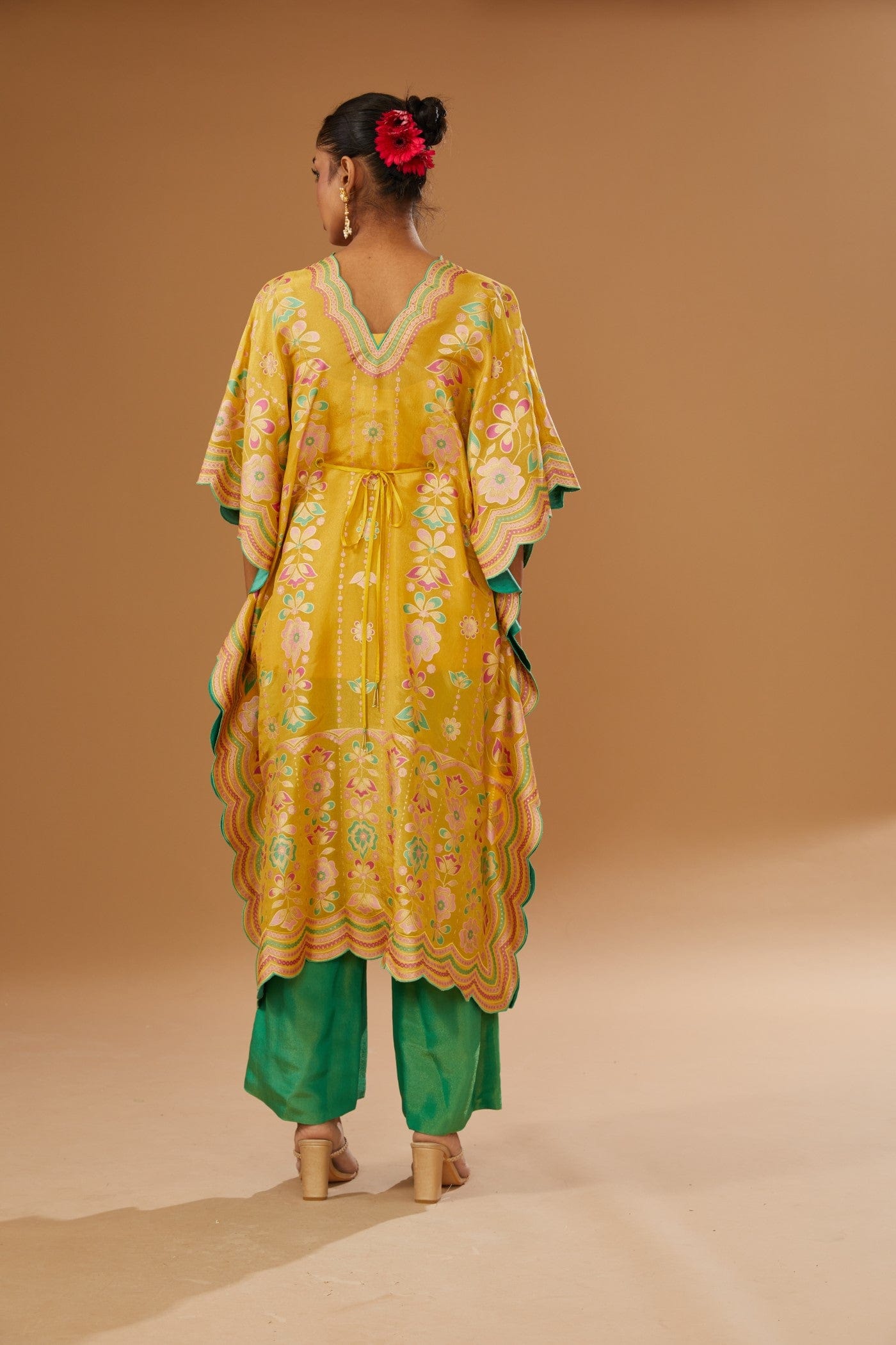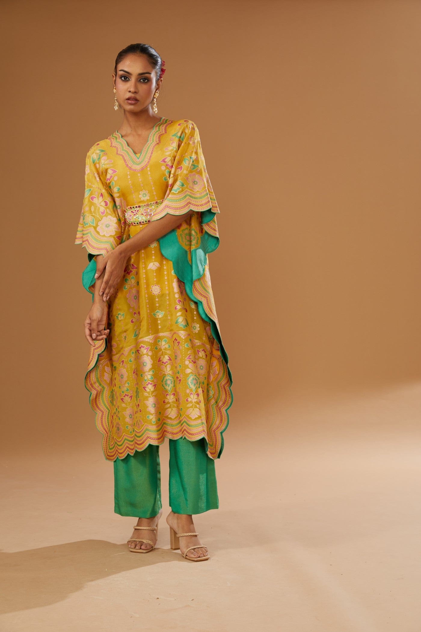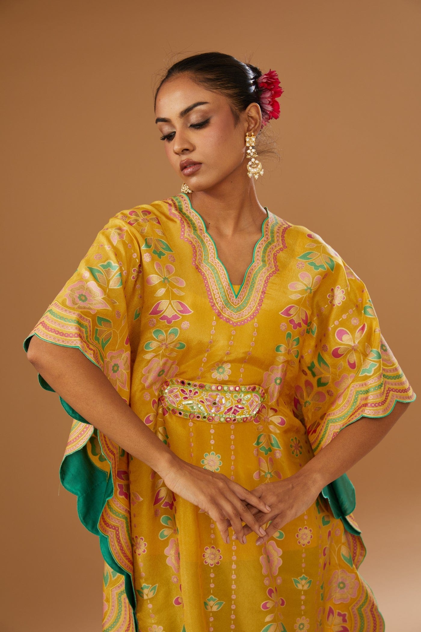 Featuring a mustard kaftan set with colorful floral hand print and hand embriodered belt, embellished with a bling of mirrors and sequins. It is paired with a slip and a contrast green pant.