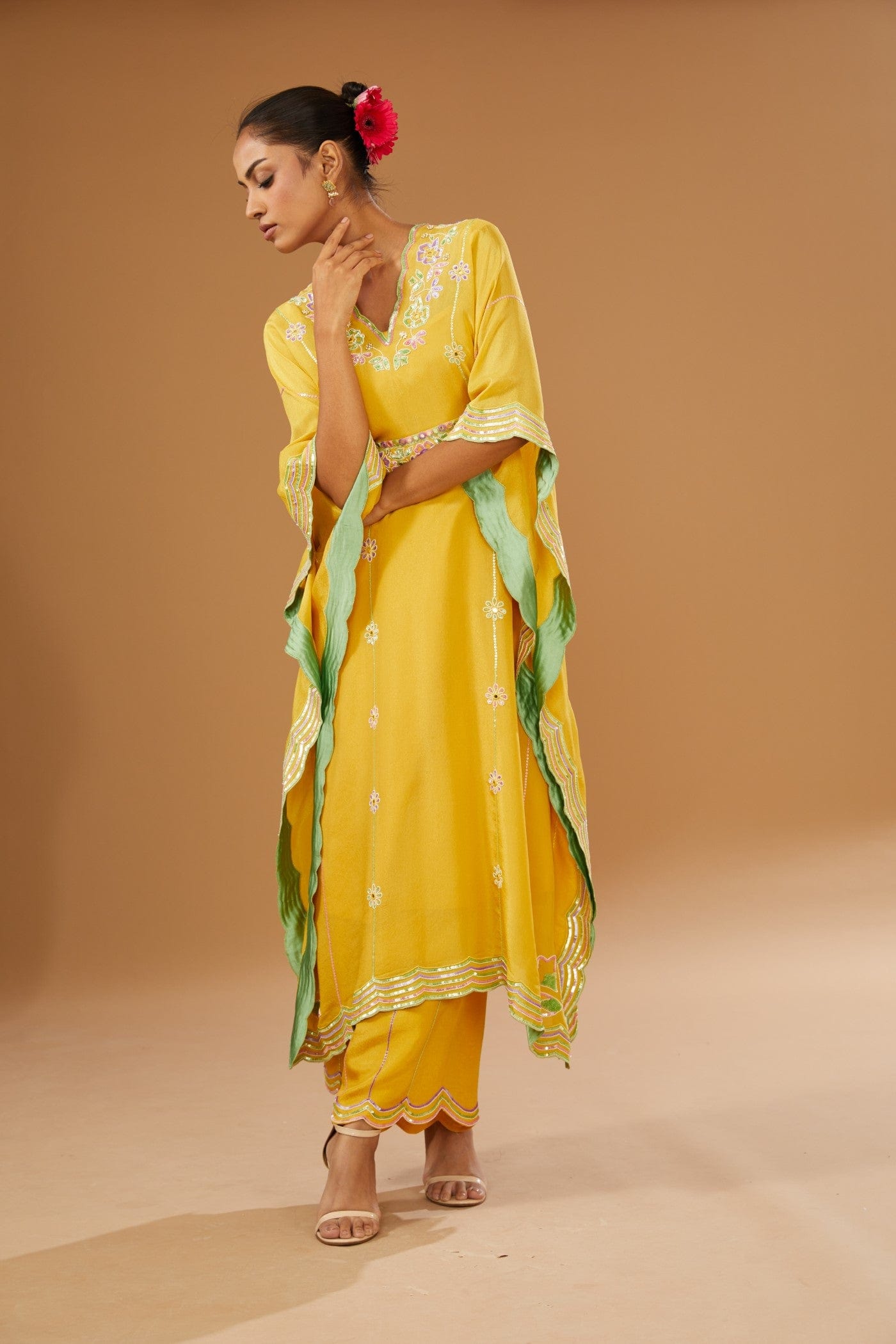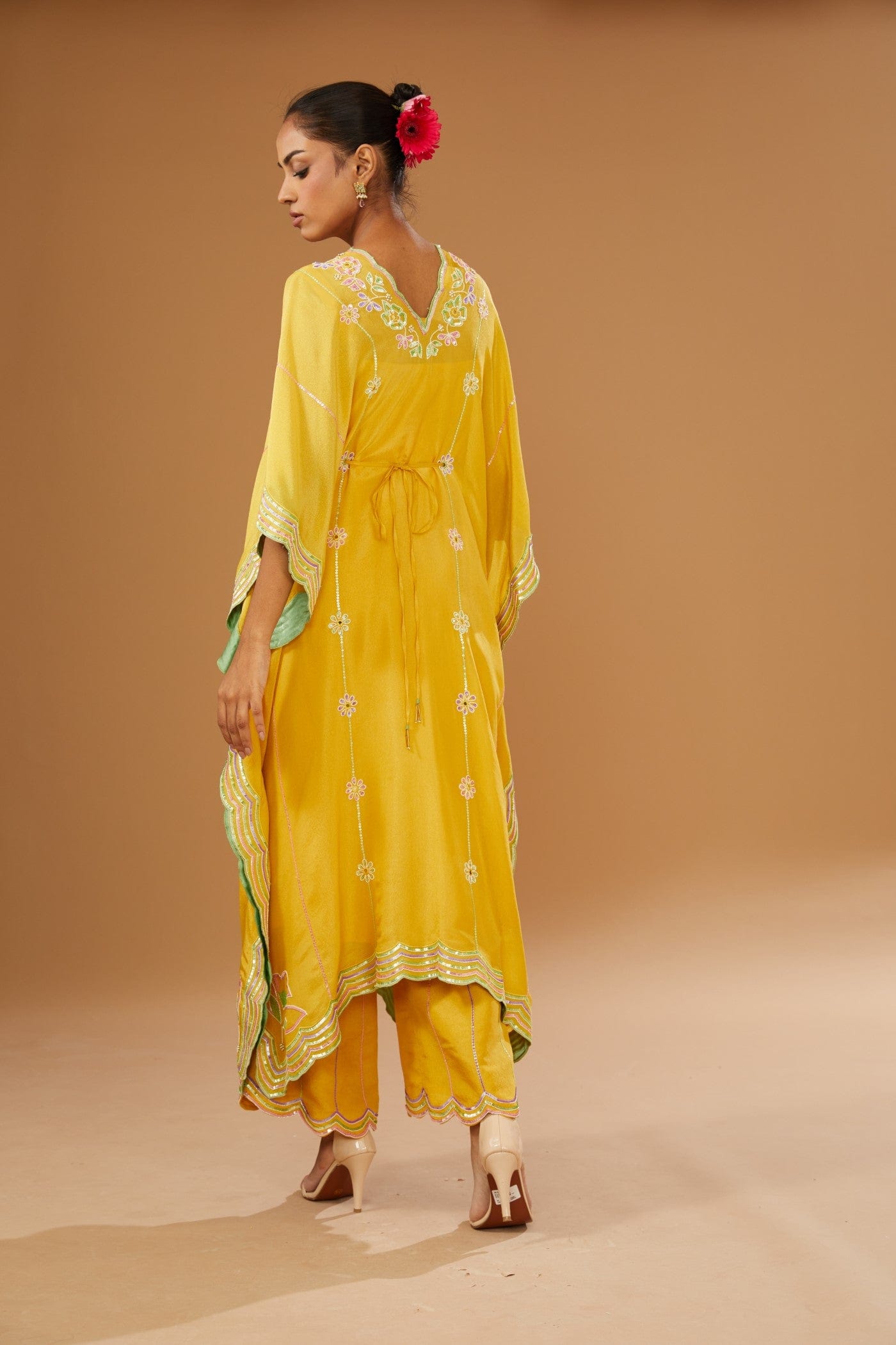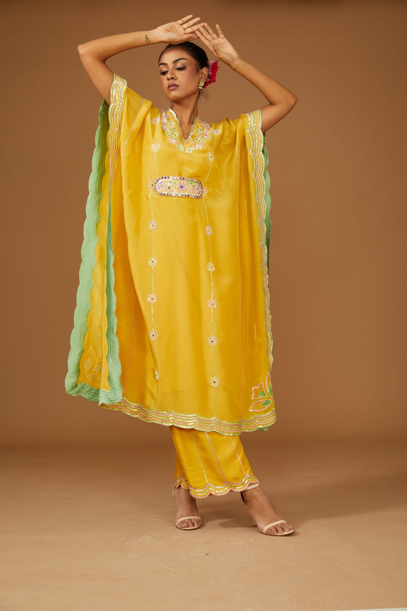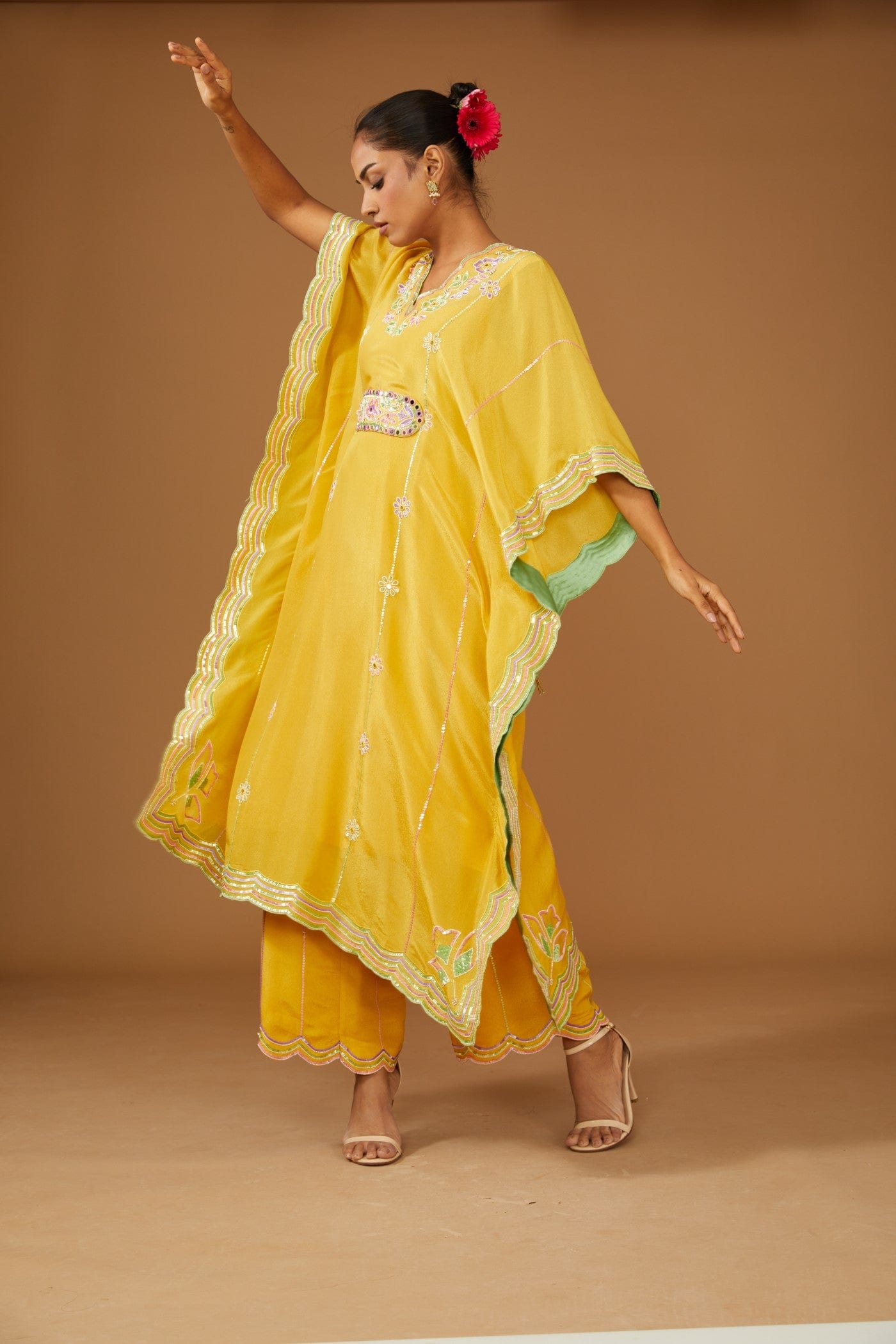 Featuring a fusion mustard kaftan set in silk zari base with colourful hand embroidery. It is paired with a slip, a hand embroidered belt & a pant, embellished with a bling of mirrors and sequins.