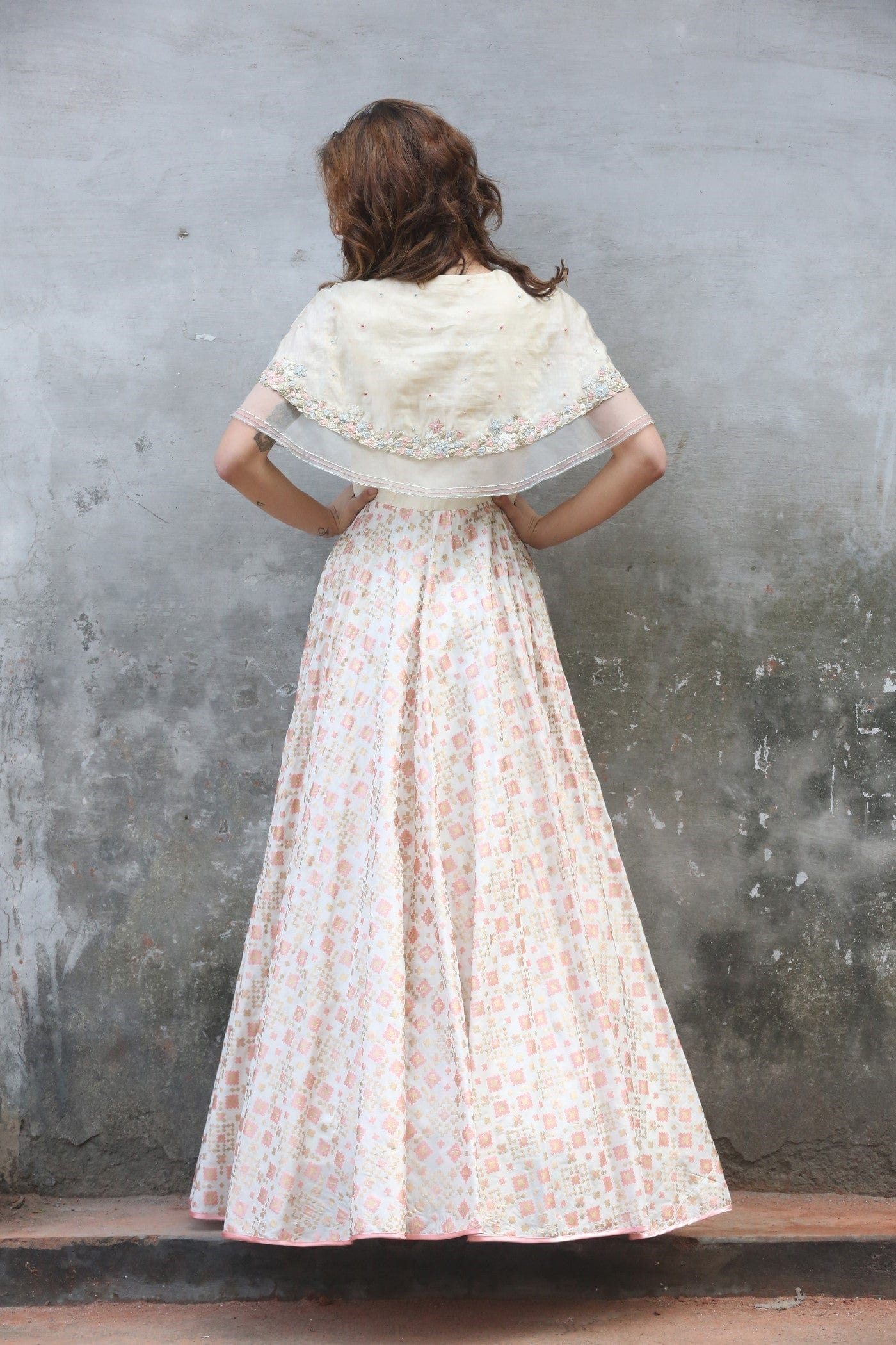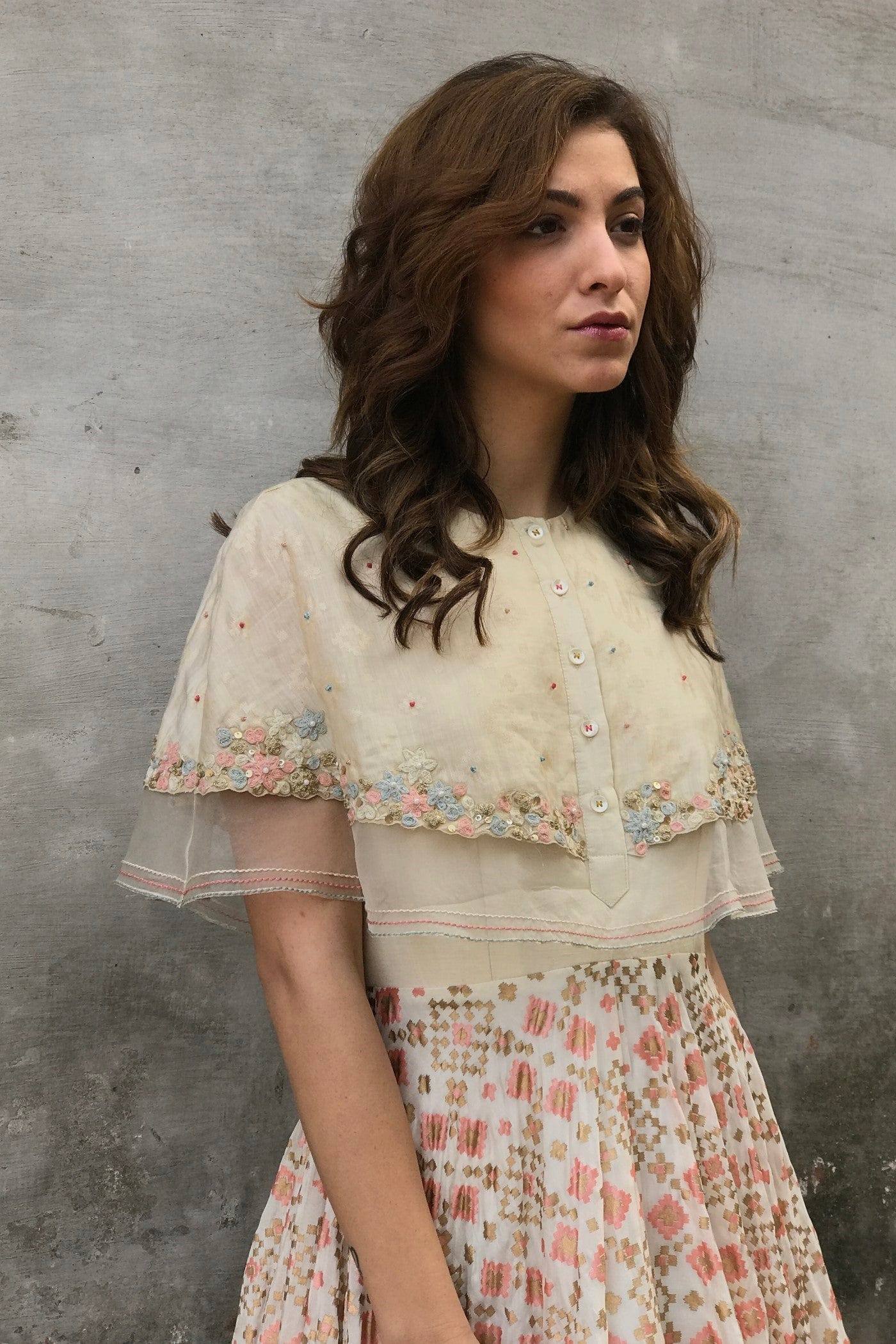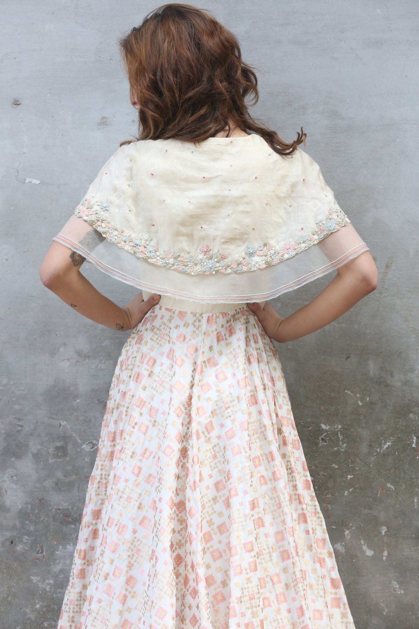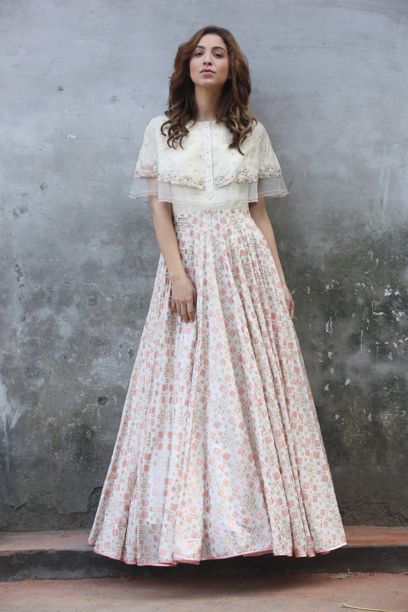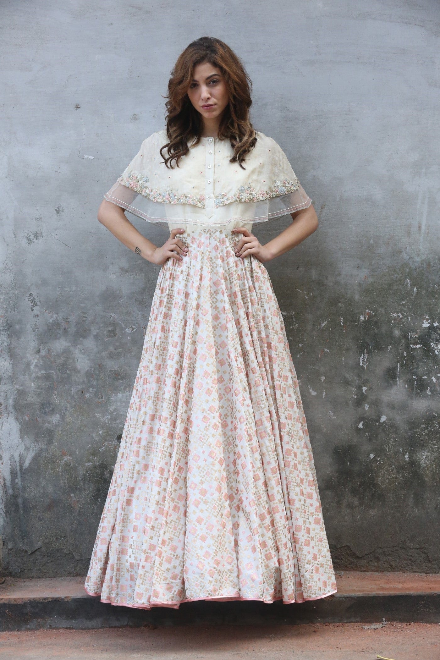 Ivory cape style ikat printed gown with attached emboridered short cape.