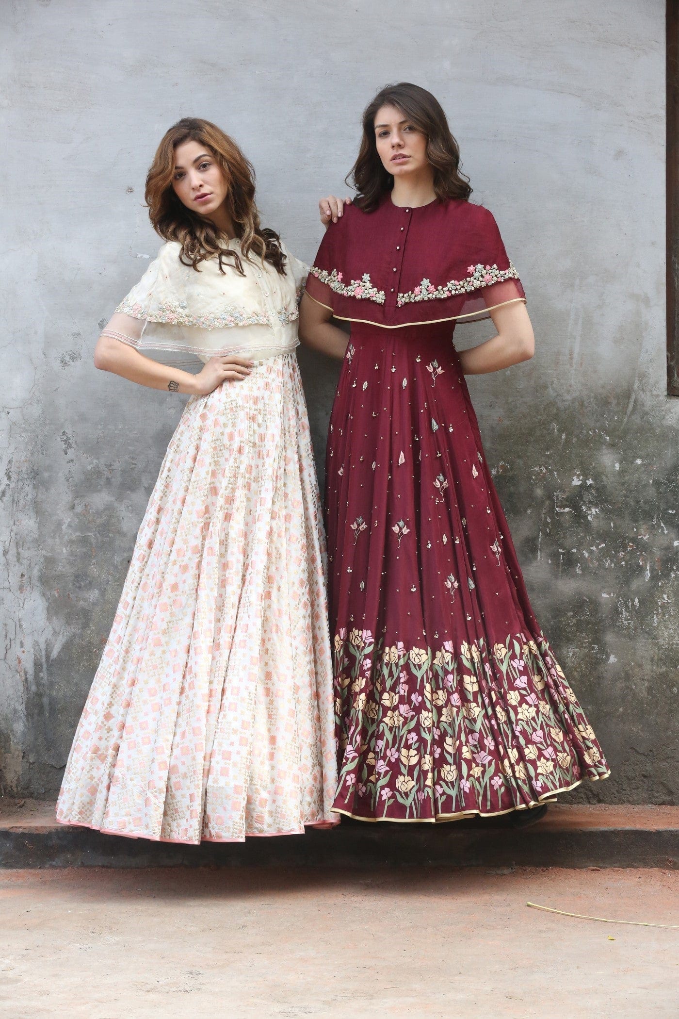 The ensemble is designed using an innovative technique of hand printing, creating an illusion of Banarsi and Ikat weave, embellished with colourful floral & kantha embroidery with a subtle bling of zari making it a perfect fusion for all festive occasions.