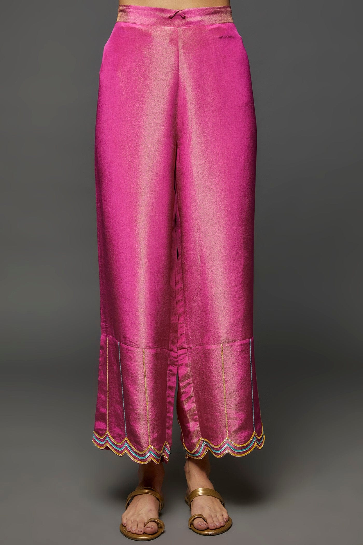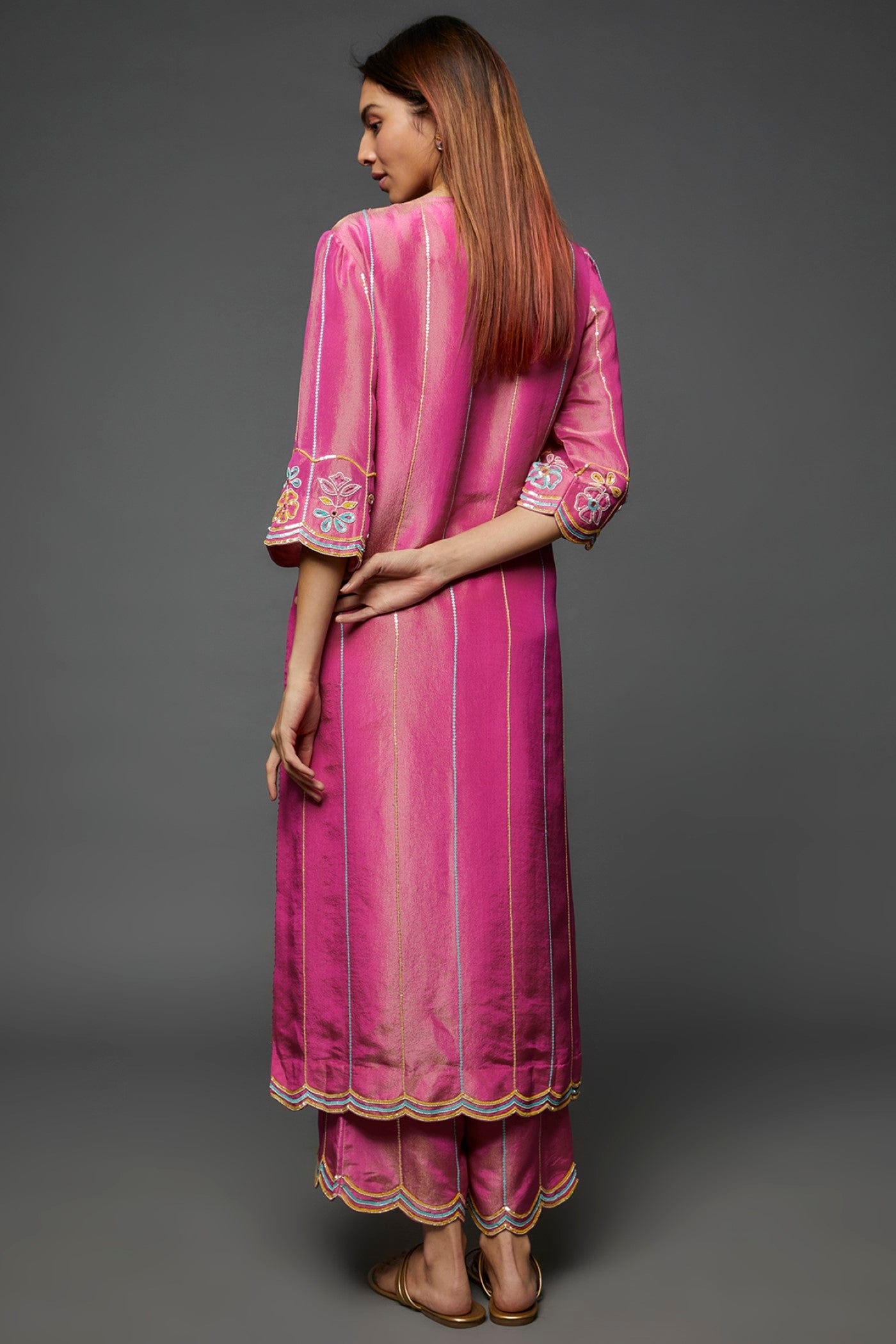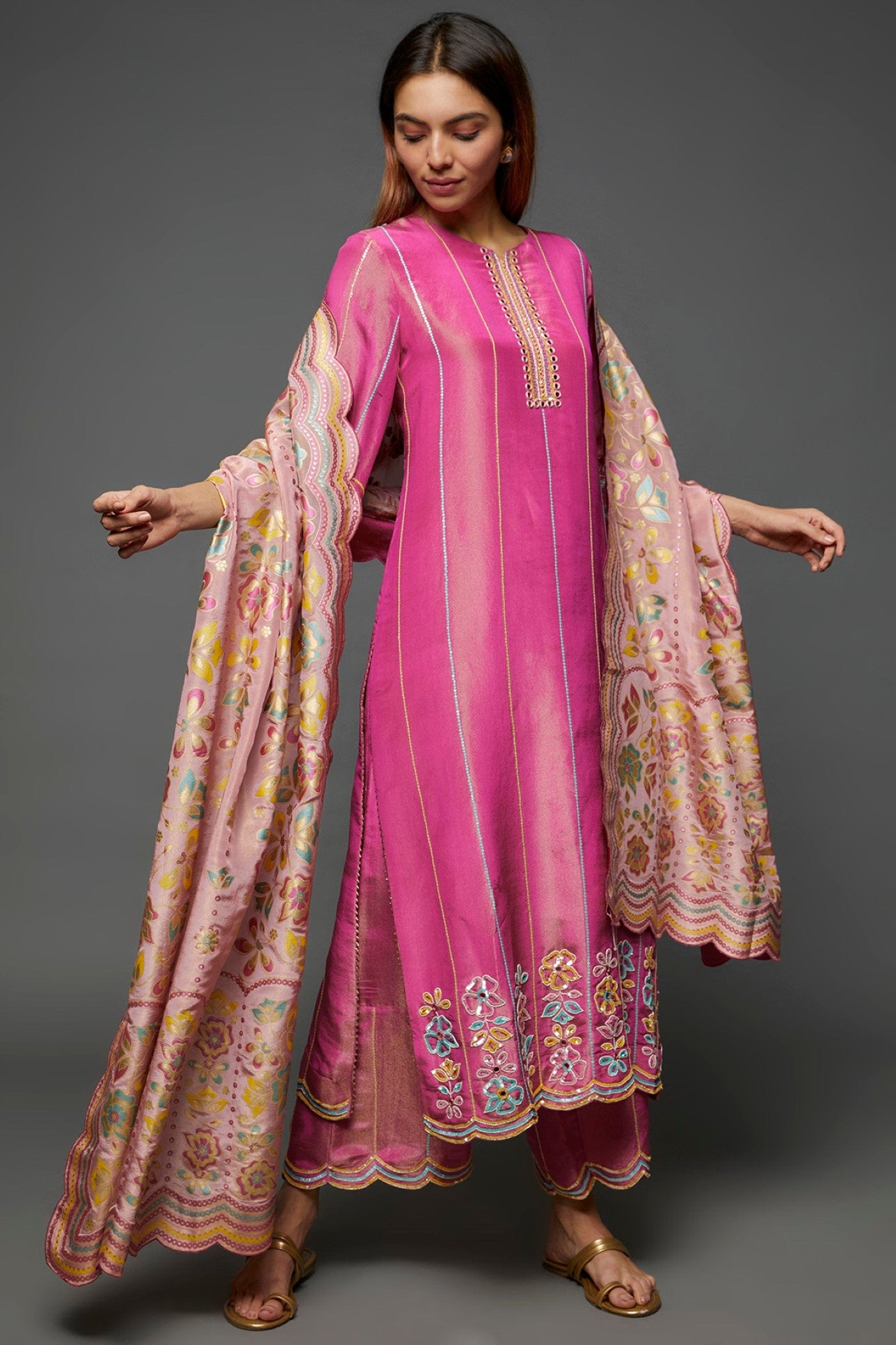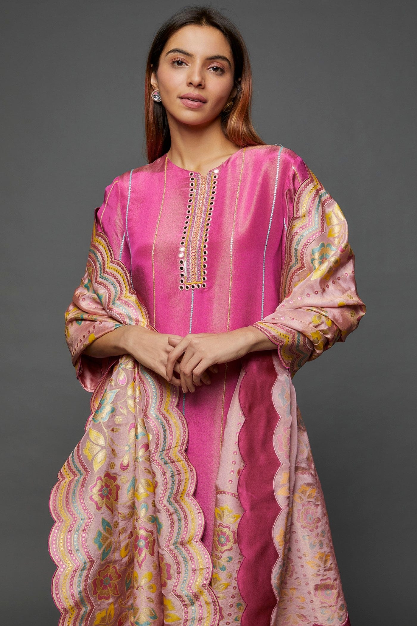 Featuring a pink kurta in linen satin and silk base with floral french knots and kantha detailing. It is paired with matching pants and an ikat printed stole.