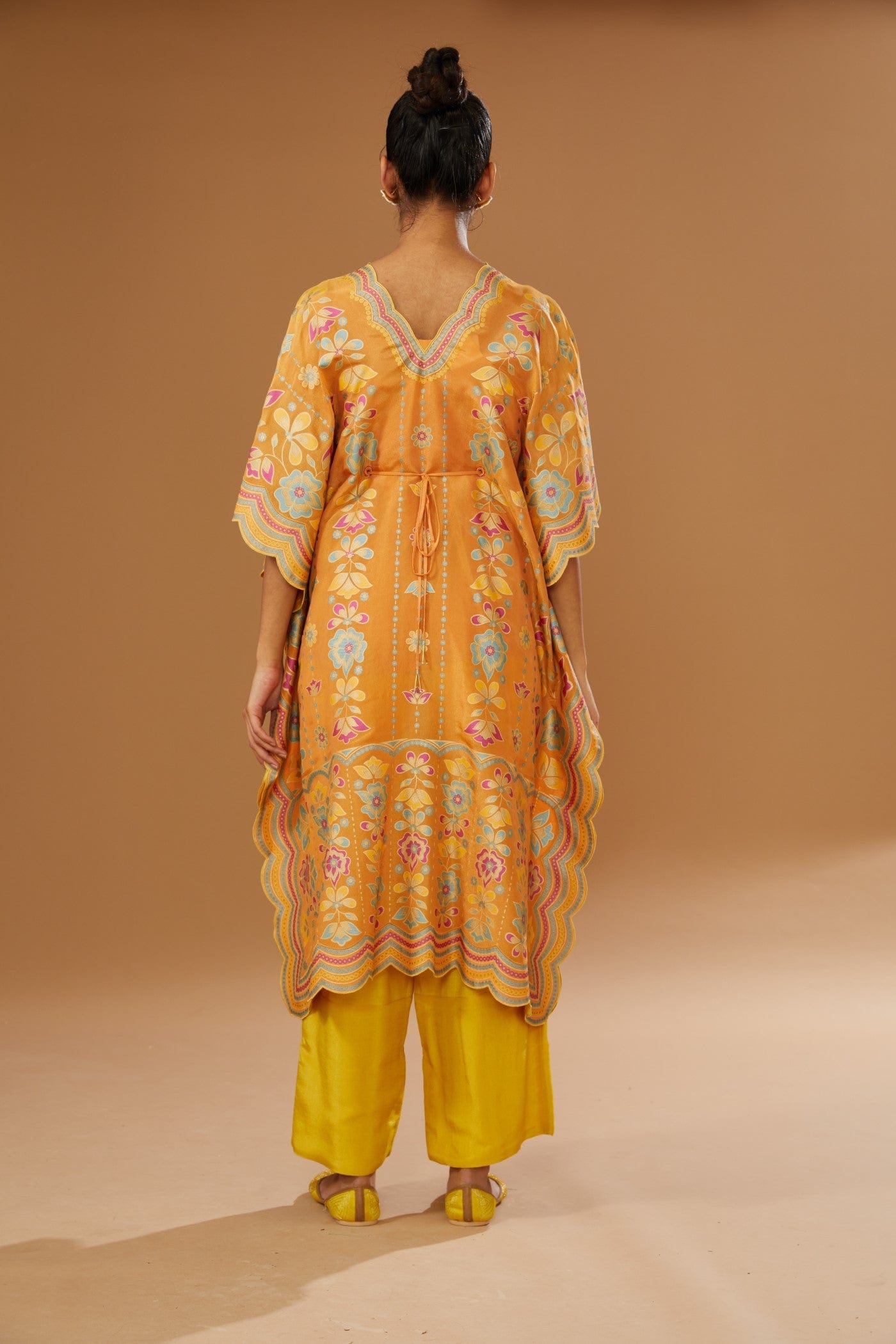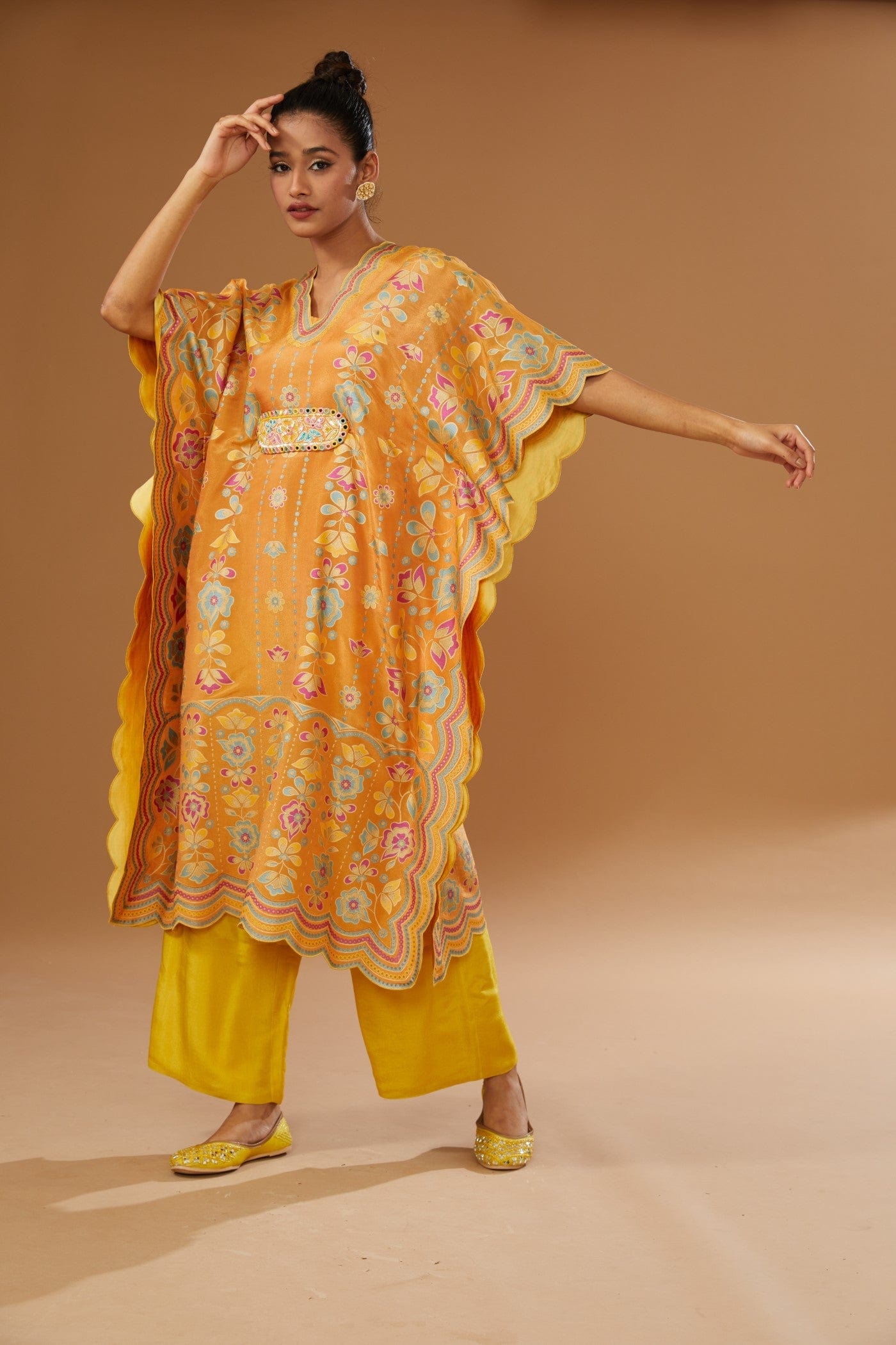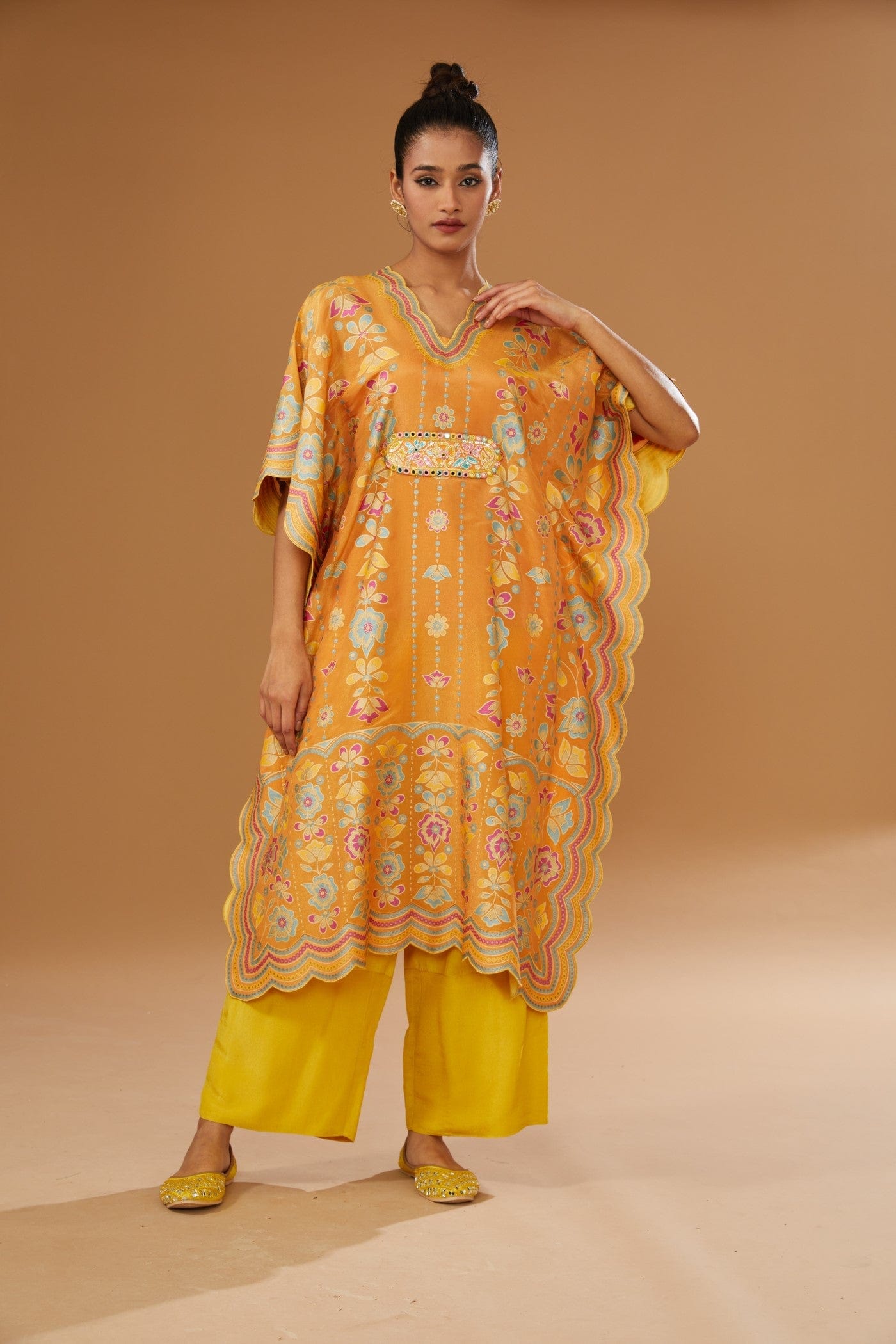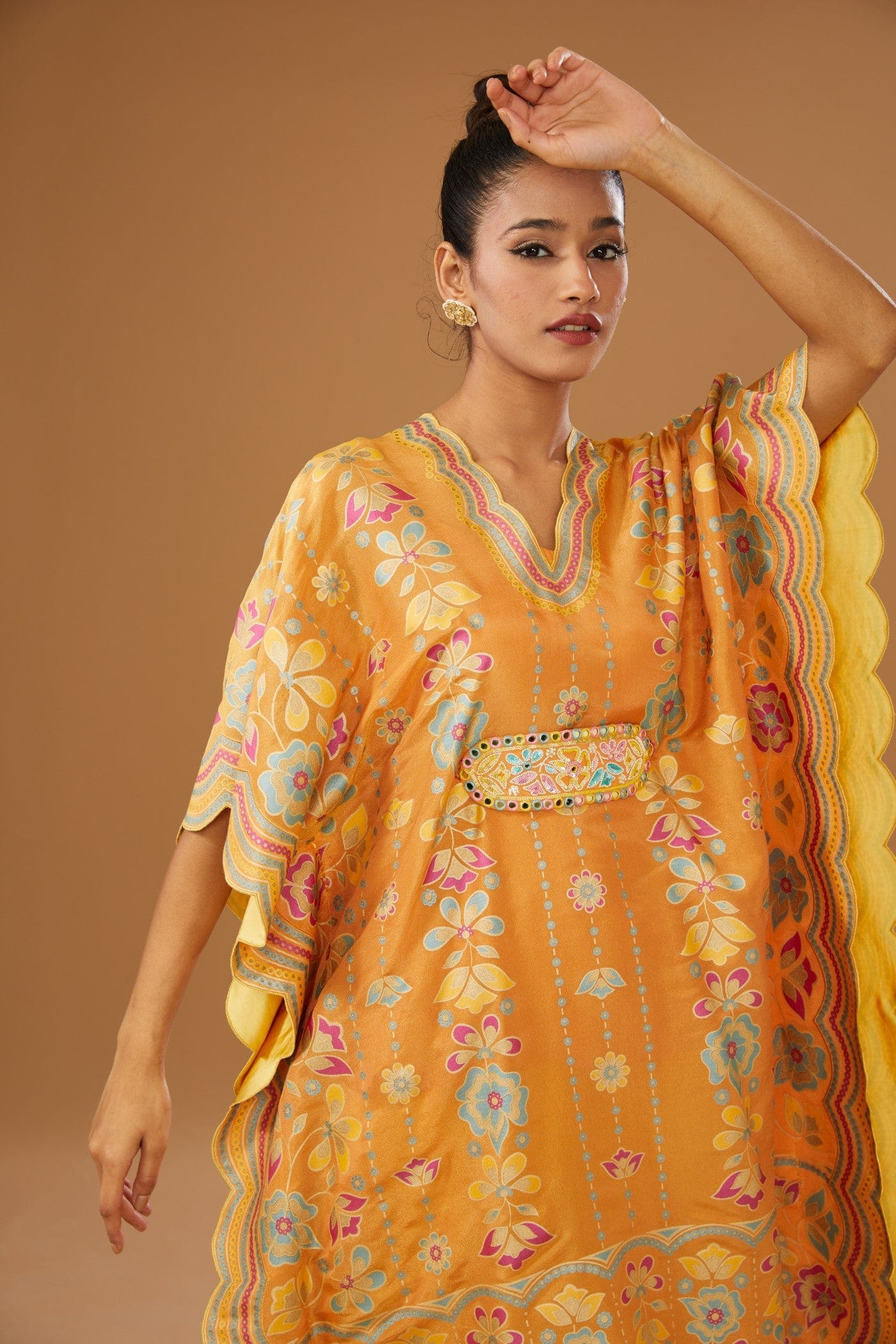 Featuring an orange kaftan set with colorful floral hand print and hand embriodered belt, embellished with a bling of mirrors and sequins. It is paired with a slip and a contrast mustard pant.