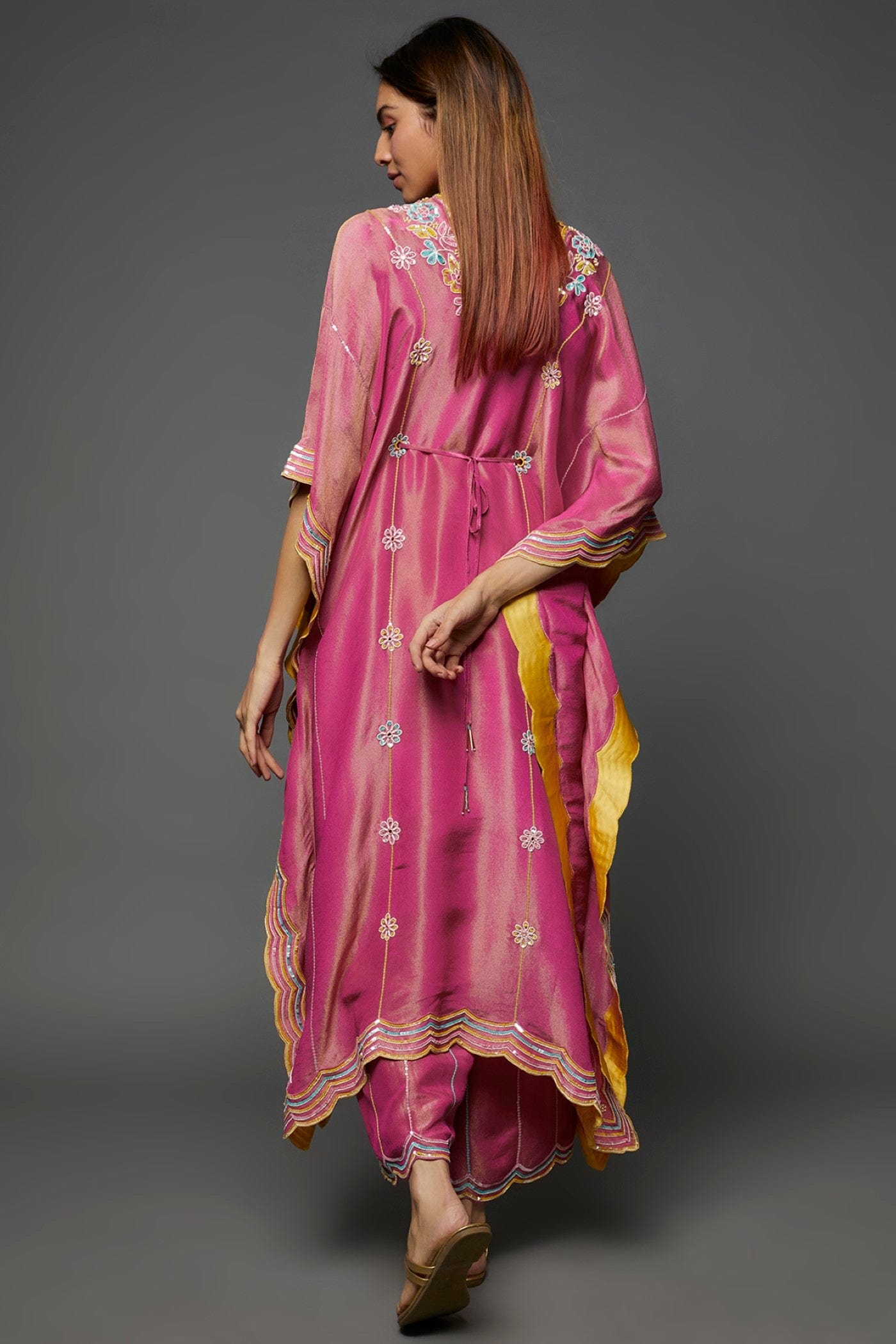 Featuring a pink kaftan in silk blend base with floral hand print and hand embroidery. It is paired with matching parallel pants, a slip, and a belt.