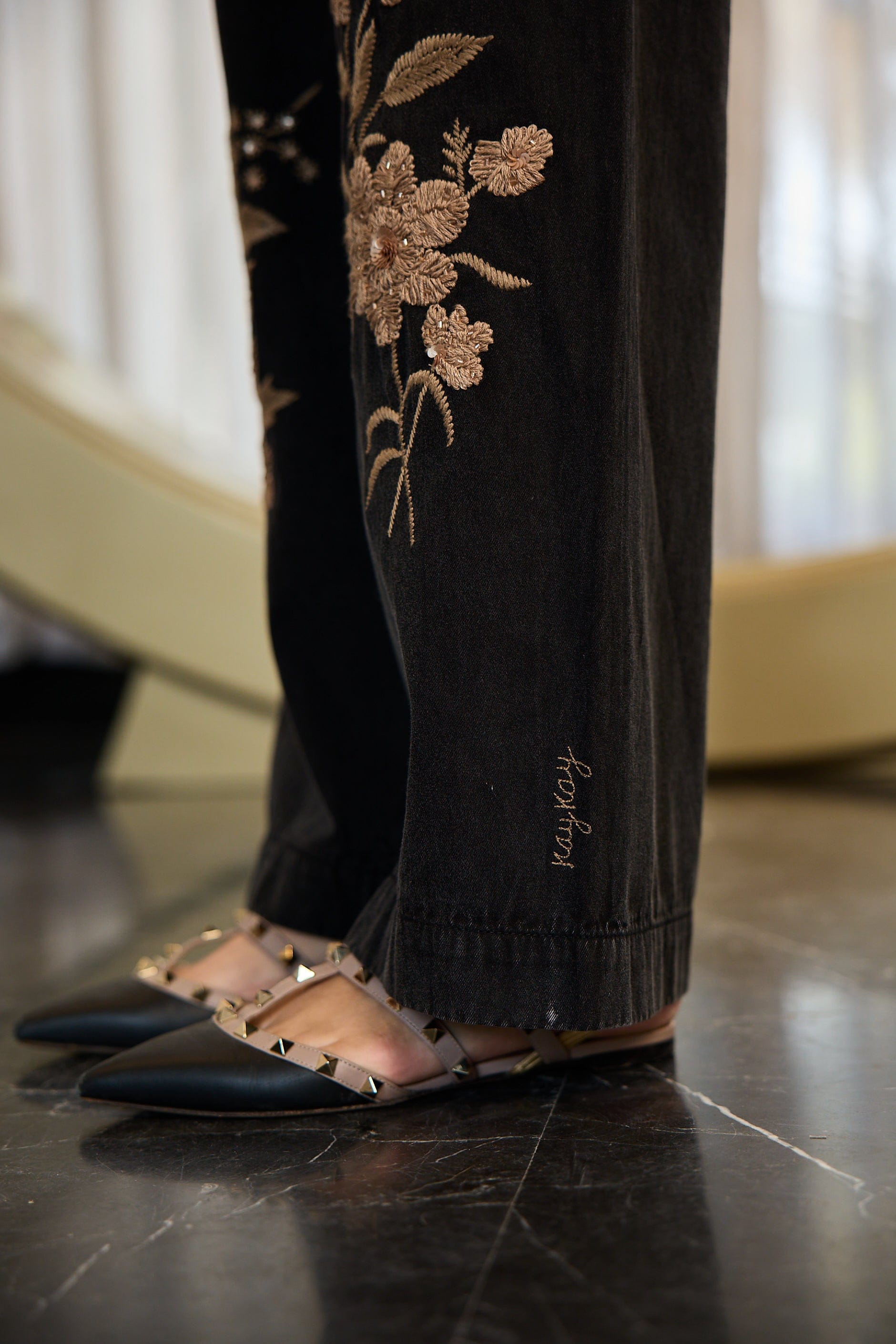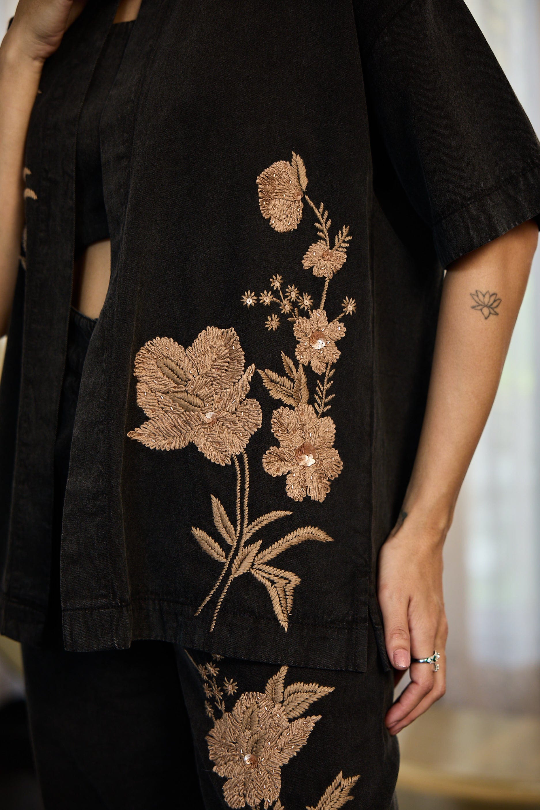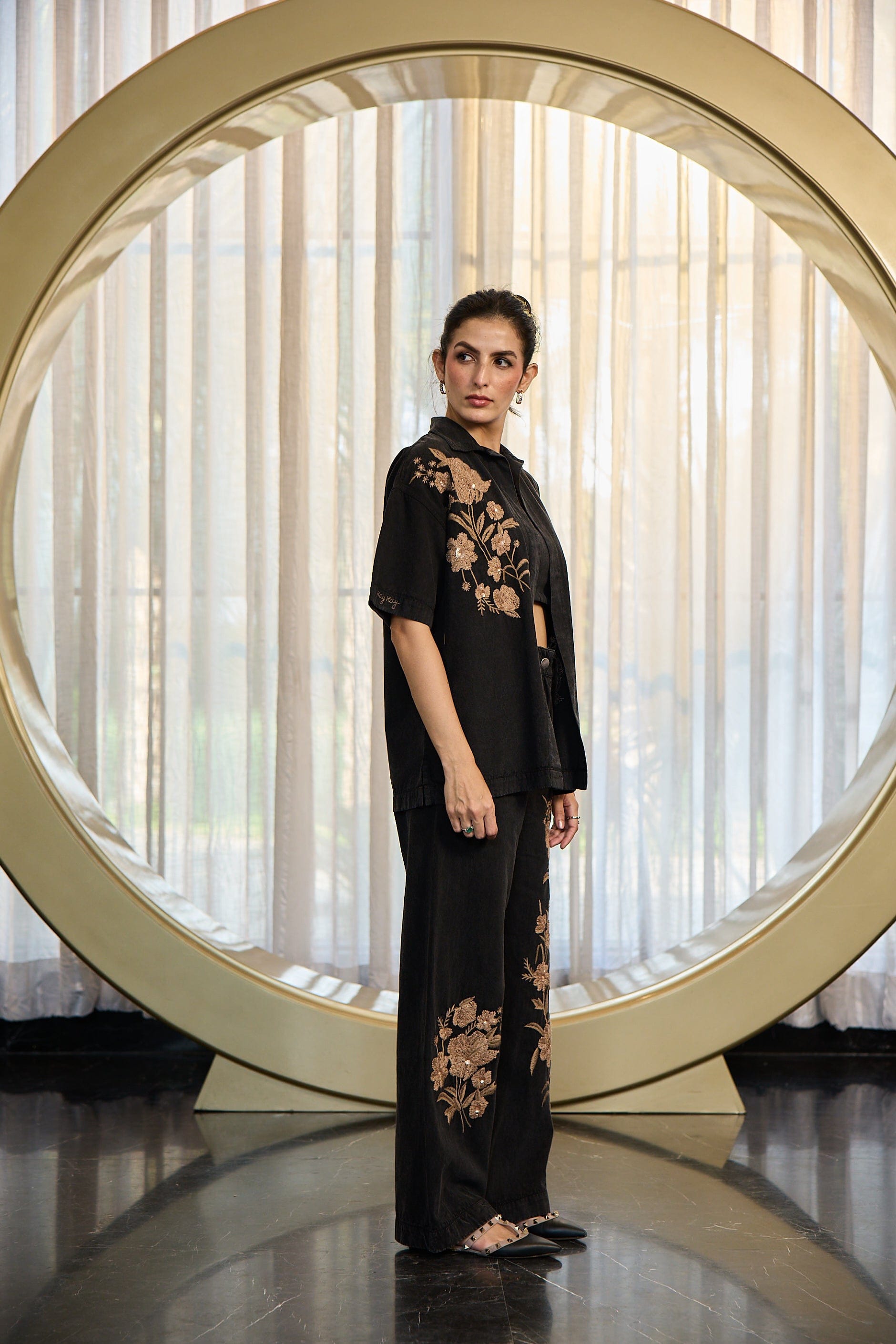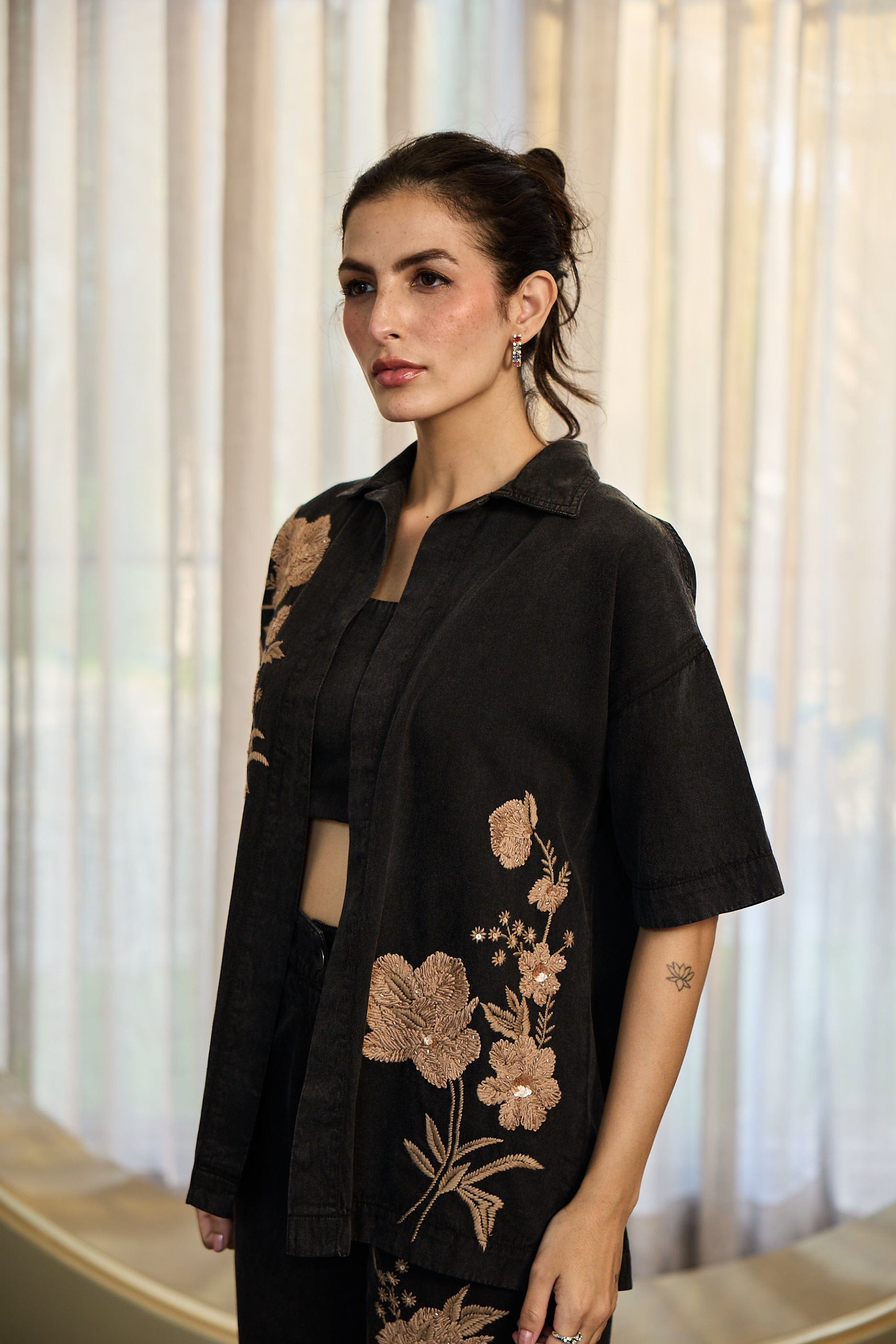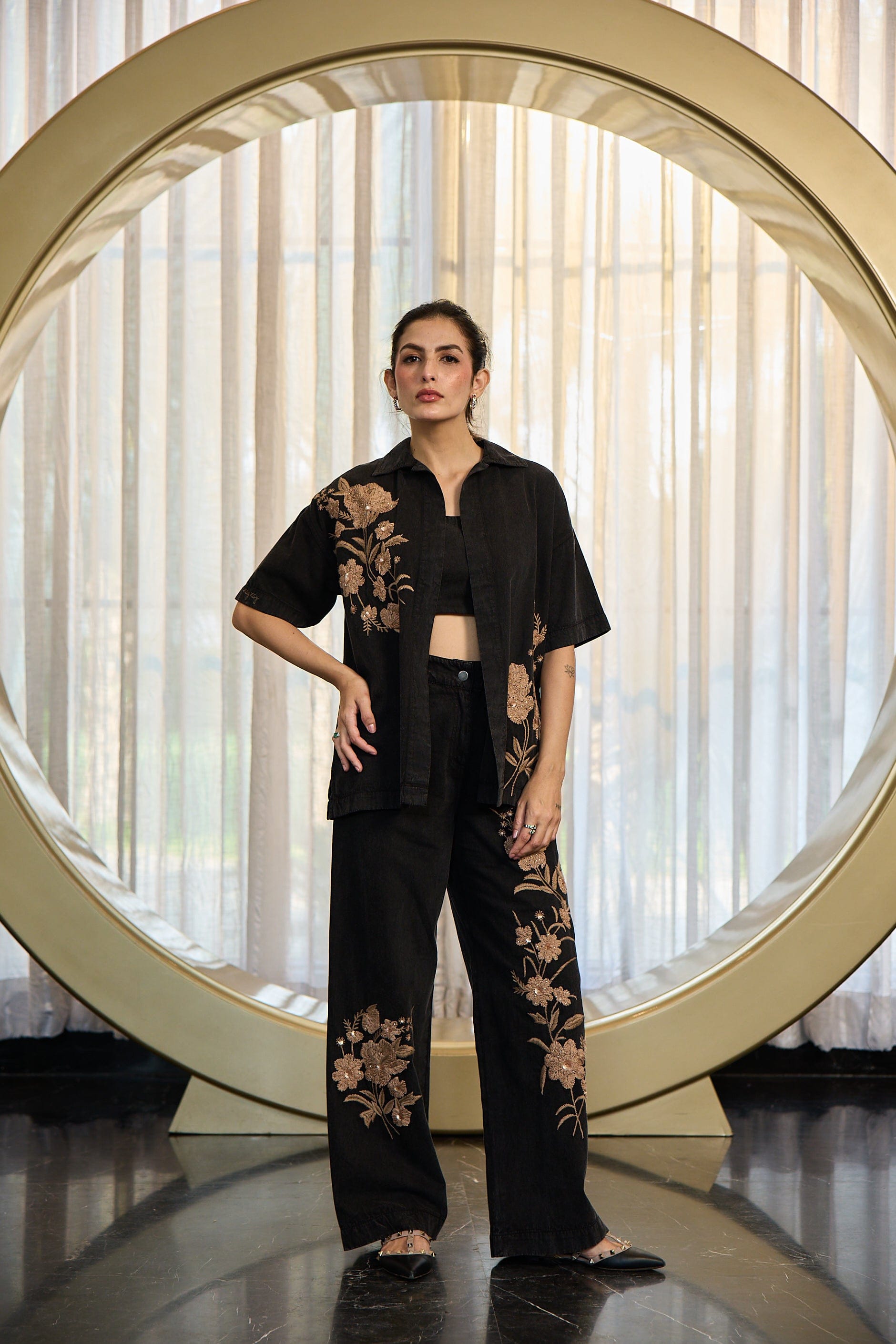 Effortlessly structured, this black denim co-ord set blends utility with elegance. Gold floral embroidery adds a touch of artistry to its relaxed silhouette, bold yet refined, just like Kay Kay.