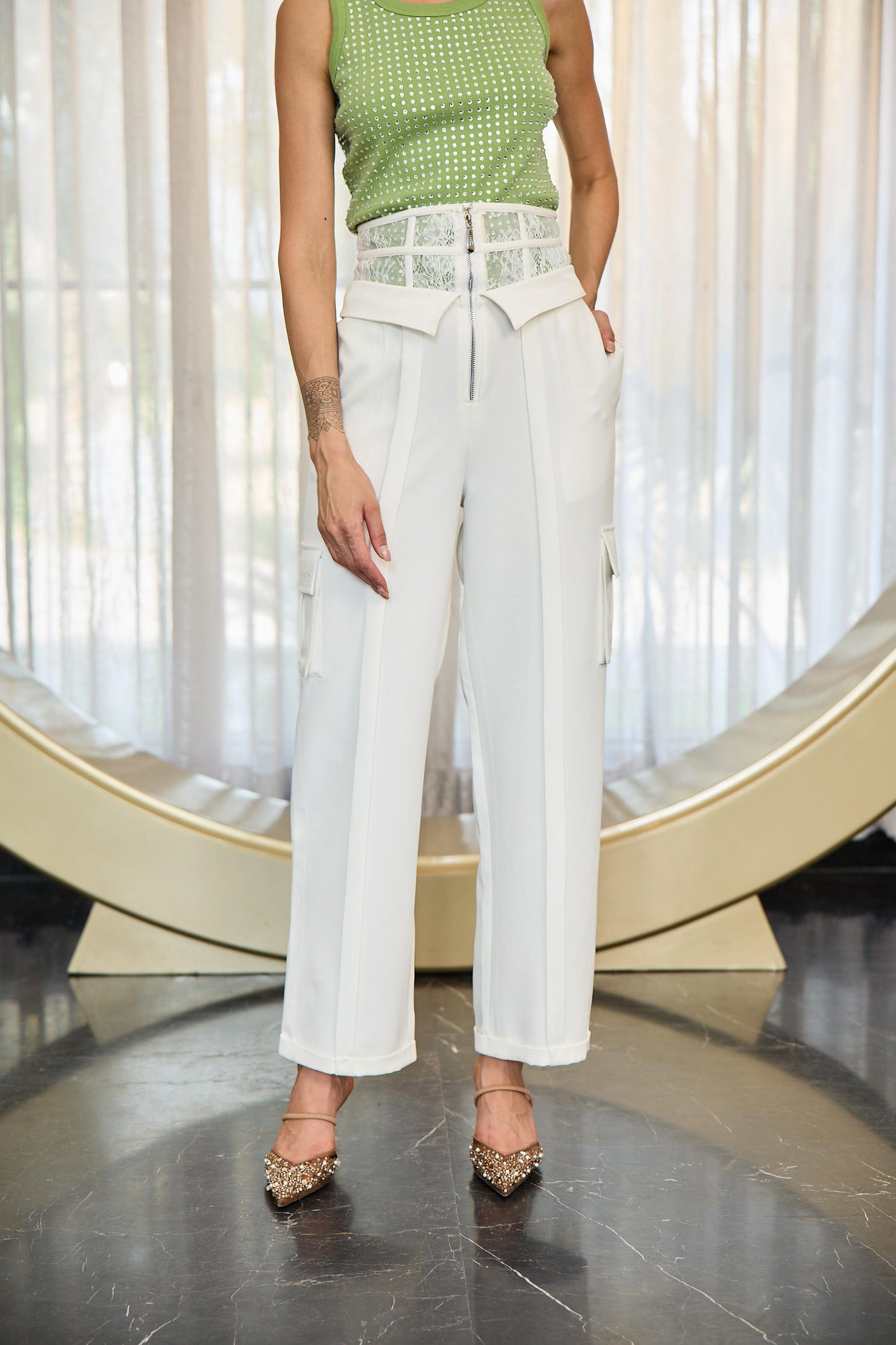 Fresh and breezy, this set pairs a green ribbed cotton tank with crisp white lace & banana crepe pants for a relaxed yet polished look.