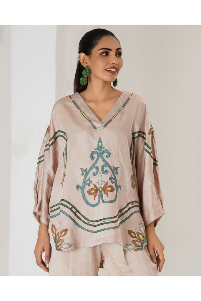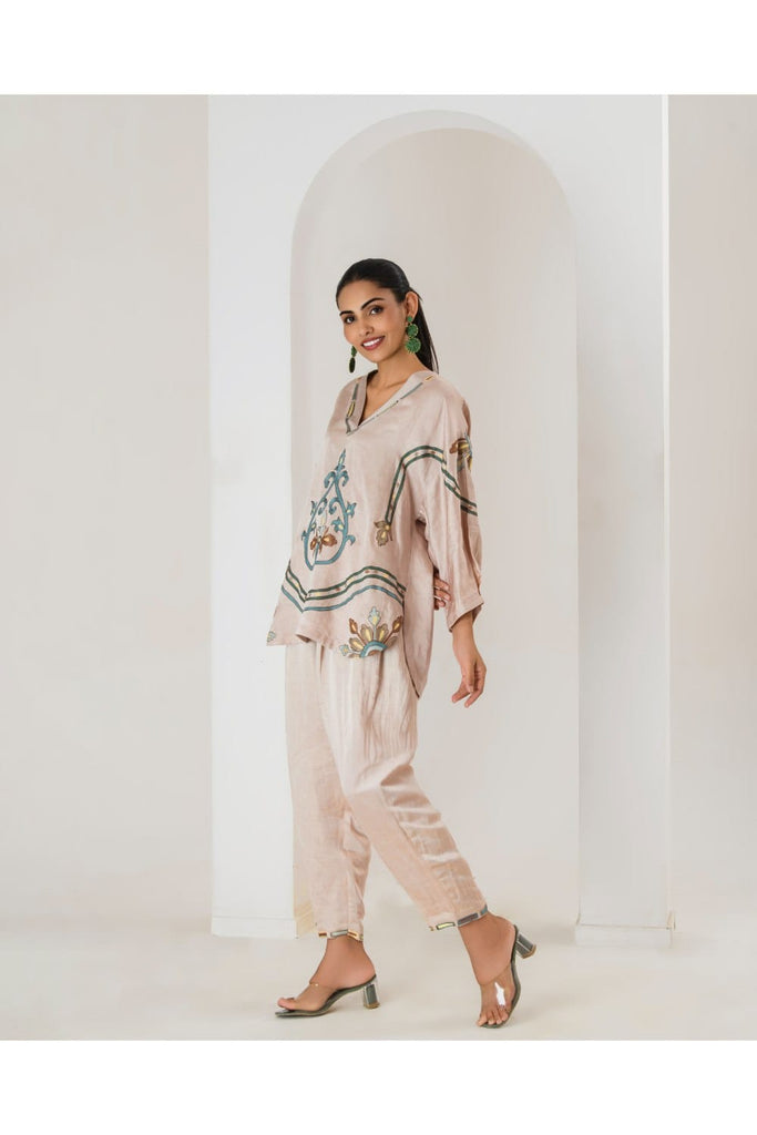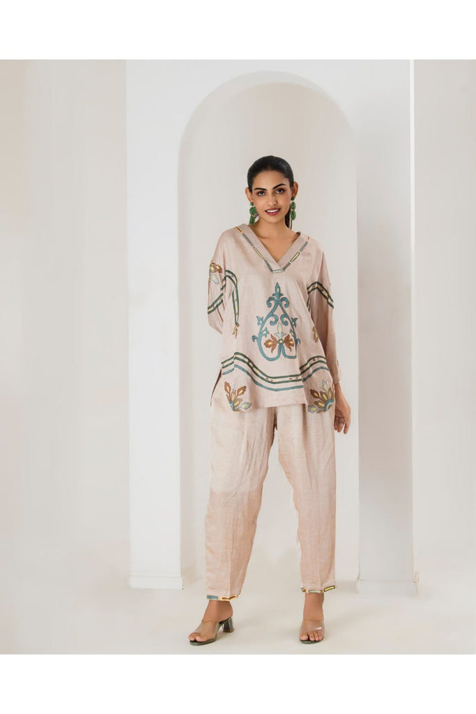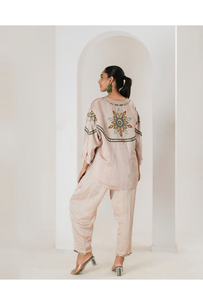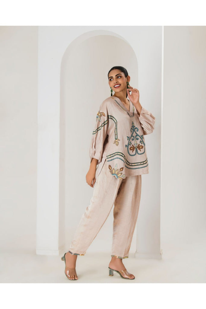 Our champagne Amira Short Coord Set featuring intricate aari embroidery on luxurious satin linen fabrics is the ideal combination of elegance and comfort, setting a new benchmark in the world of casual wear. The pants have emboidery on the hem with 2 pockets This product will be exclusively handcrafted for you, making the colour/texture/pattern slightly vary from the image shown, due to multiple artisan-led techniques and processes involved.