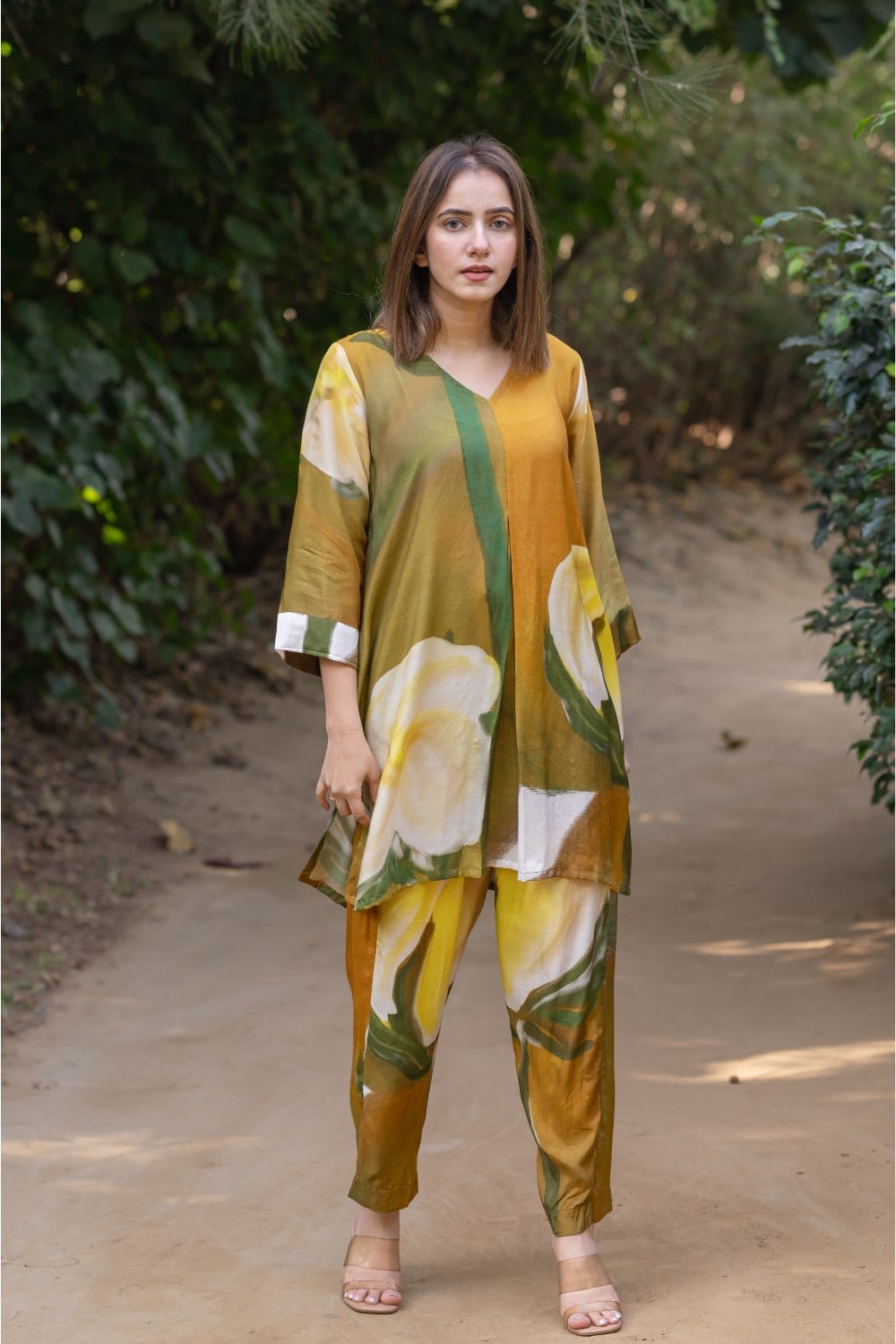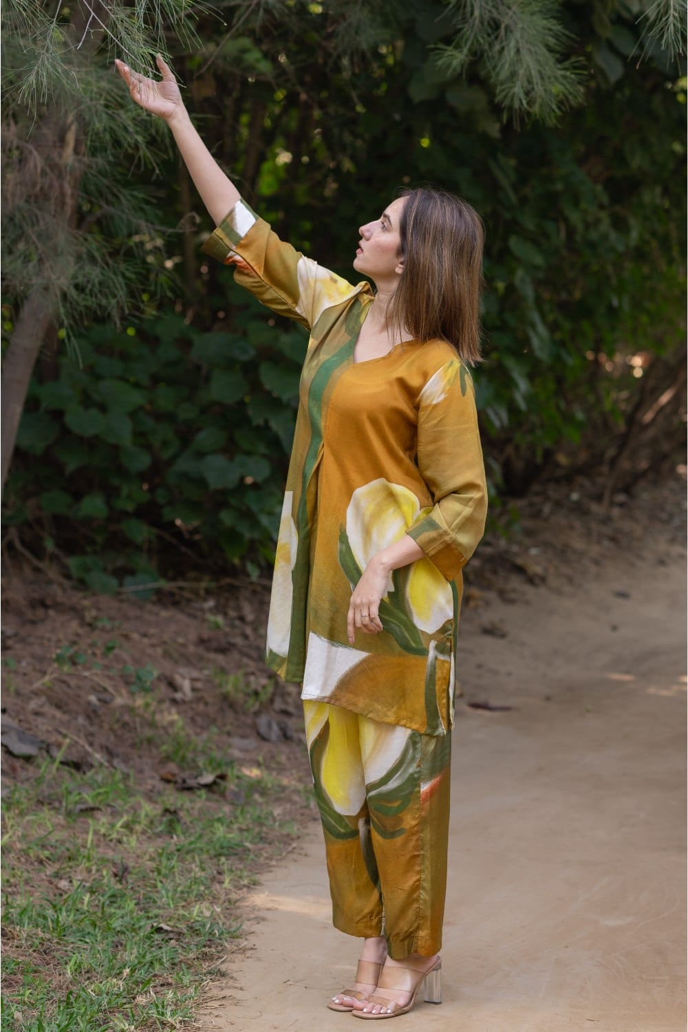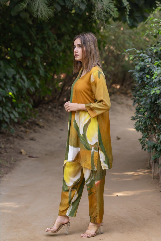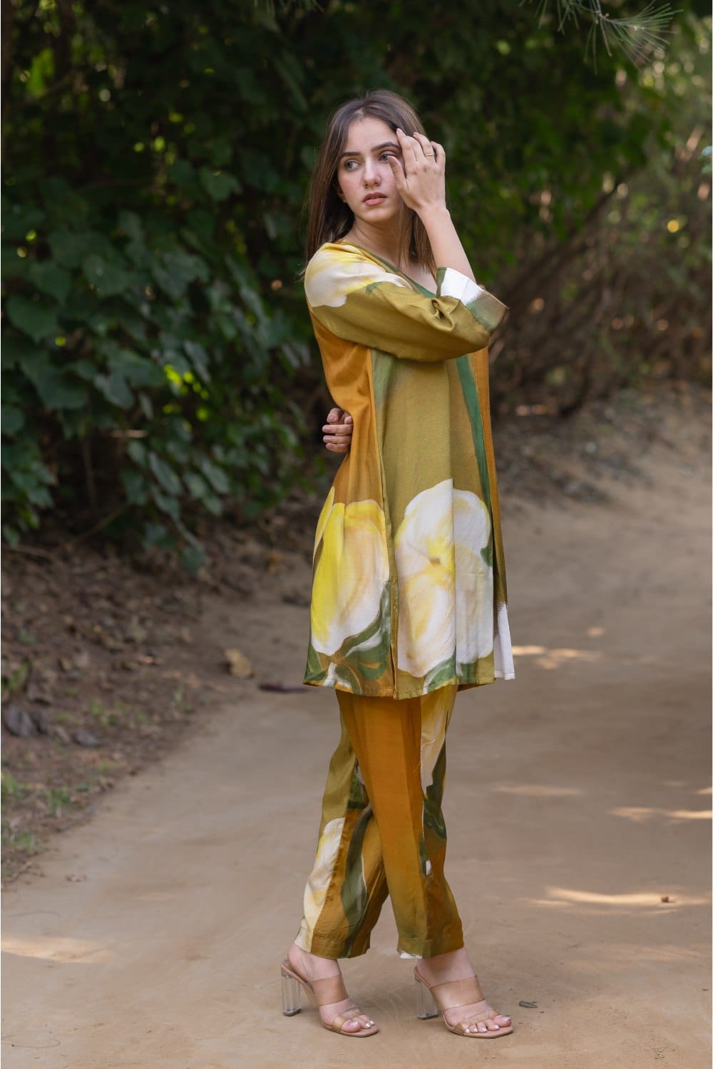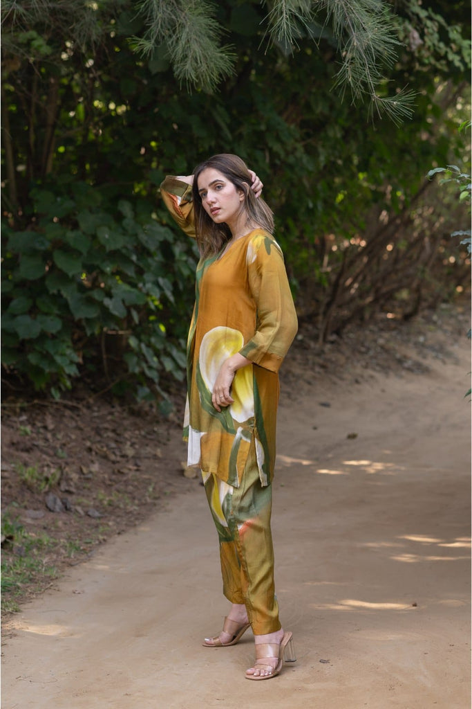 1. THIS SET INCLUDES KURTA AND PANTS. 2. OCHRE YELLOW COLOR KURTA WITH PANTS. . A.NECKLINE - VNECK B.SLEEVES - 3/4 SLEEVES 3. PANT - OCHRE YELLOW