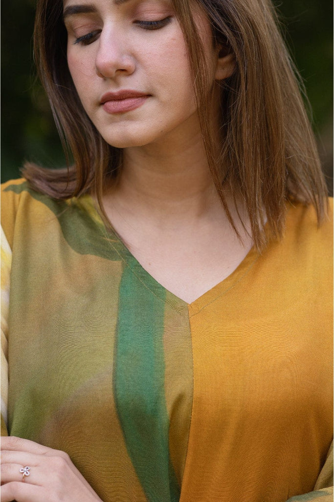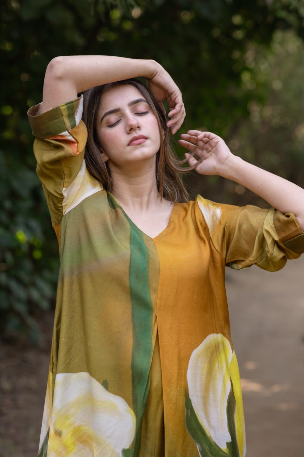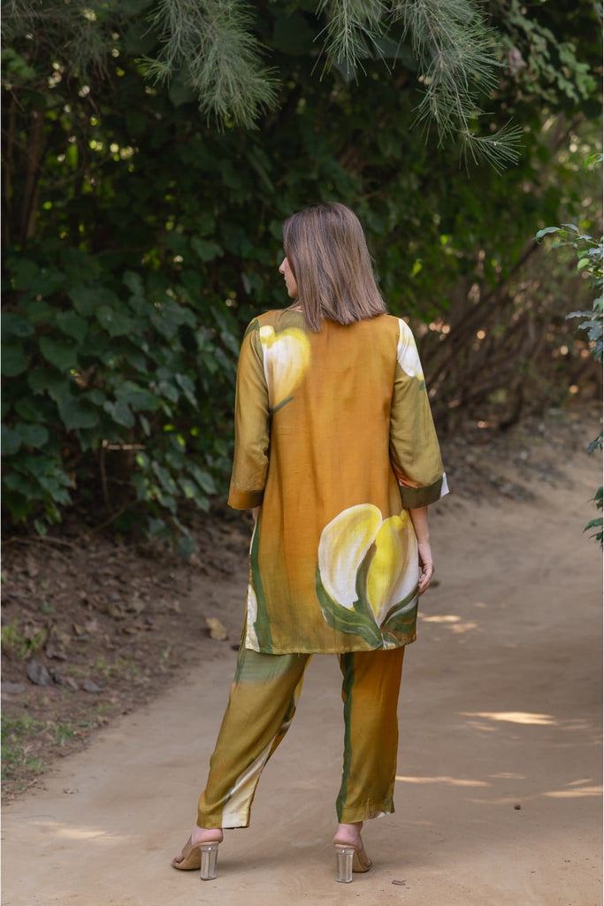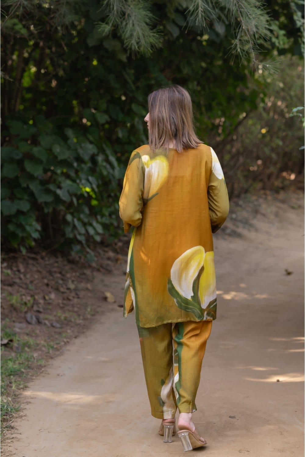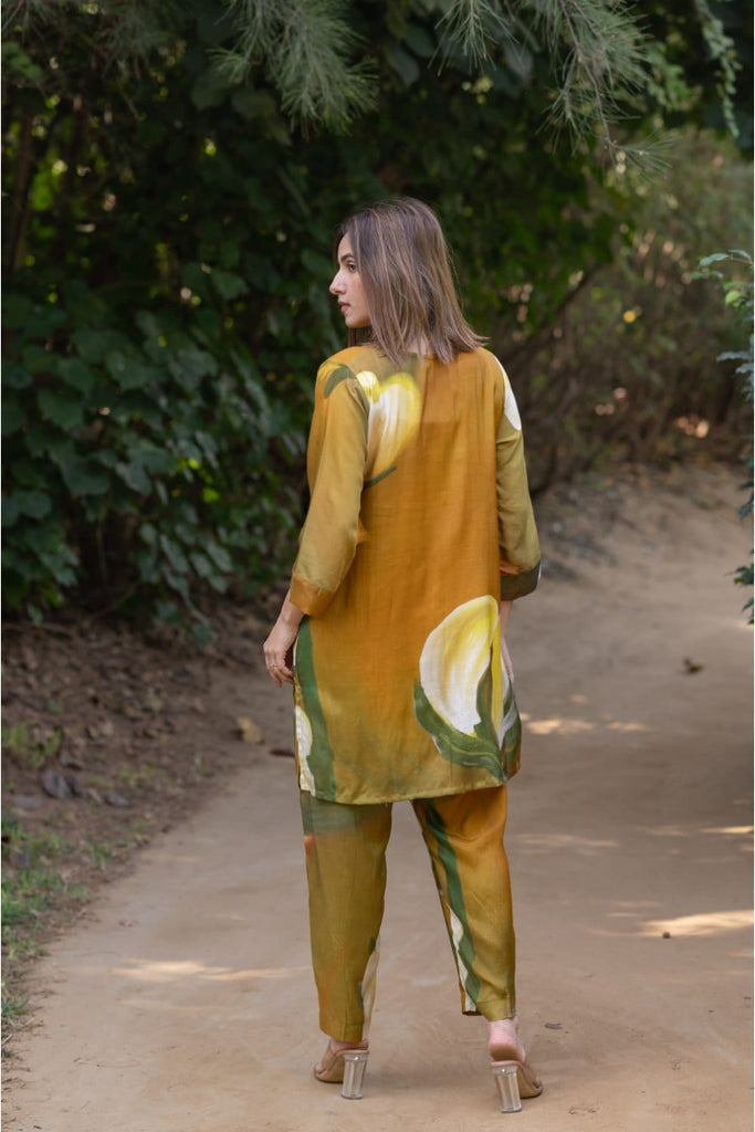 1. THIS SET INCLUDES KURTA AND PANTS. 2. OCHRE YELLOW COLOR KURTA WITH PANTS. . A.NECKLINE - VNECK B.SLEEVES - 3/4 SLEEVES 3. PANT - OCHRE YELLOW