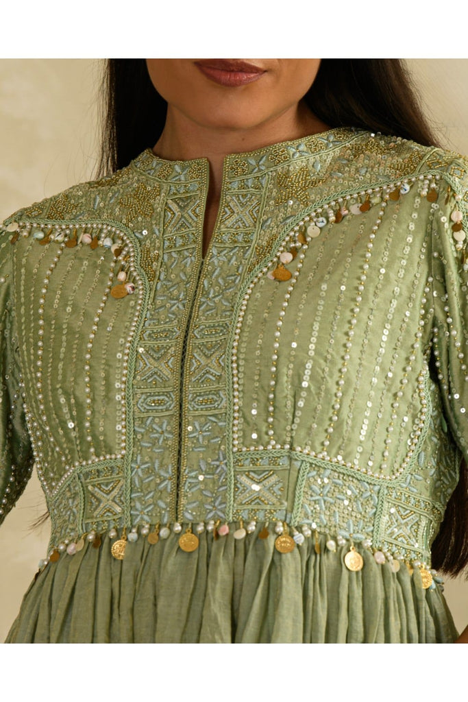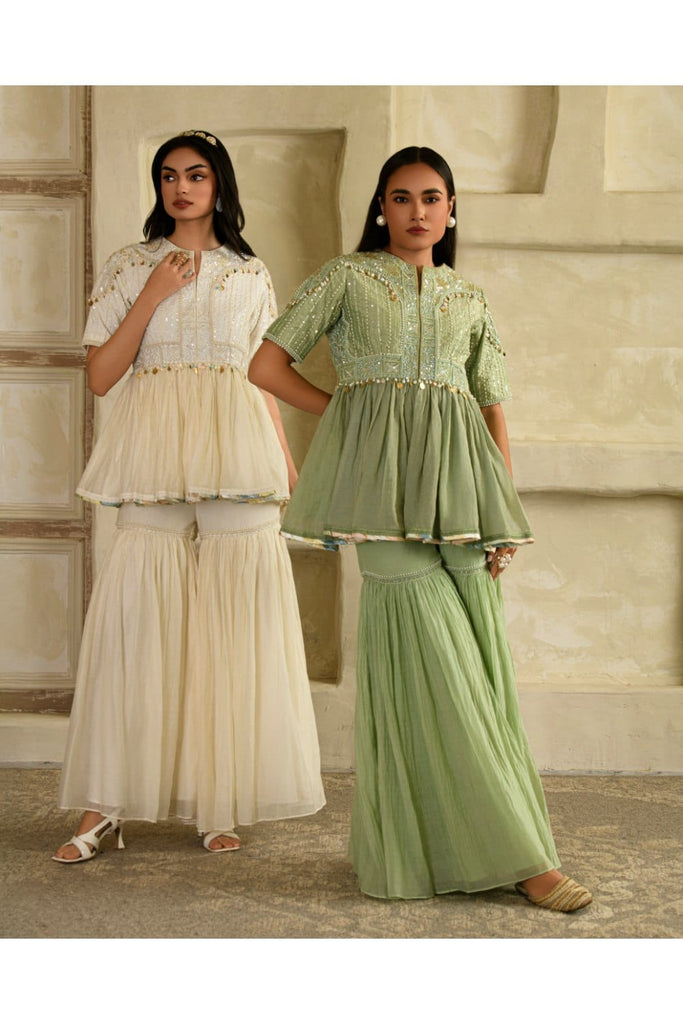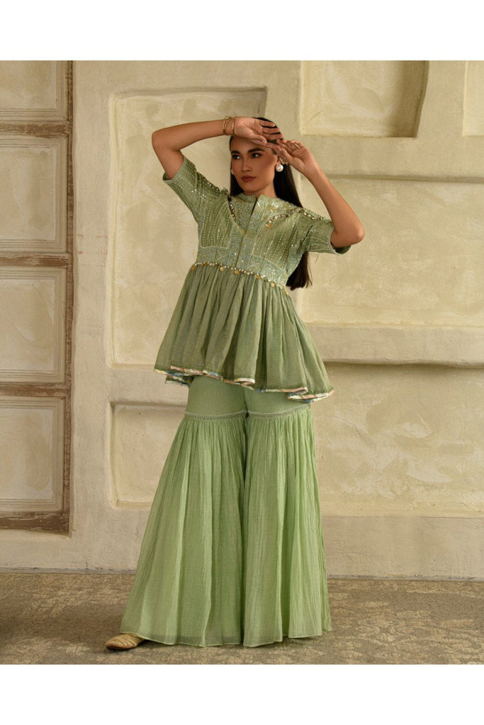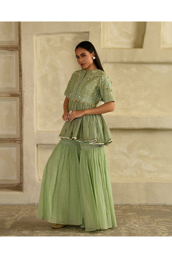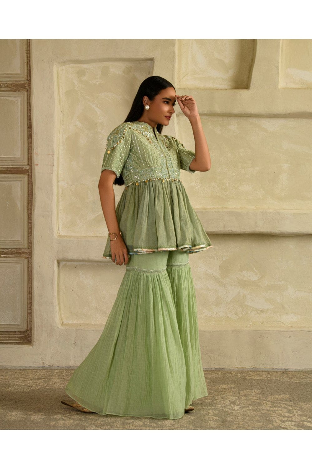 Featuring a pista green short peplum with an embellished yoke in mul chanderi tissue with coin & shell tassels and multicolor piping. It is paired with garara with hand embroidred details. This product will be exclusively handcrafted for you, making the colour/texture/pattern slightly vary from the image shown, due to multiple artisan-led techniques and processes involved. CARE : Dry Clean Only Never use plastic or regular cardboard boxes to store the saree, instead wrap it in a muslin cloth.