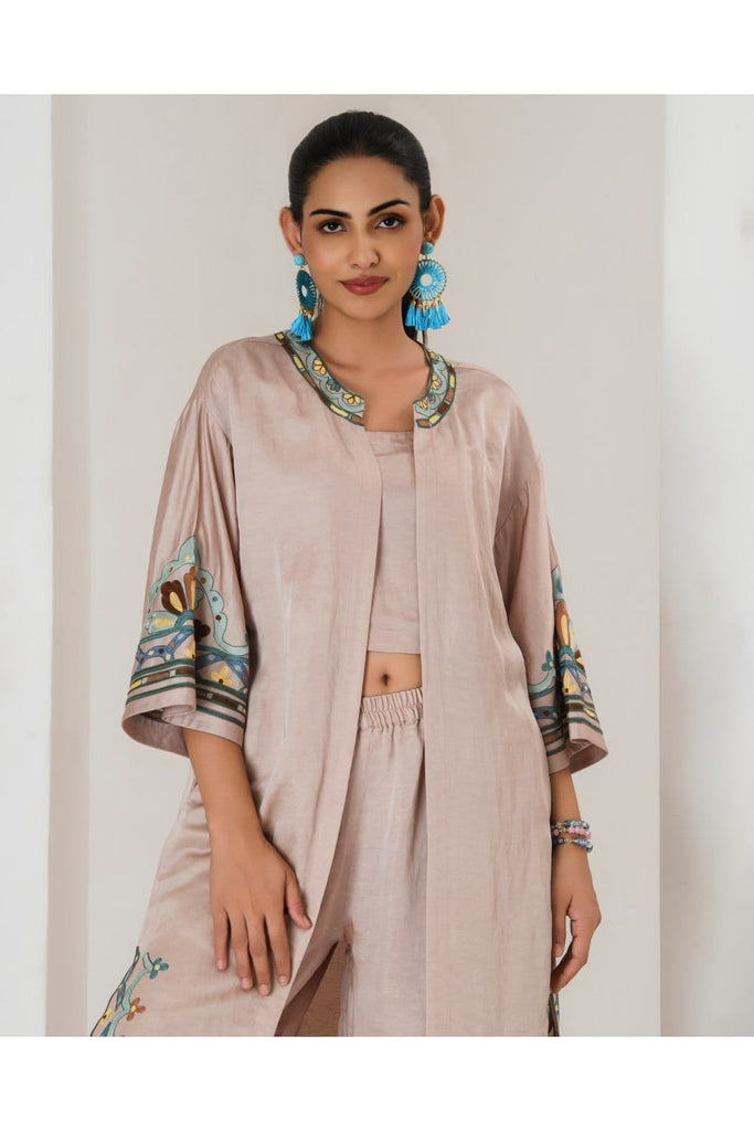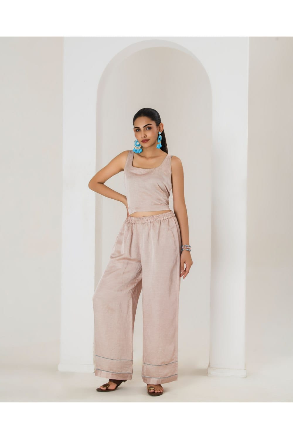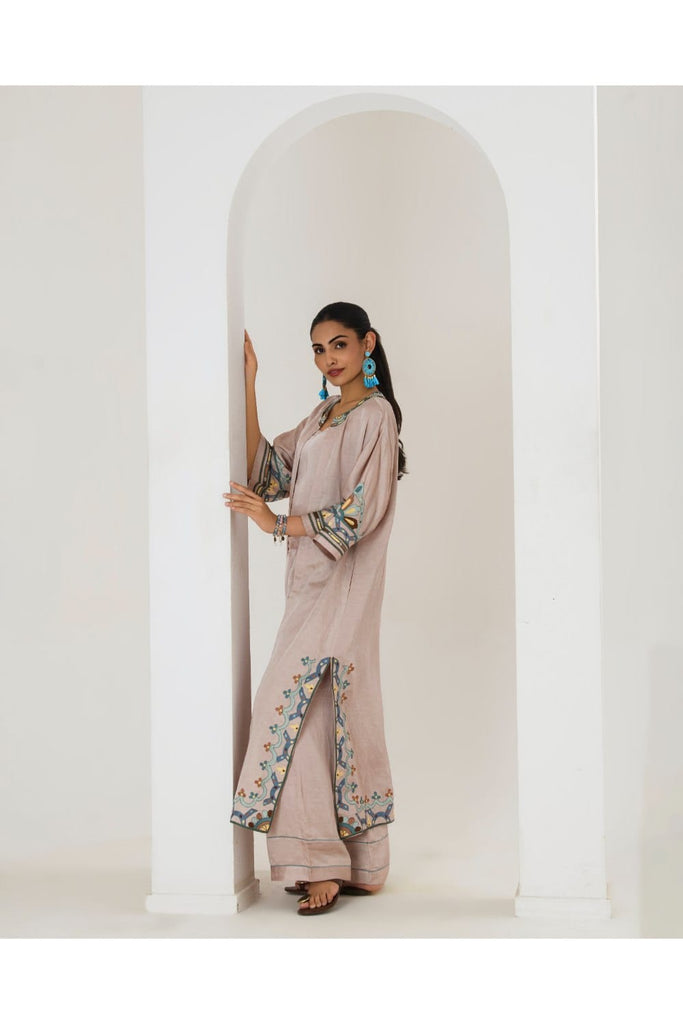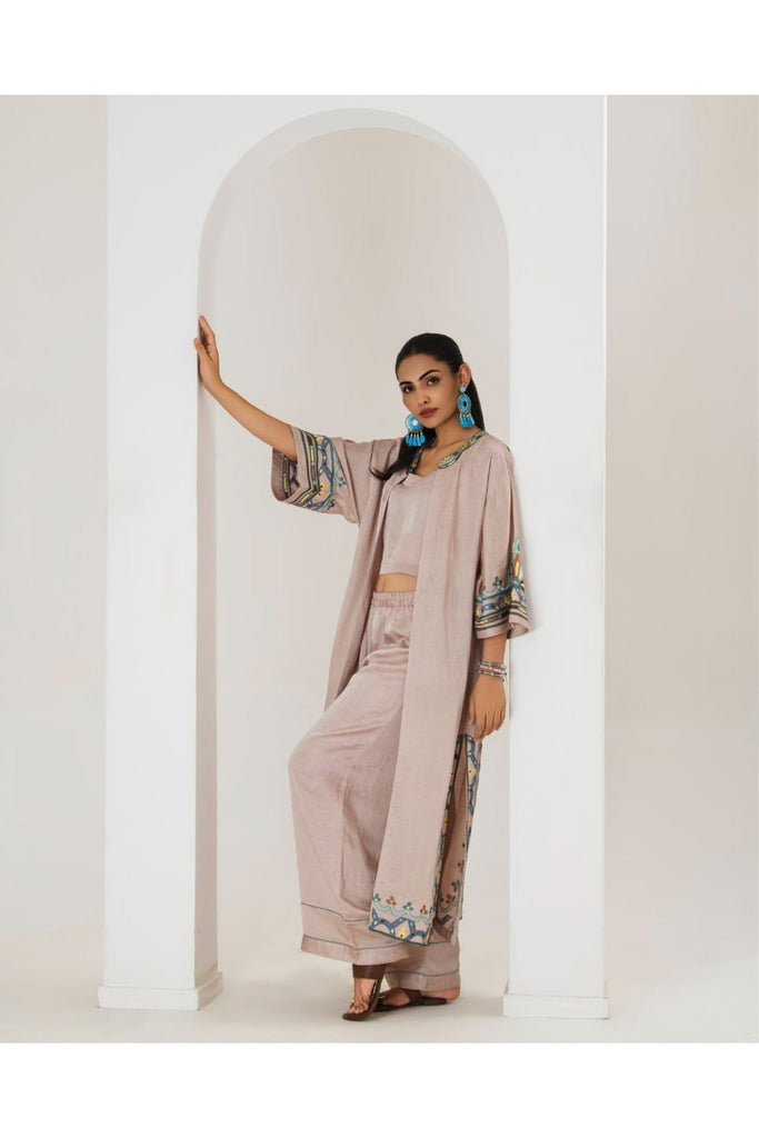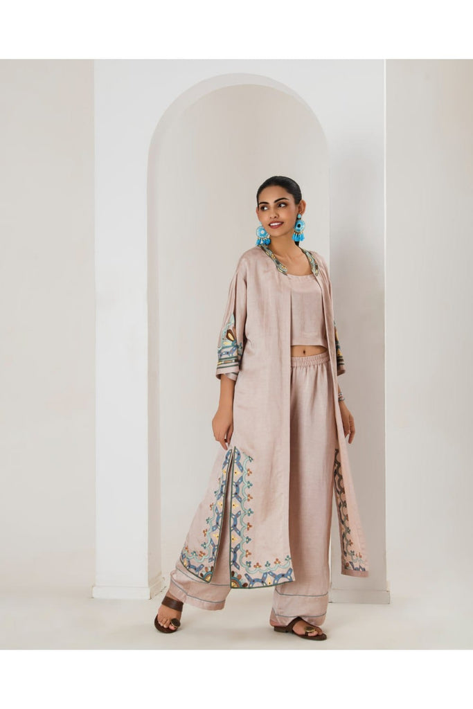 This ethereal three-piece ensemble in lustrous champagne satin linen includes a cropped sleeveless top, open-front overlay, and matching palazzo pants. Featuring intricate aari embroidery inspired by moroccan tile motifs along sleeves, hem, and neckline, it offers a modern, airy silhouette. Lightweight and breathable, it’s an effortless summer choice for any occasion. This product will be exclusively handcrafted for you, making the colour/texture/pattern slightly vary from the image shown, due to multiple artisan-led techniques and processes involved.