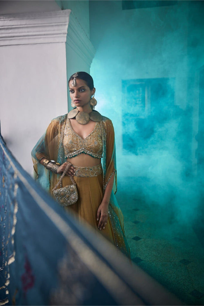 Featuring a yellow gold cape with turquoise highlights in organza base with dabka hand embroidery and mirror work. It is paired with a matching full hand embroidered blouse having tassels, and skirt with embroidered belt