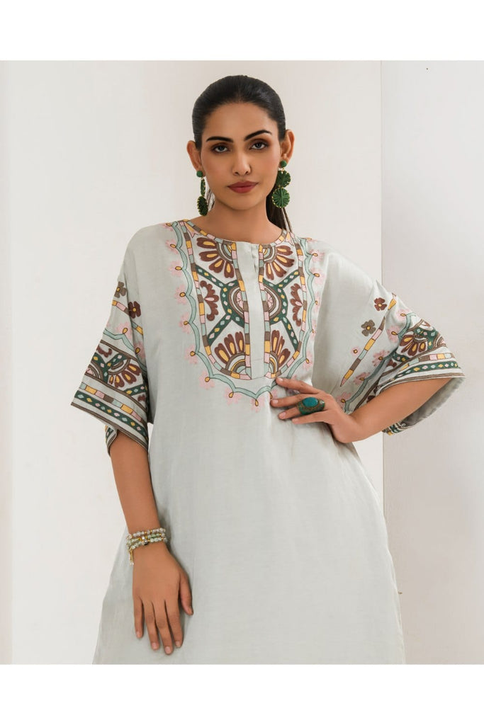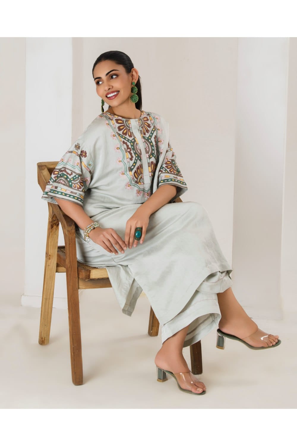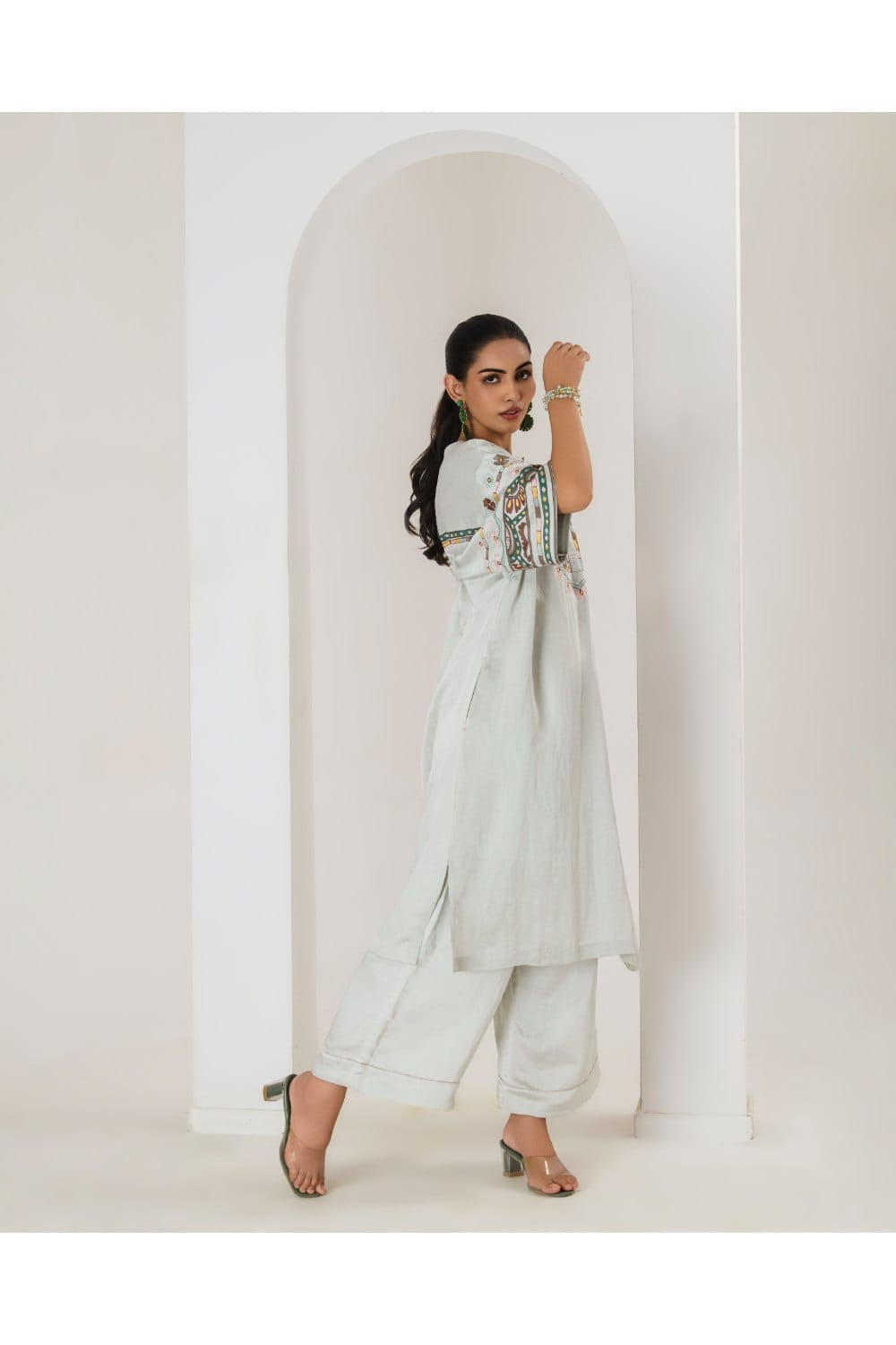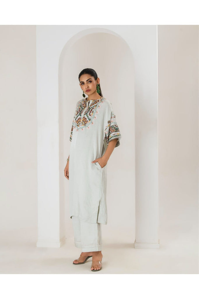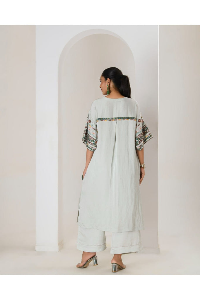 Our mint Maya Long Coord Set featuring intricate aari embroidery on luxurious satin linen fabrics is the ideal combination of elegance and comfort, setting a new benchmark in the world of casual wear. This product will be exclusively handcrafted for you, making the colour/texture/pattern slightly vary from the image shown, due to multiple artisan-led techniques and processes involved.