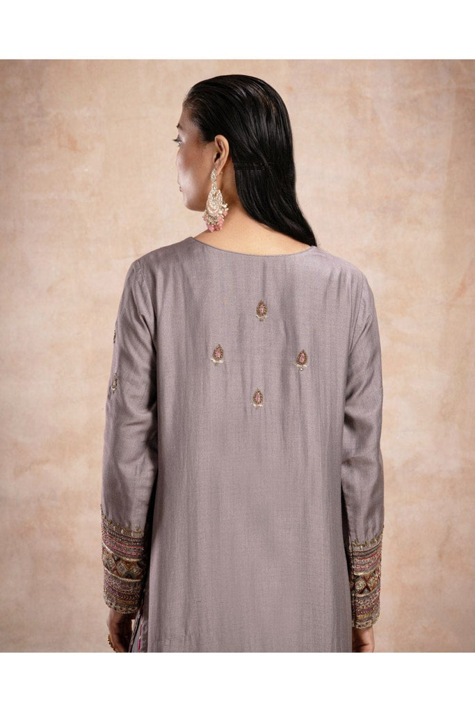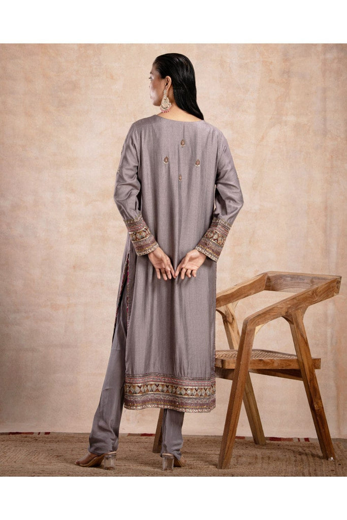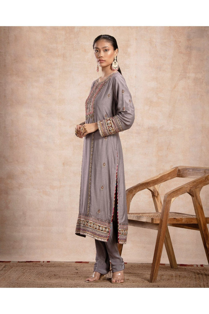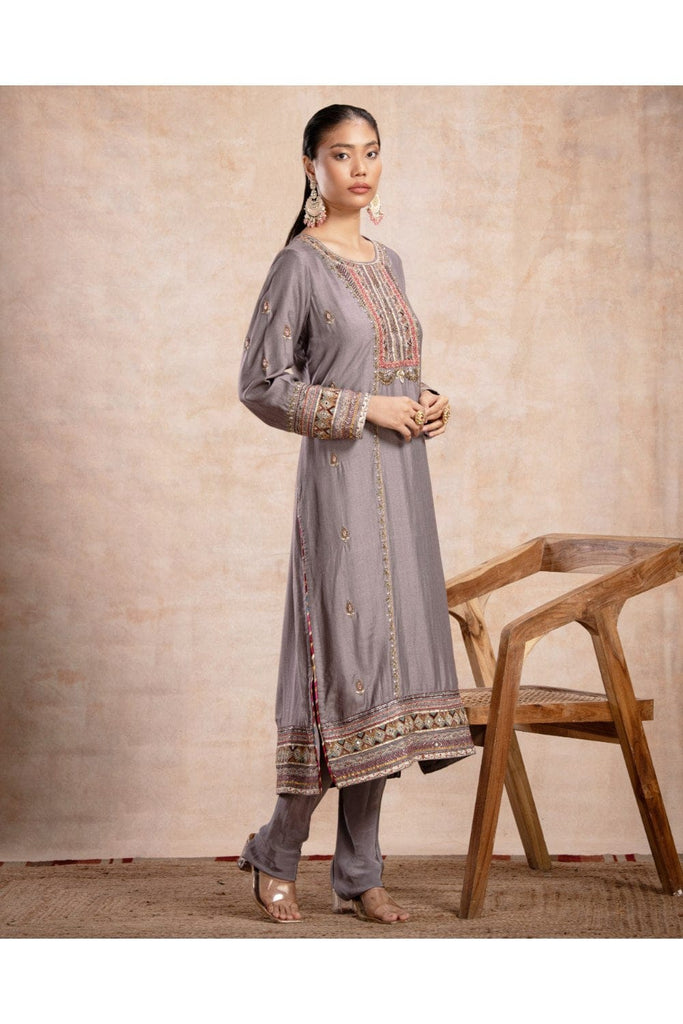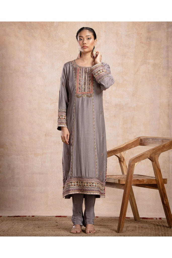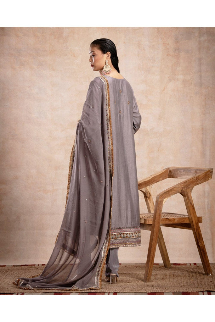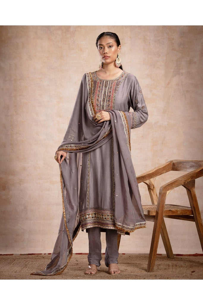 This grey straight kurta is crafted in tussar with zardosi work and an embellished yoke and multicolor piping .It is paired with crepe churidar and an organza dupatta with hand embroidery along with gold trimmings at the border