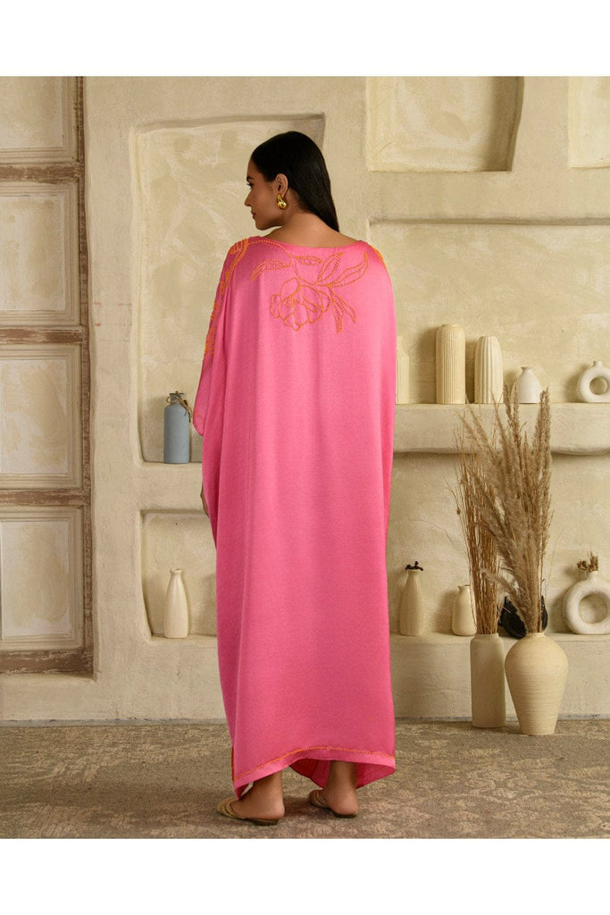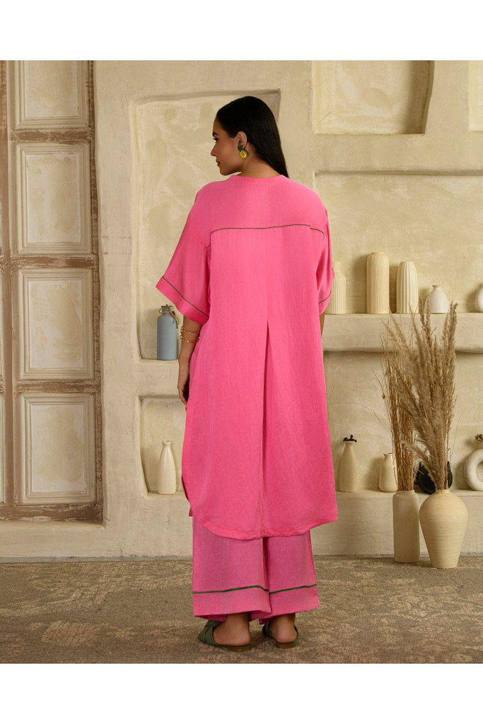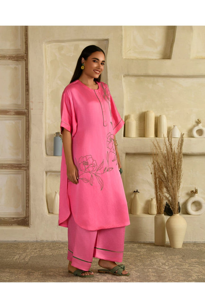 Elevate your style game with this sharbati pink co-ord set, designed to seamlessly blend comfort with elegance.The set features a long hand embroidered kurta with contrast pink bead work adorned with contrast pink piping along the edges The pants are flaired along with a pink piping at the hem with 2 pockets.This ensemble stands out for its eye-catching details and fluid silhouette. The intricate floral bead work add a touch of sophistication, making it a versatile choice for casual outings or understated evening affairs. This product will be exclusively handcrafted for you, making the colour/texture/pattern slightly vary from the image shown, due to multiple artisan-led techniques and processes involved. CARE : Dry Clean Only Never use plastic or regular cardboard boxes to store the garments, instead wrap it in a muslin cloth.