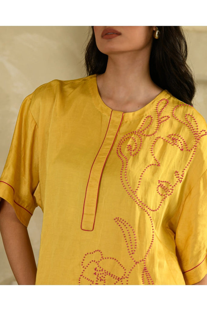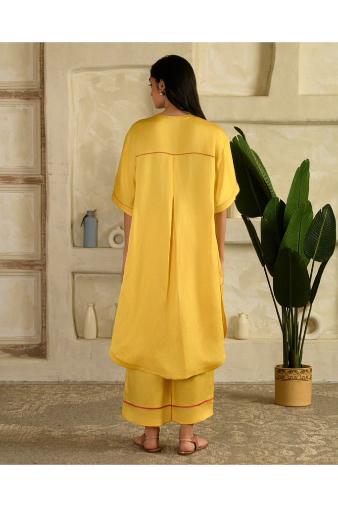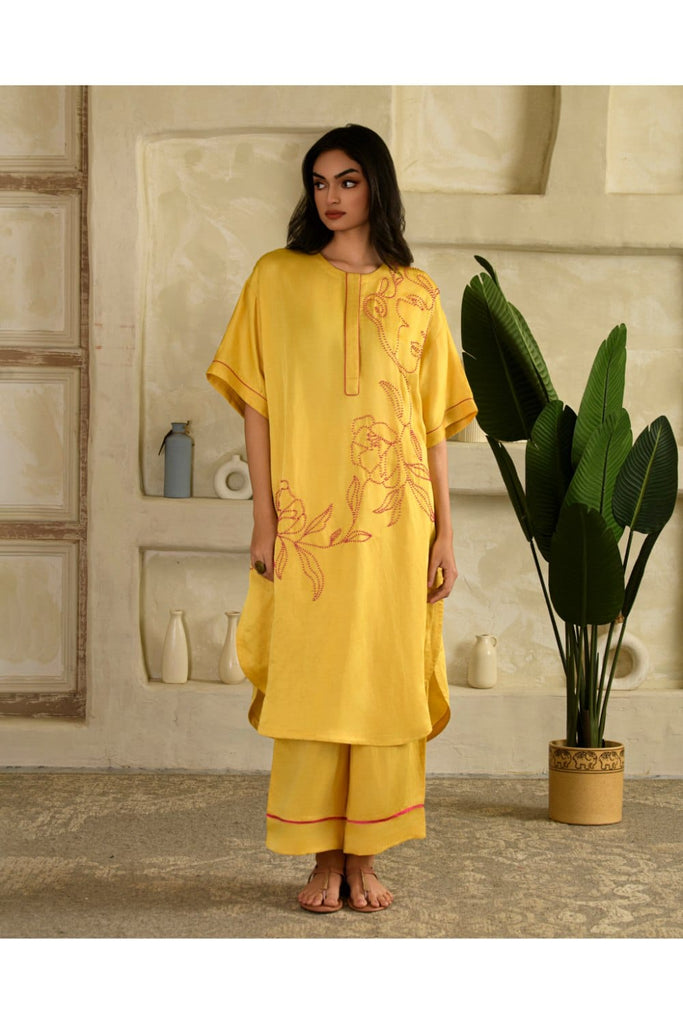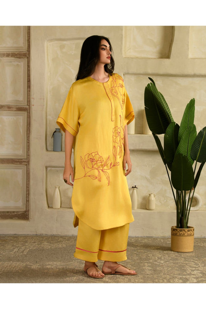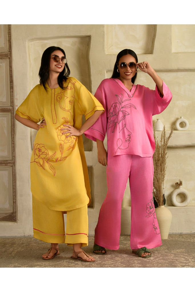 Elevate your style game with this surajmukhi yellow co-ord set, designed to seamlessly blend comfort with elegance.The set features a long hand embroidered kurta with contrast pink bead work adorned with contrast pink piping along the edges The pants are flaired along with a pink piping at the hem with 2 pockets.This ensemble stands out for its eye-catching details and fluid silhouette. The intricate floral bead work add a touch of sophistication, making it a versatile choice for casual outings or understated evening affairs. This product will be exclusively handcrafted for you, making the colour/texture/pattern slightly vary from the image shown, due to multiple artisan-led techniques and processes involved. CARE : Dry Clean Only Never use plastic or regular cardboard boxes to store the garments, instead wrap it in a muslin cloth.