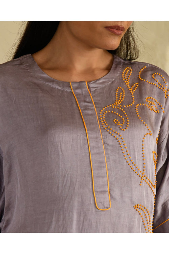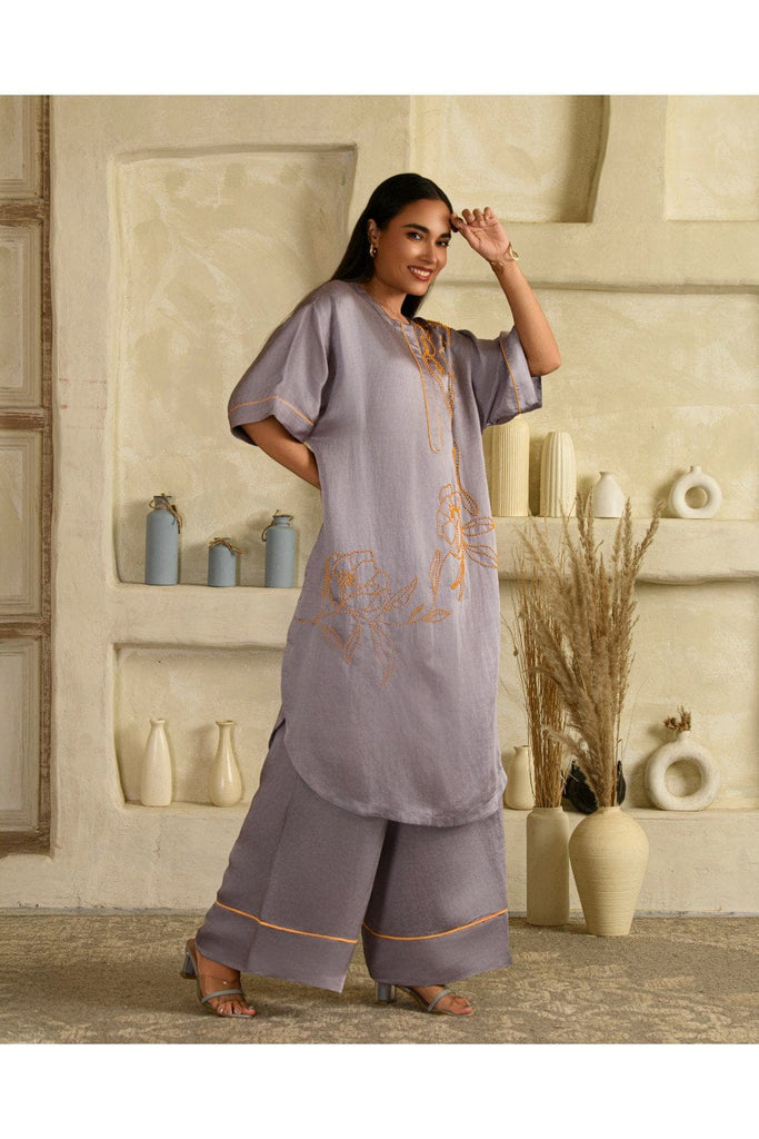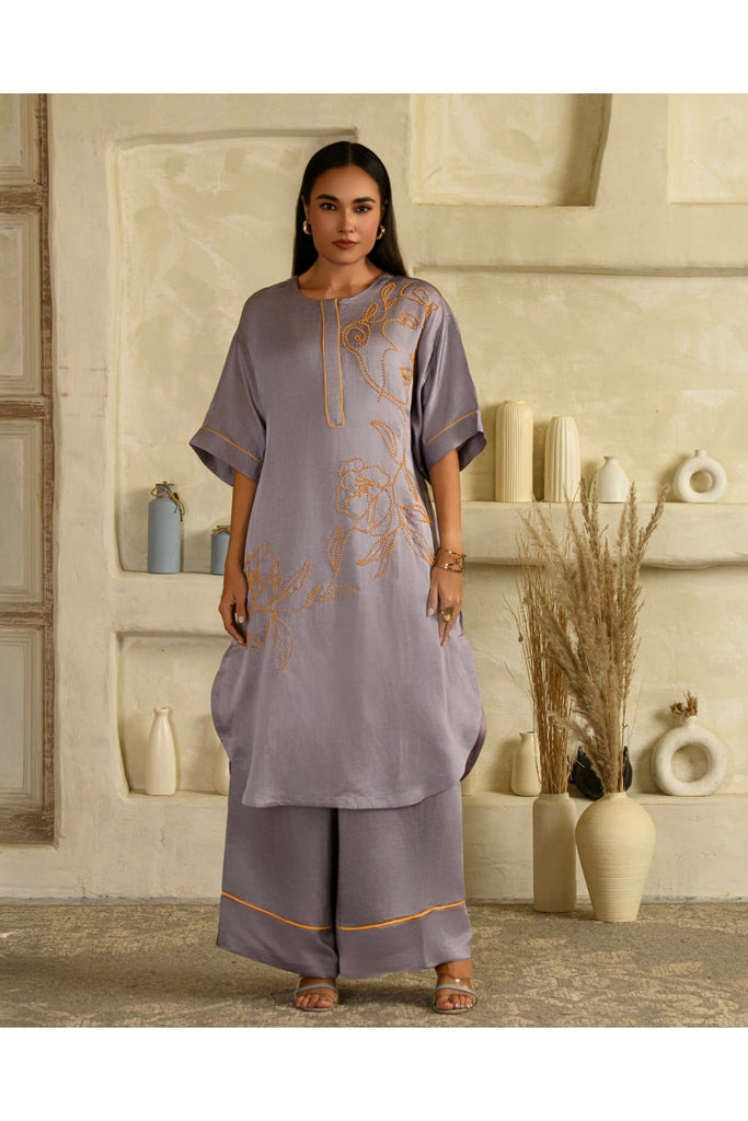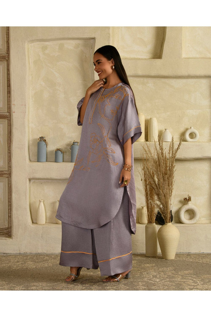 Elevate your style game with this tarangi lilac co-ord set, designed to seamlessly blend comfort with elegance.The set features a long hand embroidered kurta with contrast pink bead work adorned with contrast pink piping along the edges The pants are flaired along with a pink piping at the hem with 2 pockets.This ensemble stands out for its eye-catching details and fluid silhouette. The intricate floral bead work add a touch of sophistication, making it a versatile choice for casual outings or understated evening affairs. This product will be exclusively handcrafted for you, making the colour/texture/pattern slightly vary from the image shown, due to multiple artisan-led techniques and processes involved. CARE : Dry Clean Only Never use plastic or regular cardboard boxes to store the garments, instead wrap it in a muslin cloth.