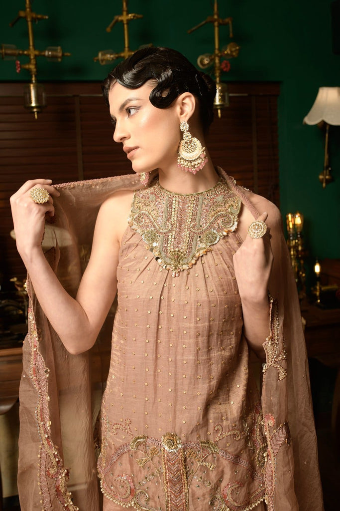 Featuring a dirty blush short halter tunic with an embellished yoke and border in chanderi silk tissue fabric . It is paired with garara which is layered with textured textiles , pintuck pleats and laces and a matching hand ebroidered dupatta