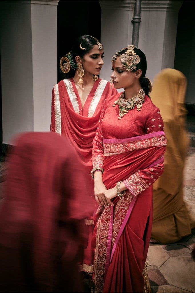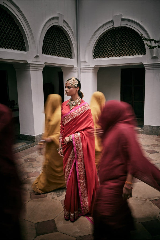 Introducing the stunning sindoori red moonga tussar saree that boasts a soft and luxurious texture that drapes beautifully over the body. The saree is accentuated by intricate zardosi and pita work pattern that runs throughout the borders.