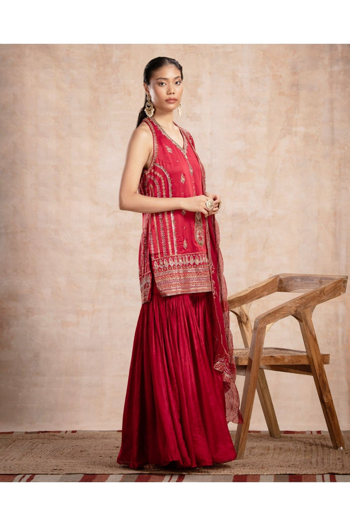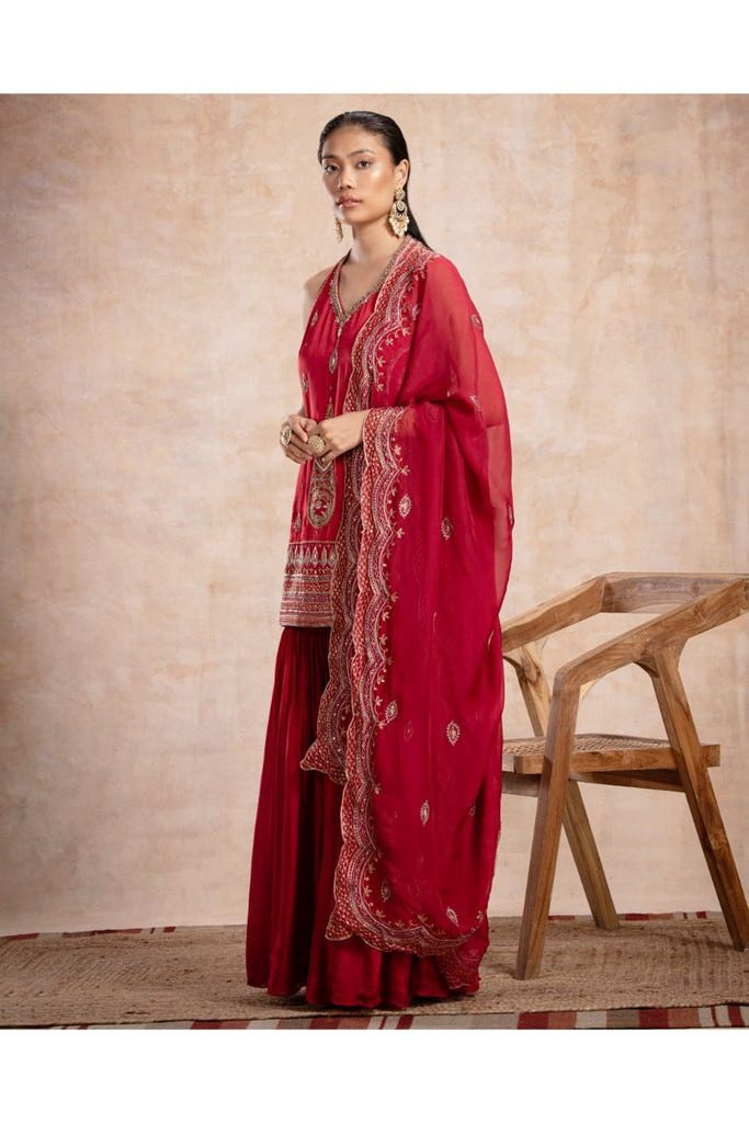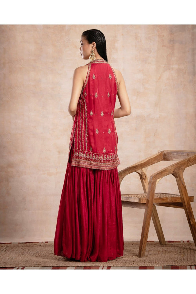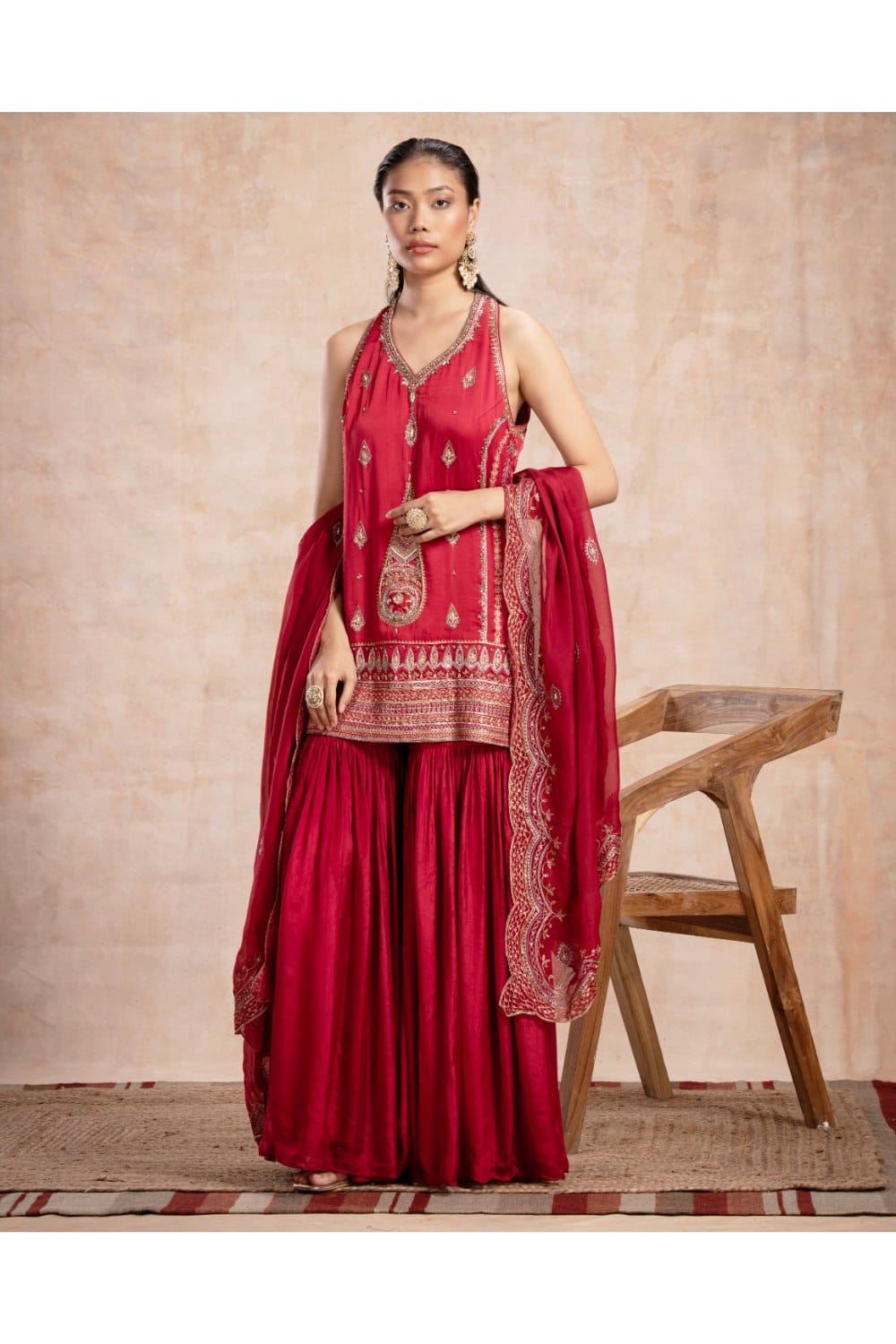 Fall for the intricate details with this sindoori aari work modal halter neckline kurta with garara and dupatta.The jamuni kurta comes with aari and zardozi work.This kurta is paired with matching silk garara .This set is complimented with a organza dupatta with delicate hand embroidery