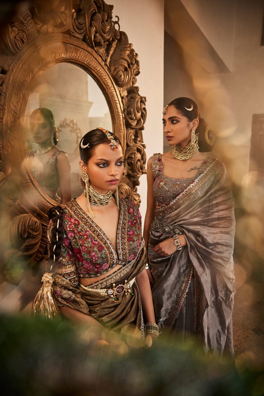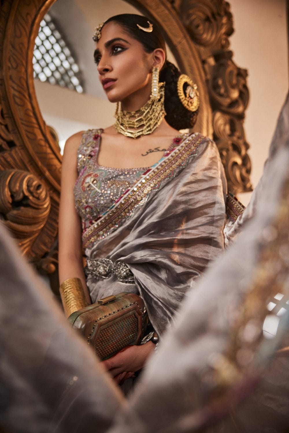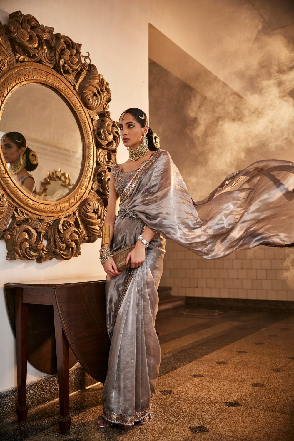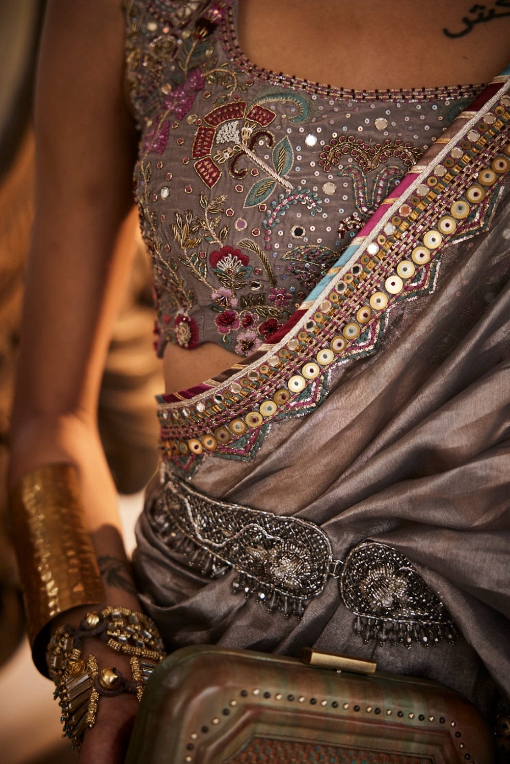 Featuring a grey saree in handloom tissue silk base with floral zardozi and sequin work on the border. It is paired with a blouse which has embroidery using colorful resham in floral design, further highlighted with zari and cut dana work. This product will be exclusively handcrafted for you, making the colour/texture/pattern slightly vary from the image shown, due to multiple artisan-led techniques and processes involved.