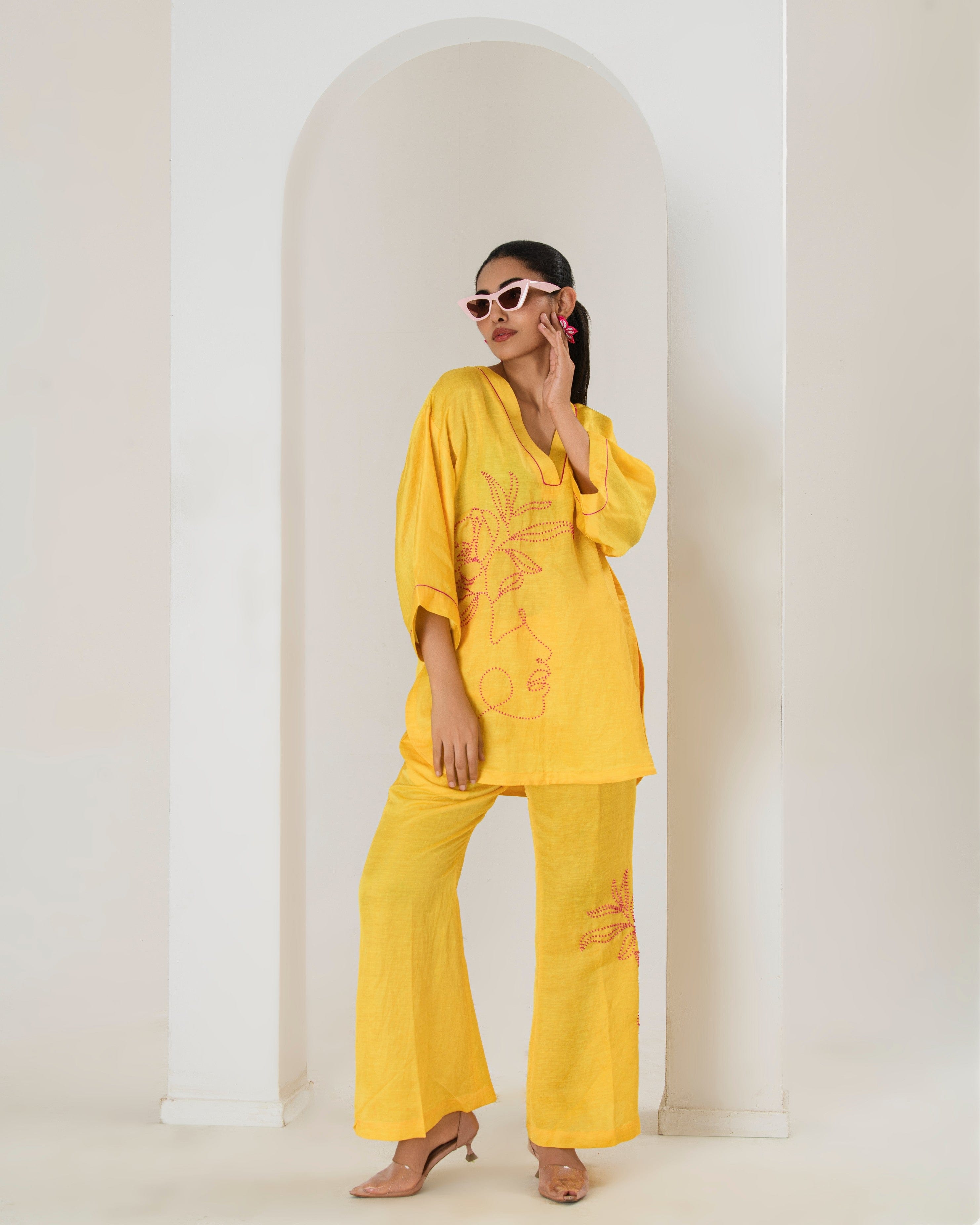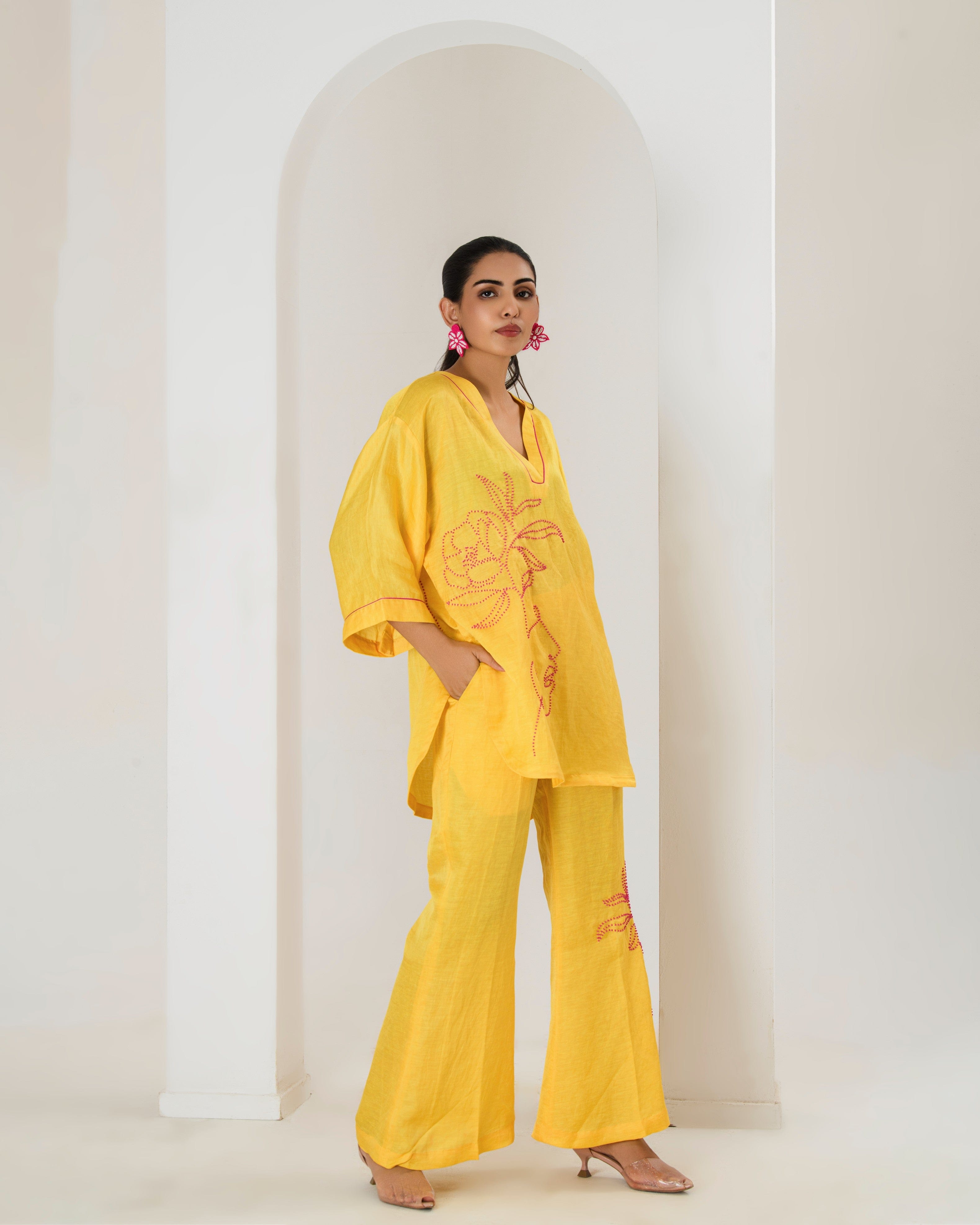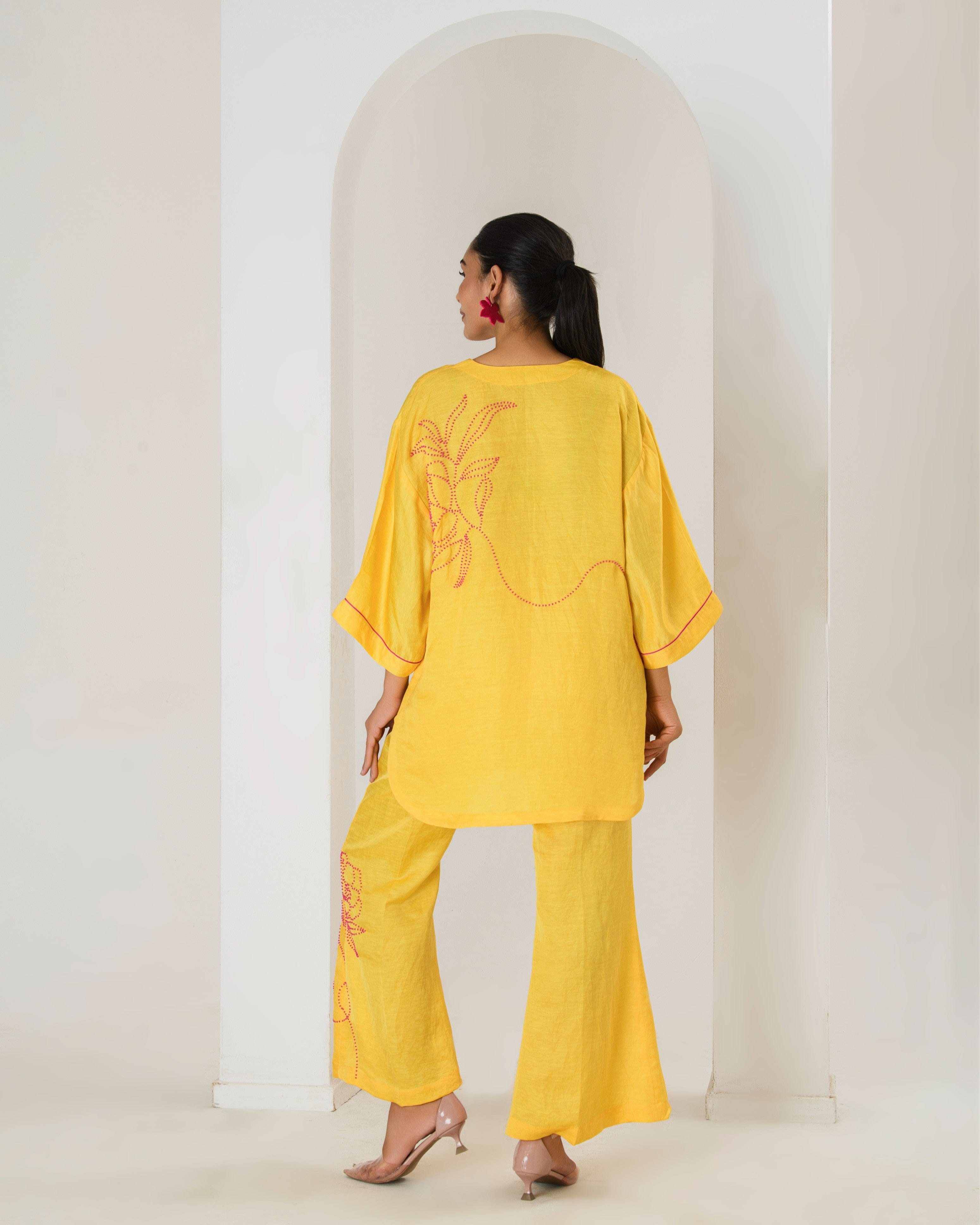 Elevate your style game with this surajmukhi yellow co-ord set, designed to seamlessly blend comfort with elegance.The set features a short hand embroidered kurta with contrast pink bead work adorned with bell bottom pants with bead work This product will be exclusively handcrafted for you, making the colour/texture/pattern slightly vary from the image shown, due to multiple artisan-led techniques and processes involved.