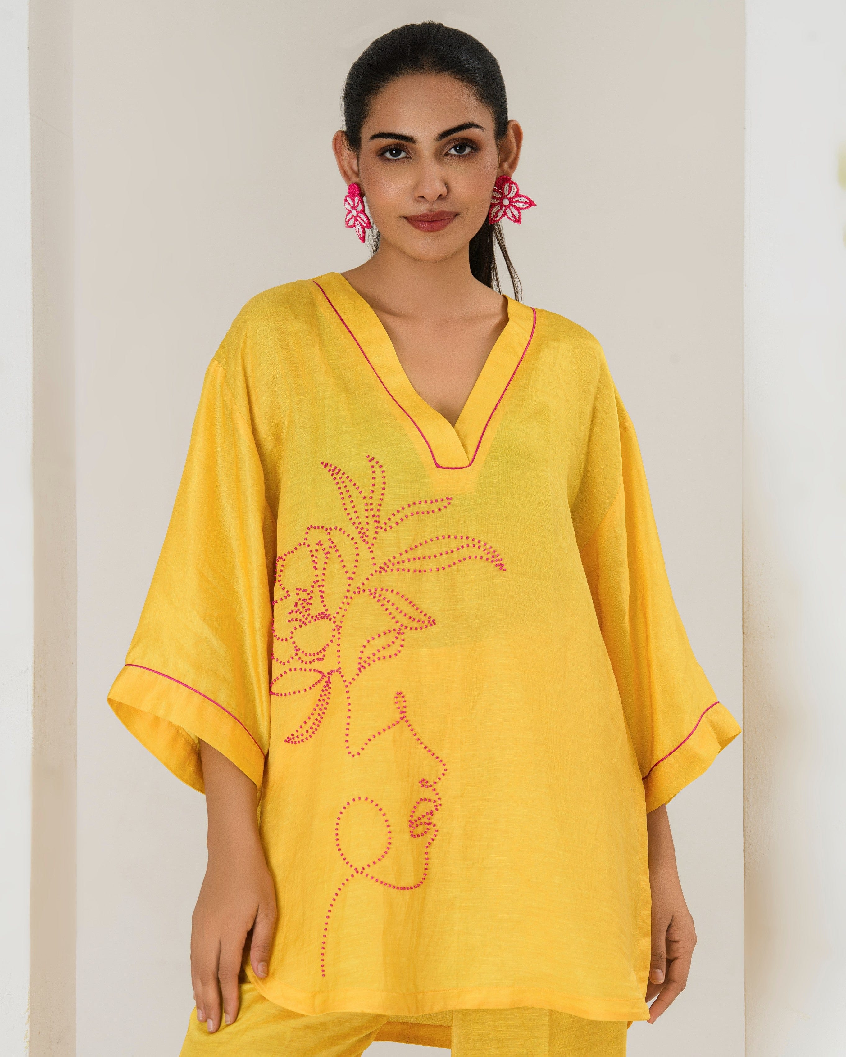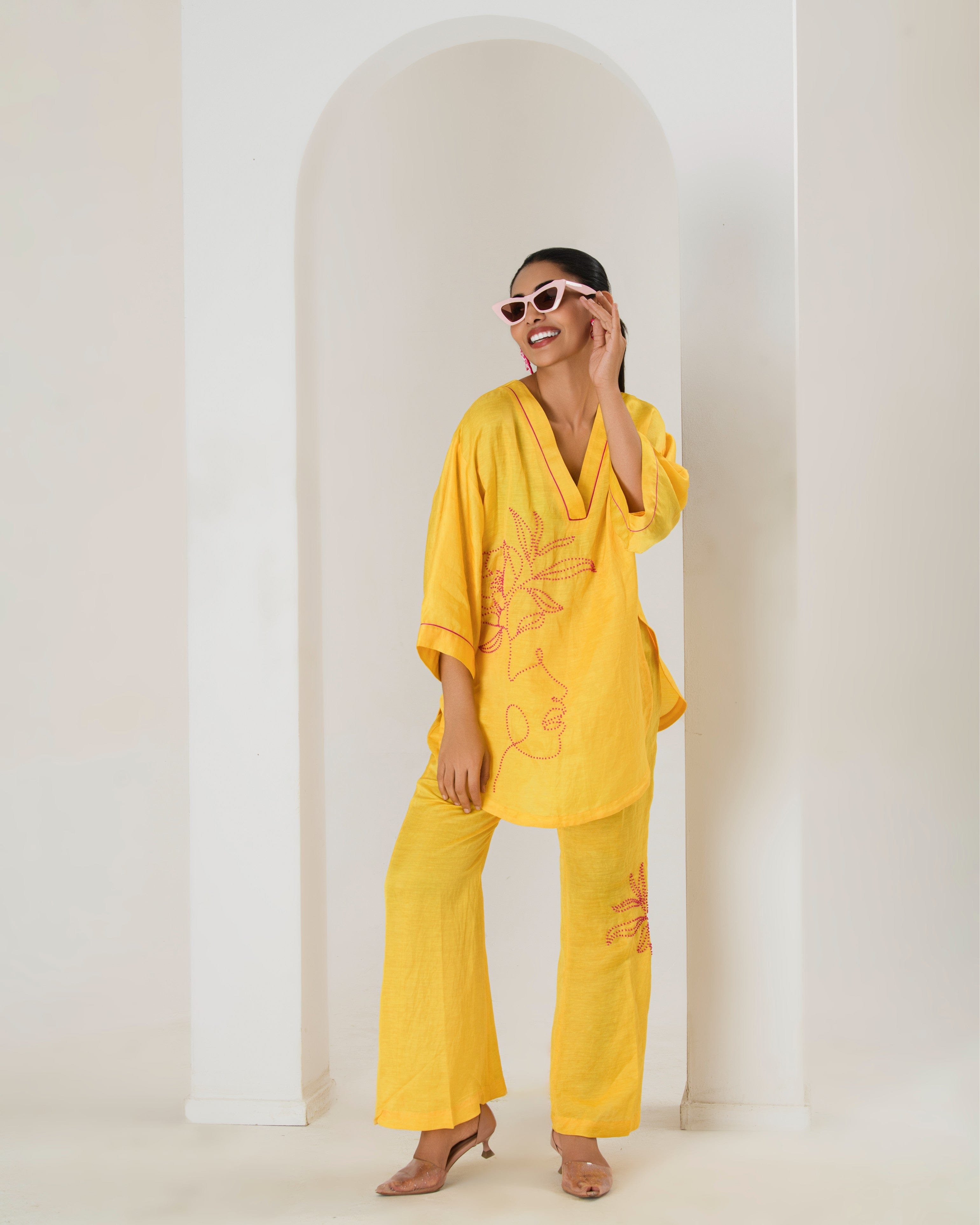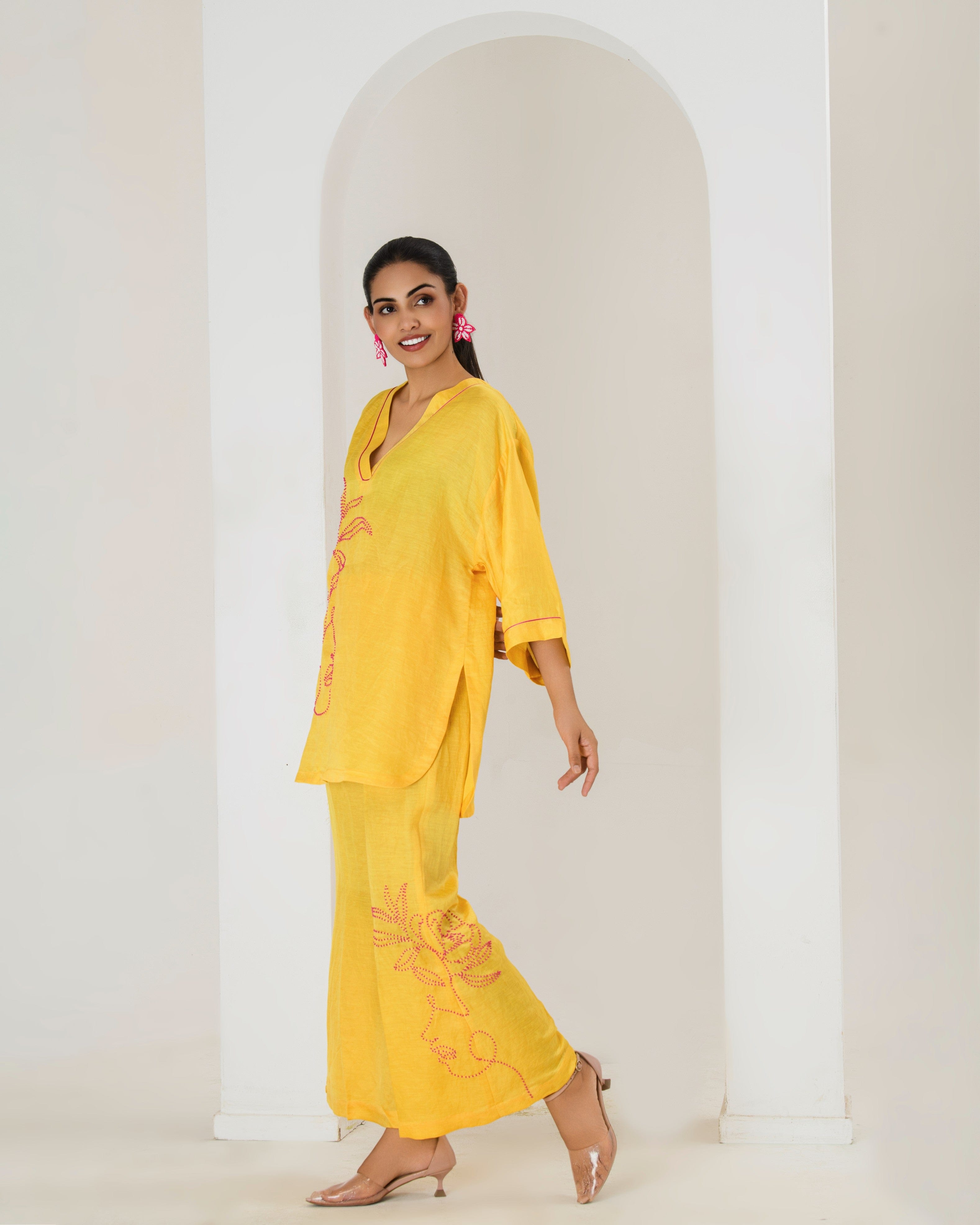 Elevate your style game with this surajmukhi yellow co-ord set, designed to seamlessly blend comfort with elegance.The set features a short hand embroidered kurta with contrast pink bead work adorned with bell bottom pants with bead work This product will be exclusively handcrafted for you, making the colour/texture/pattern slightly vary from the image shown, due to multiple artisan-led techniques and processes involved.