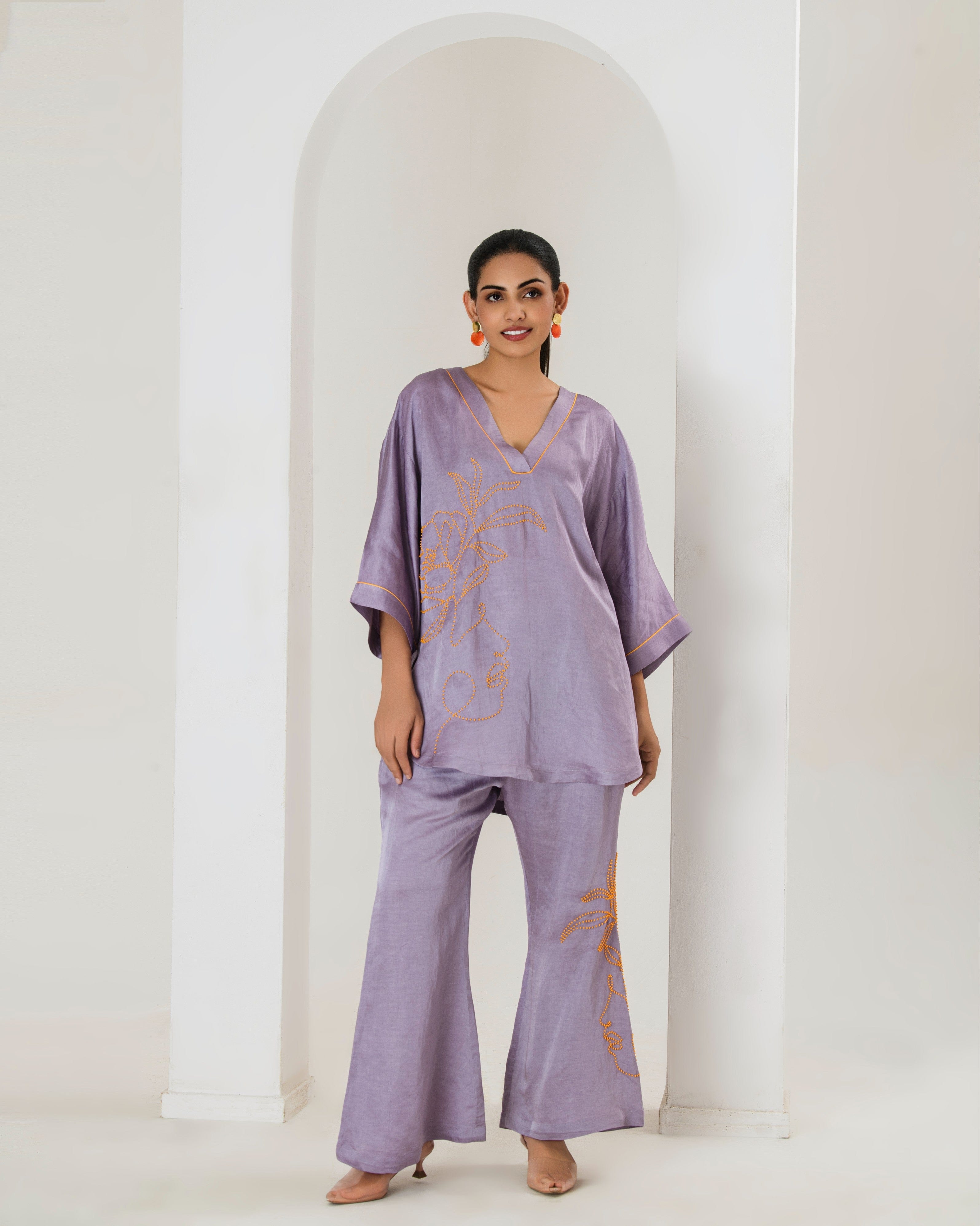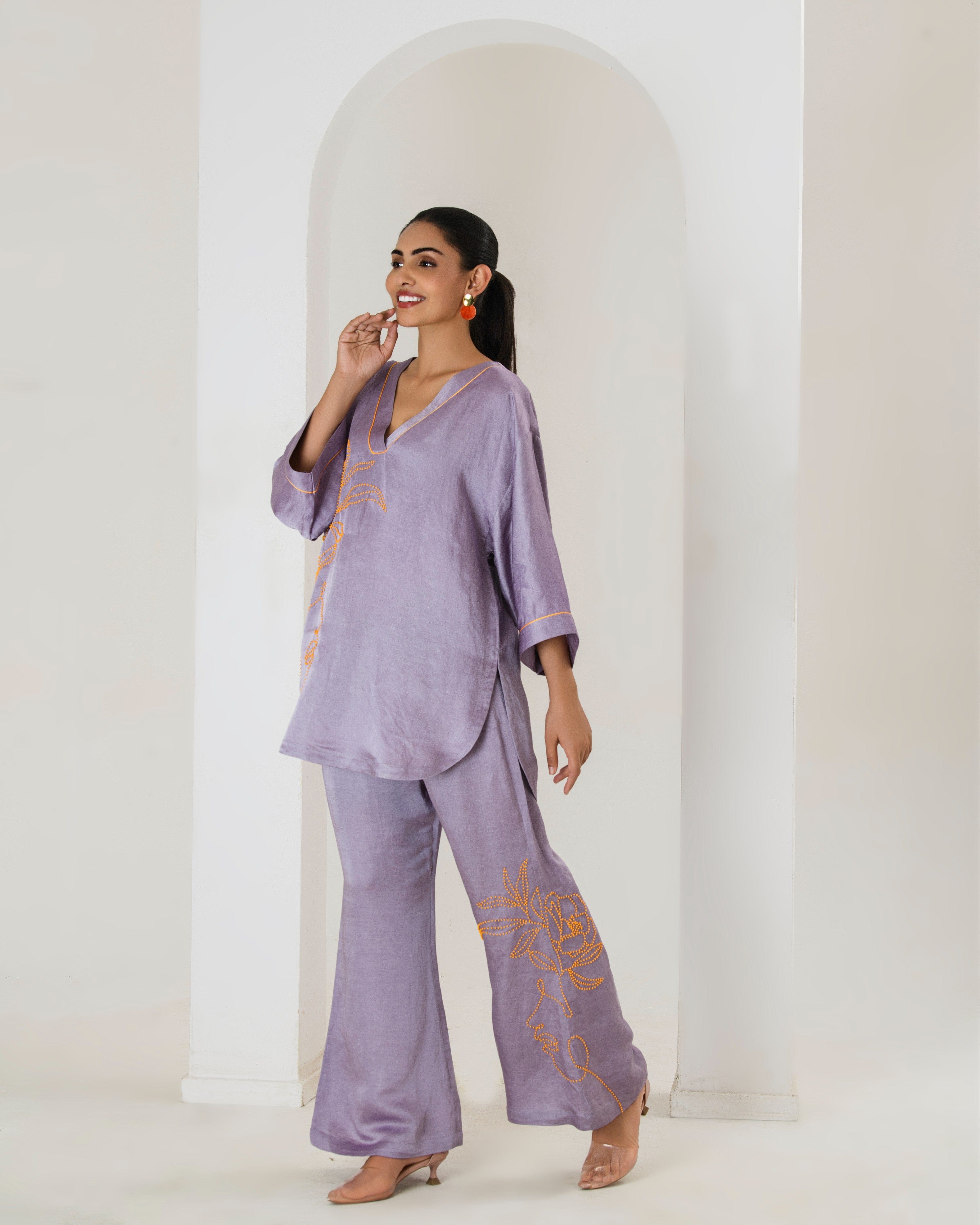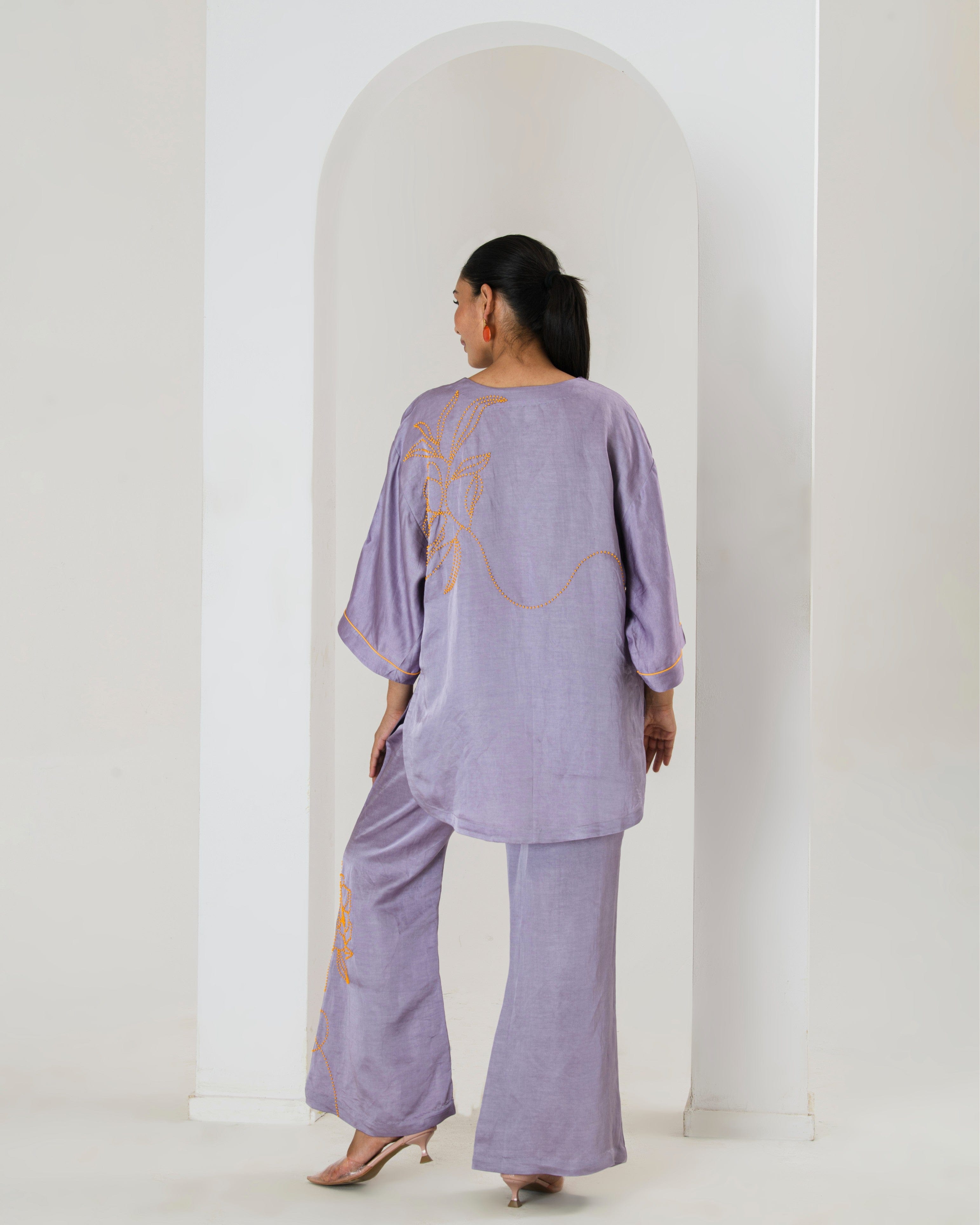 Elevate your style game with this tarangi lilac co-ord set, designed to seamlessly blend comfort with elegance.The set features a short hand embroidered kurta with contrast orange bead work adorned with bell bottom pants with bead work This product will be exclusively handcrafted for you, making the colour/texture/pattern slightly vary from the image shown, due to multiple artisan-led techniques and processes involved.