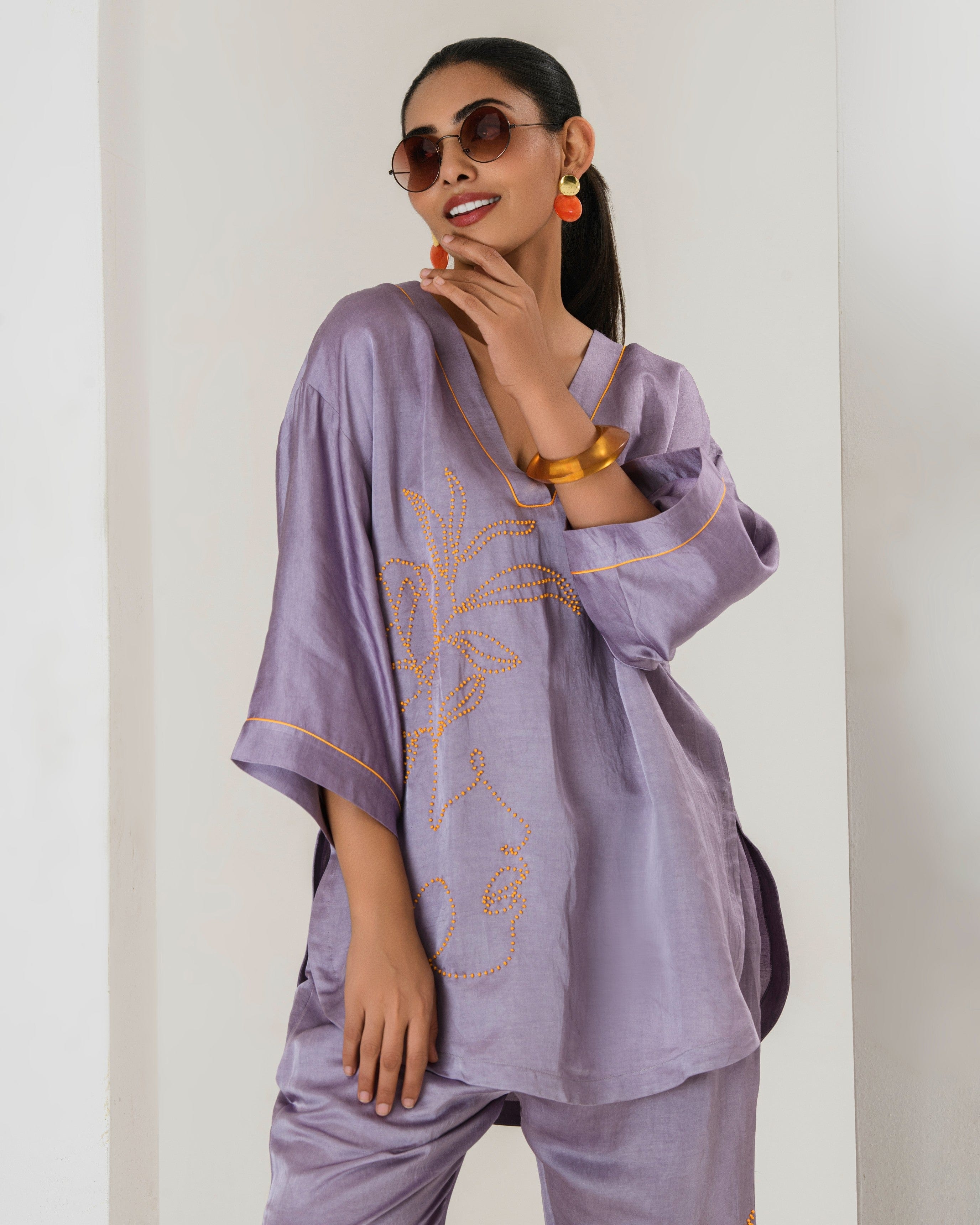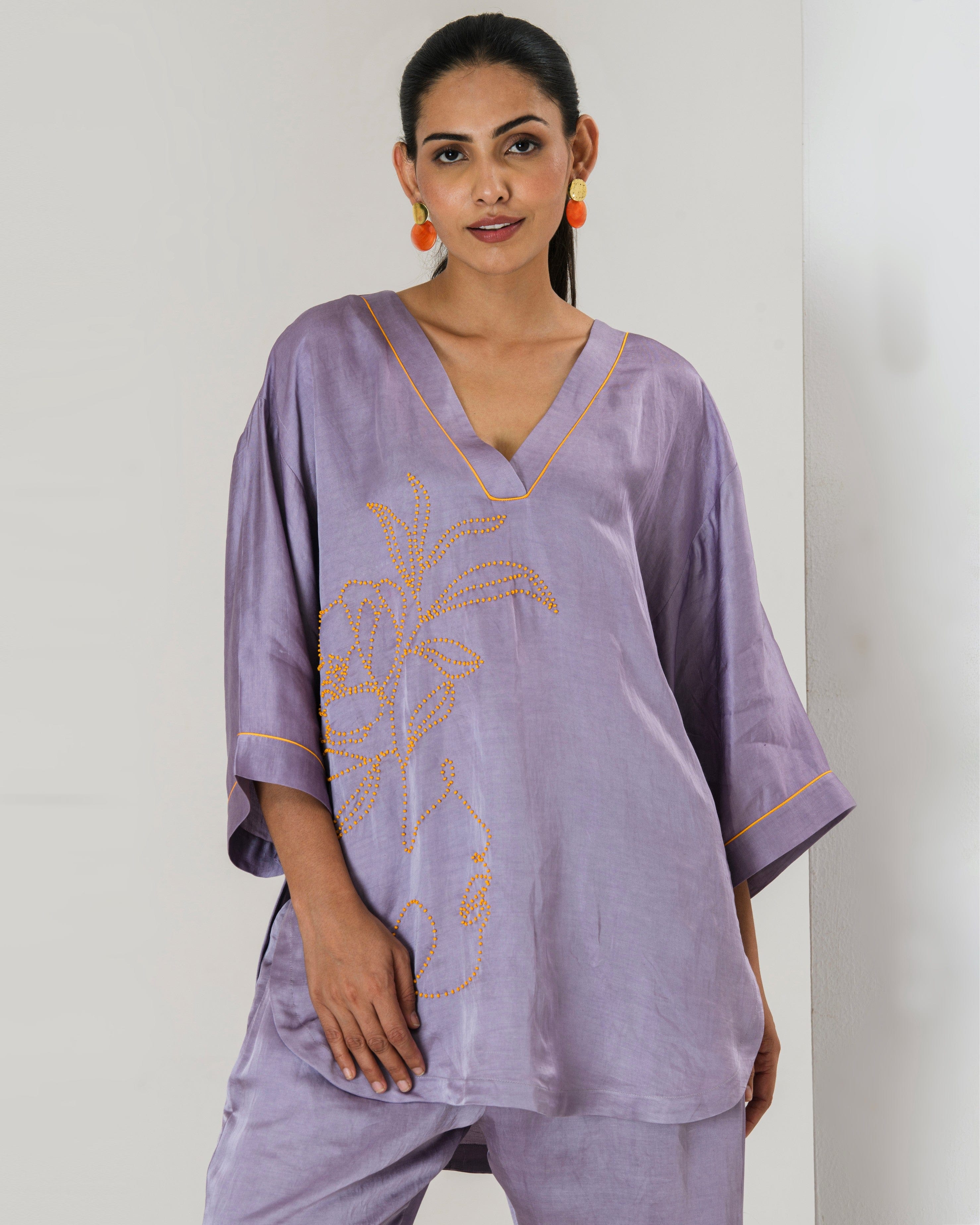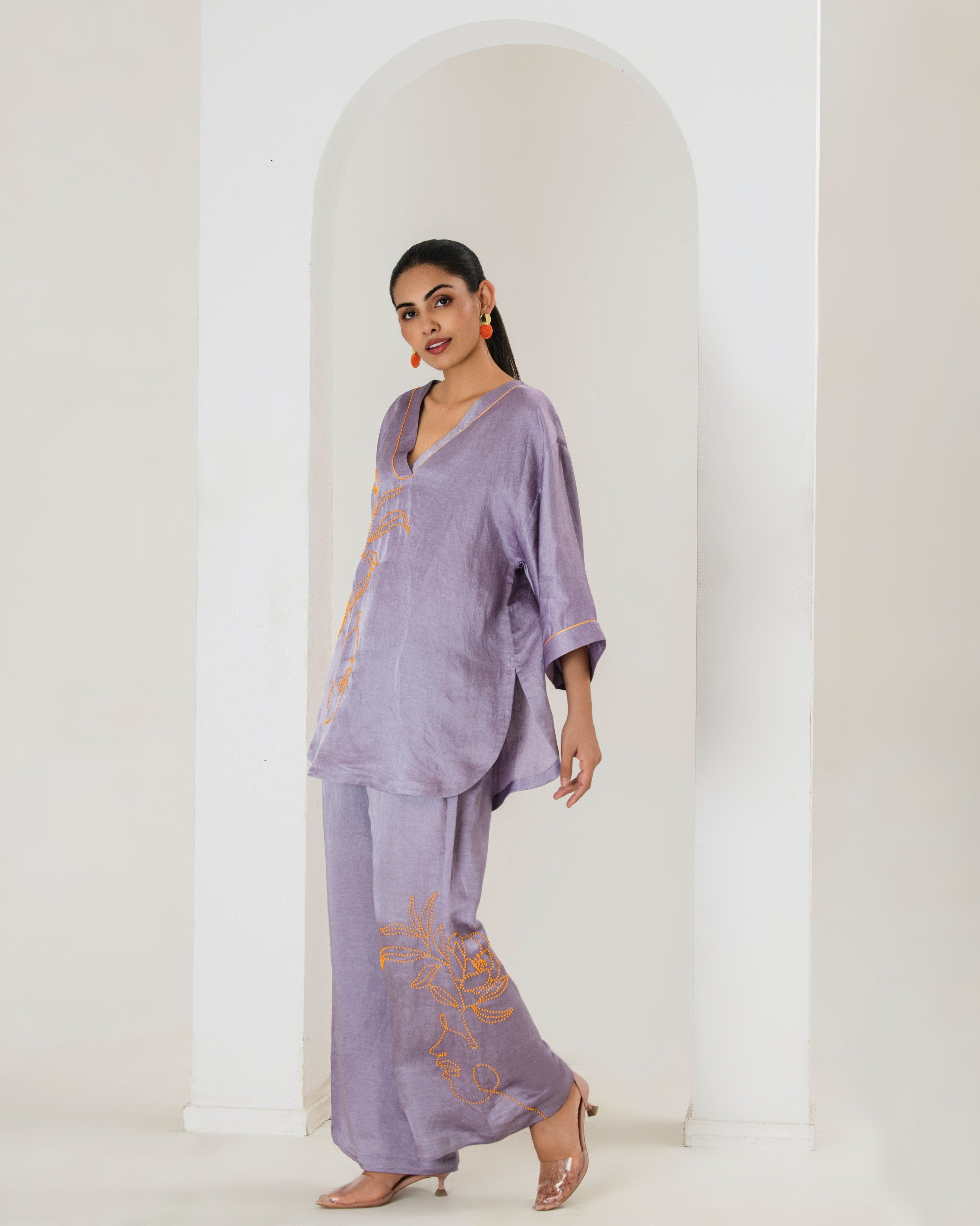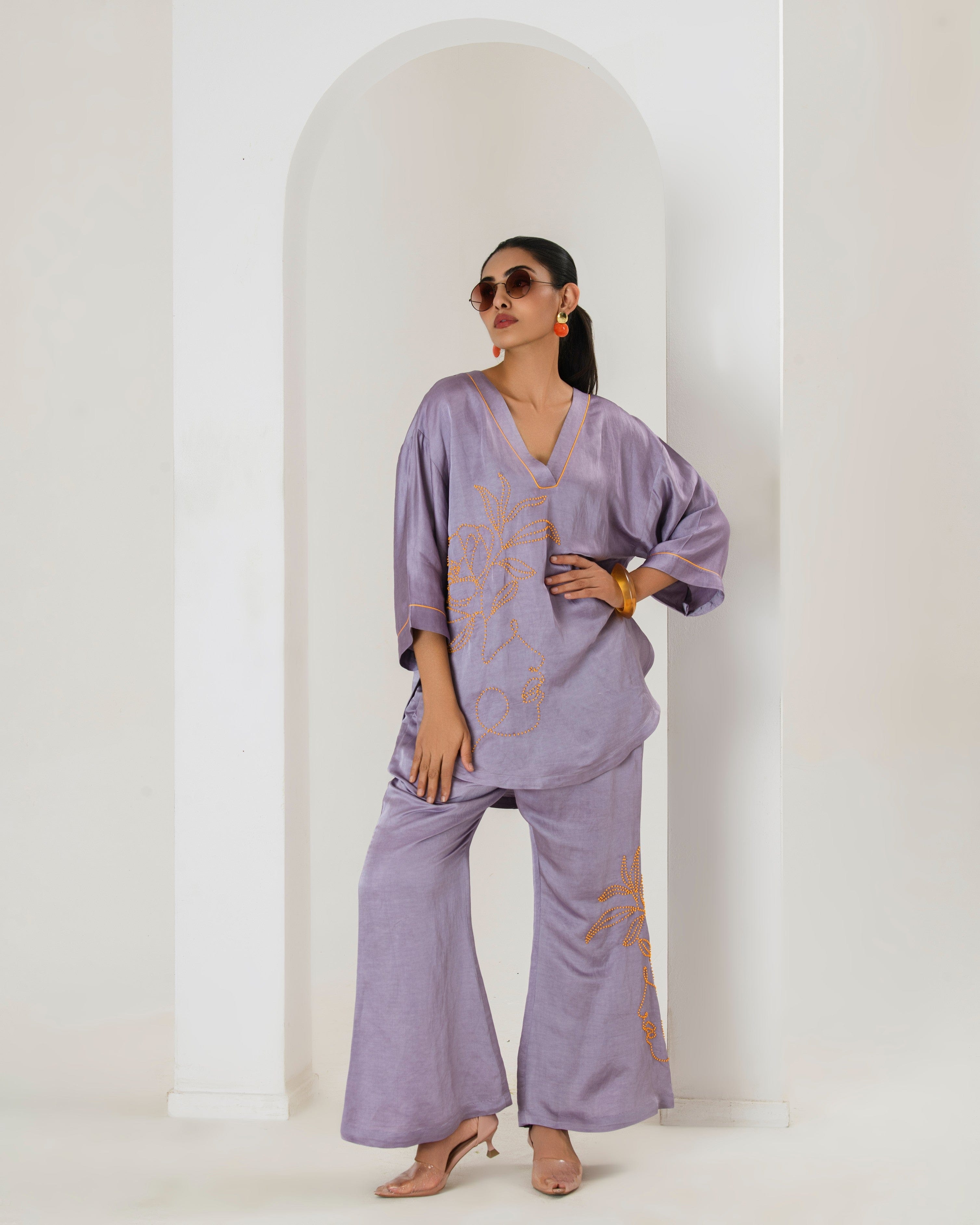 Elevate your style game with this tarangi lilac co-ord set, designed to seamlessly blend comfort with elegance.The set features a short hand embroidered kurta with contrast orange bead work adorned with bell bottom pants with bead work This product will be exclusively handcrafted for you, making the colour/texture/pattern slightly vary from the image shown, due to multiple artisan-led techniques and processes involved.