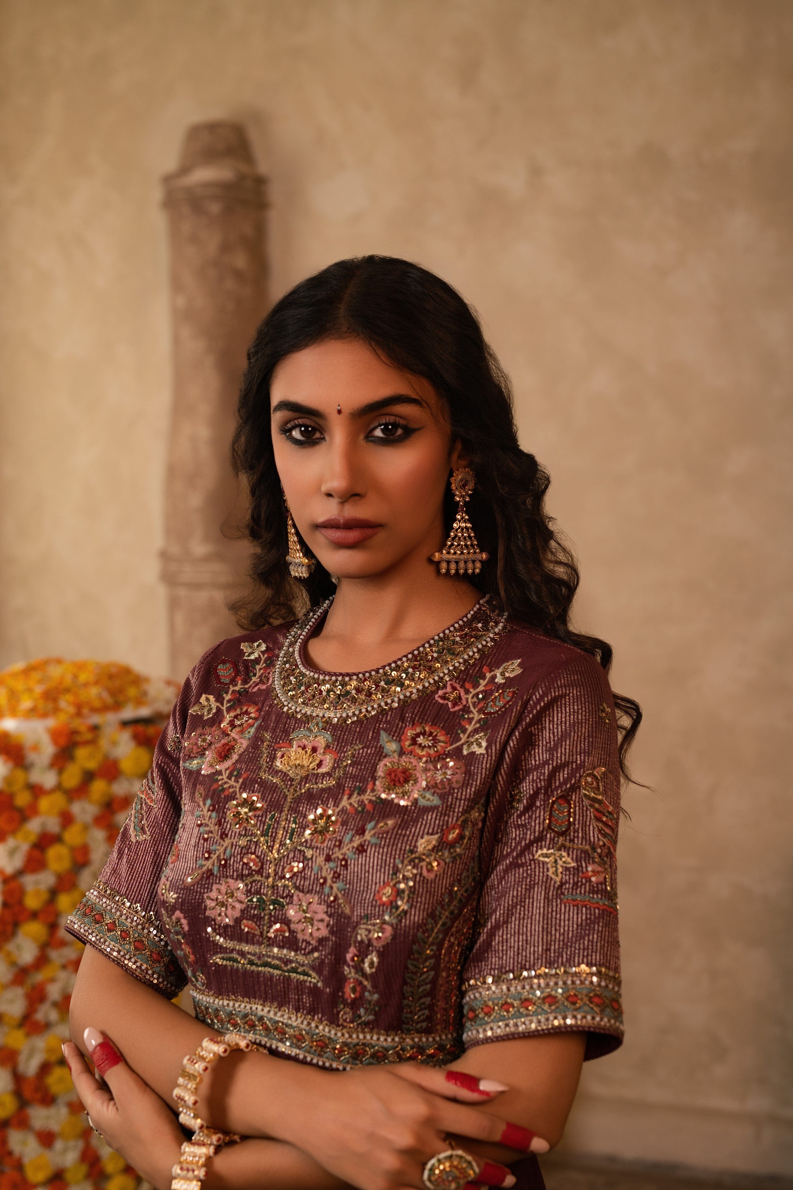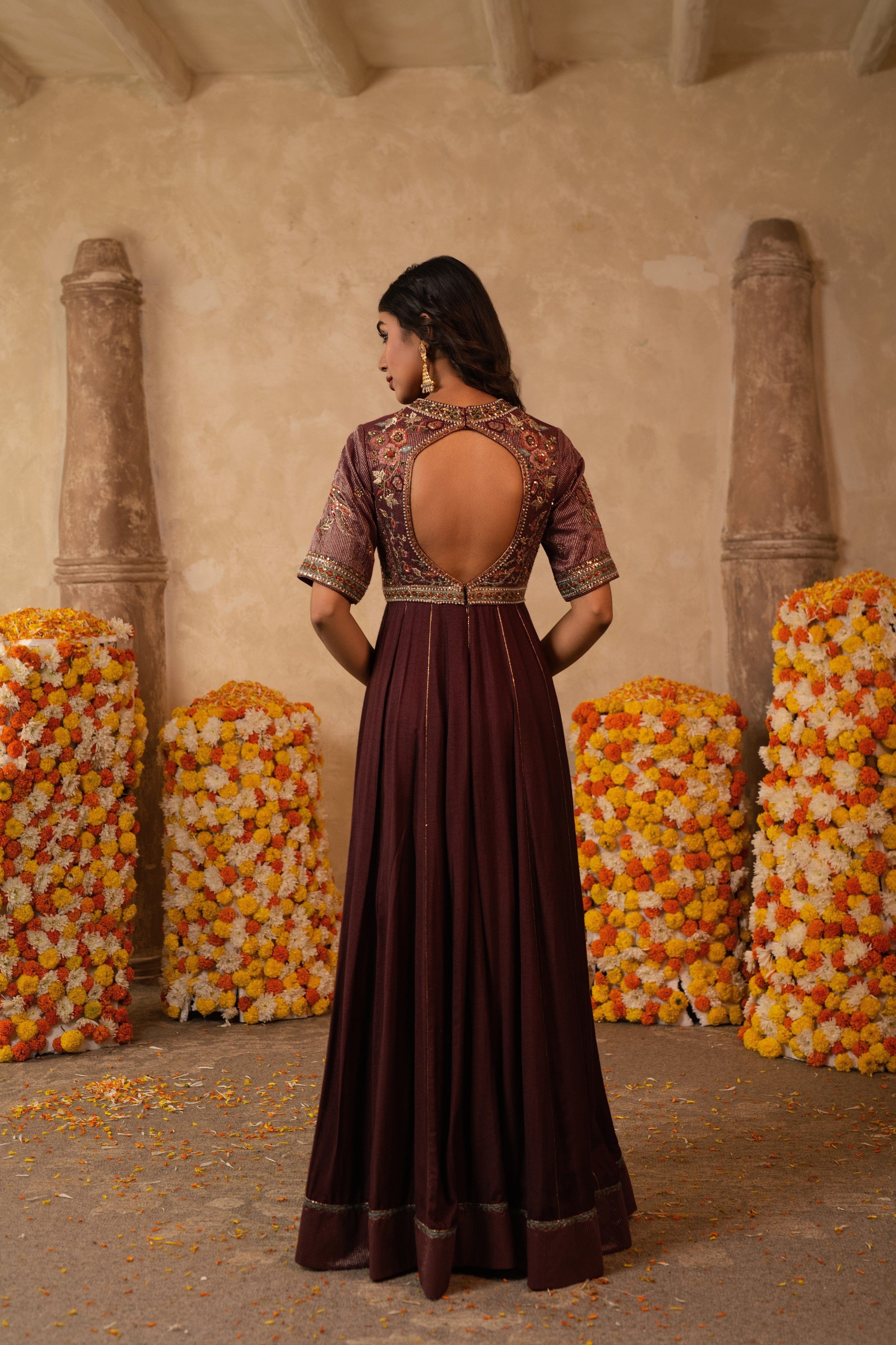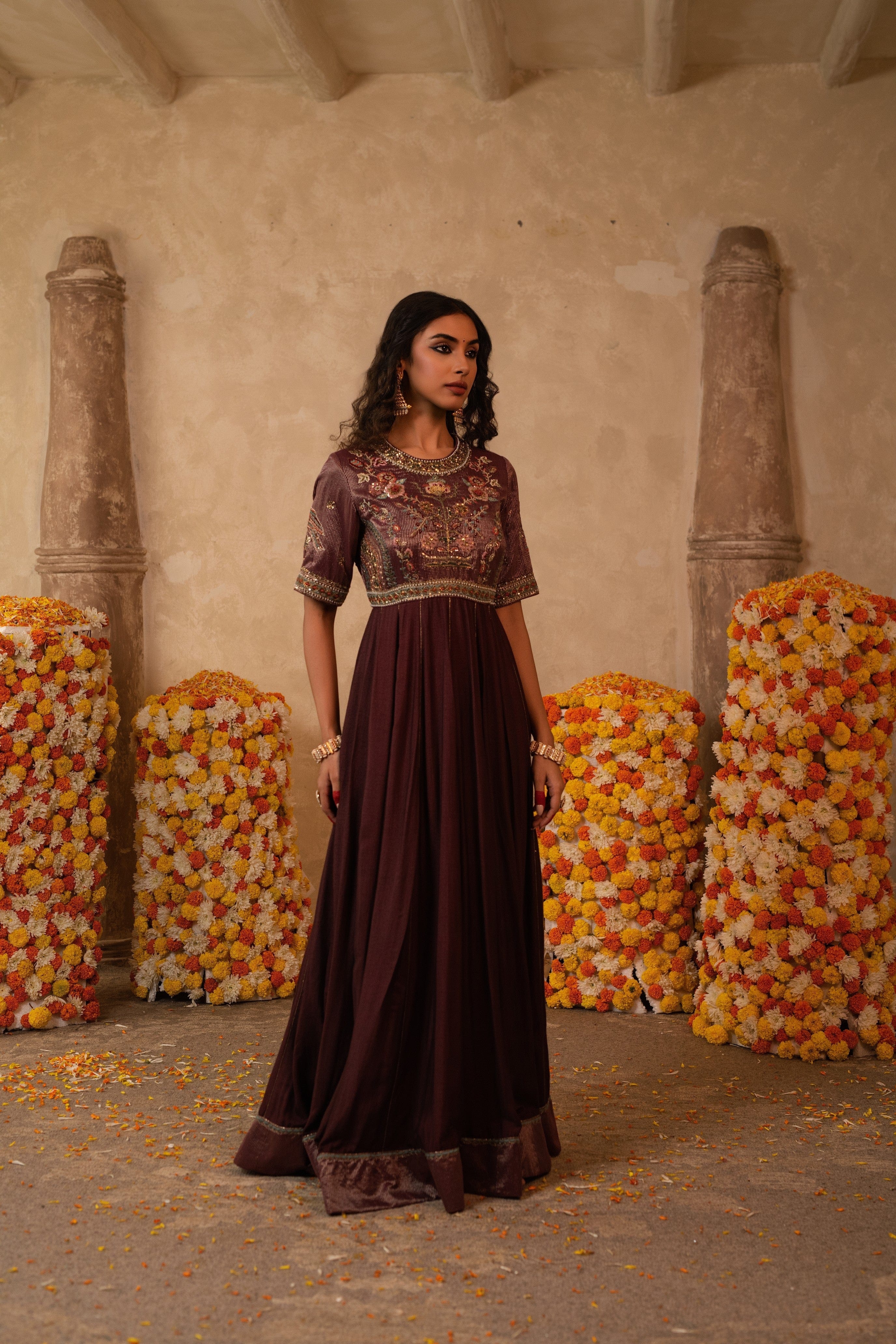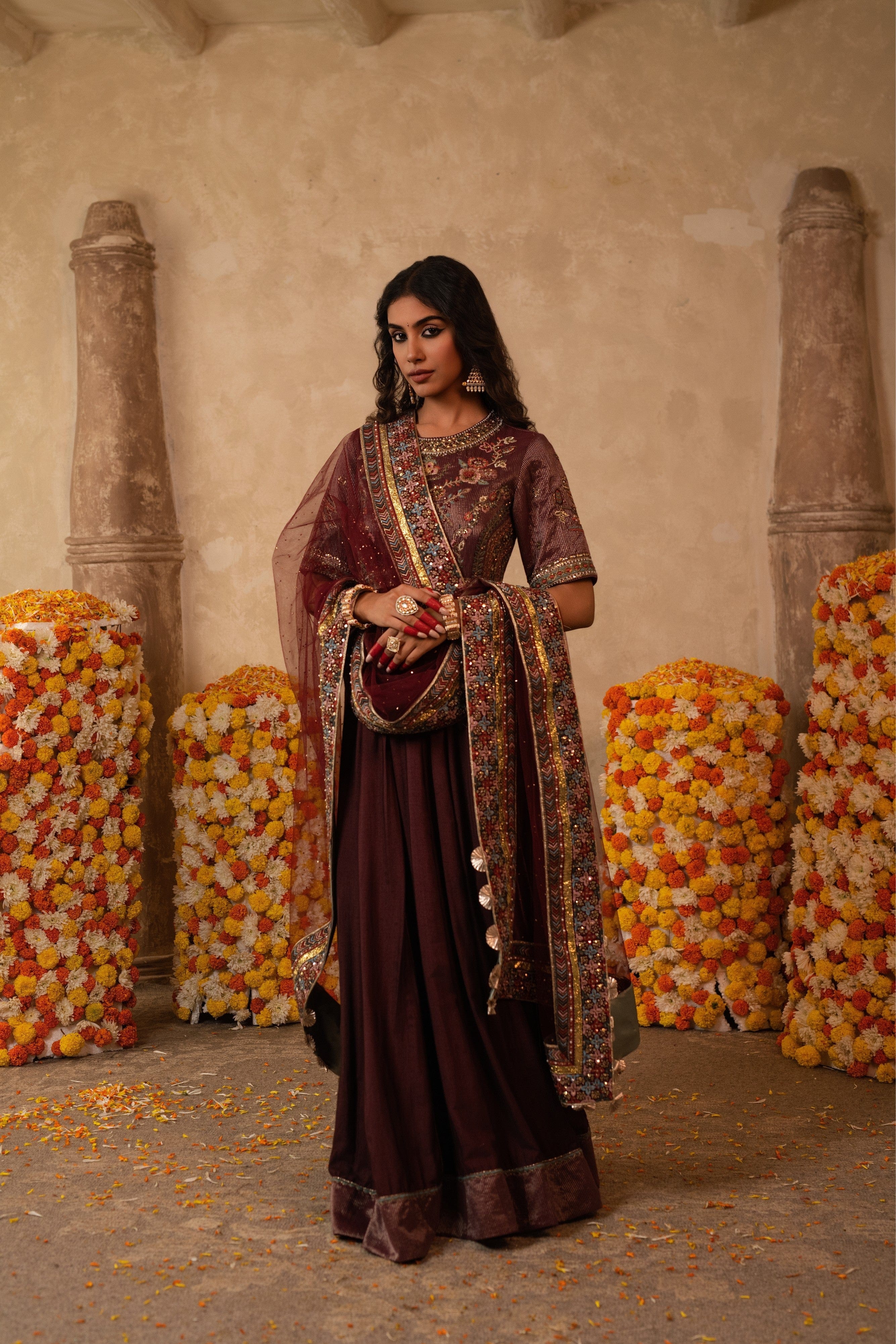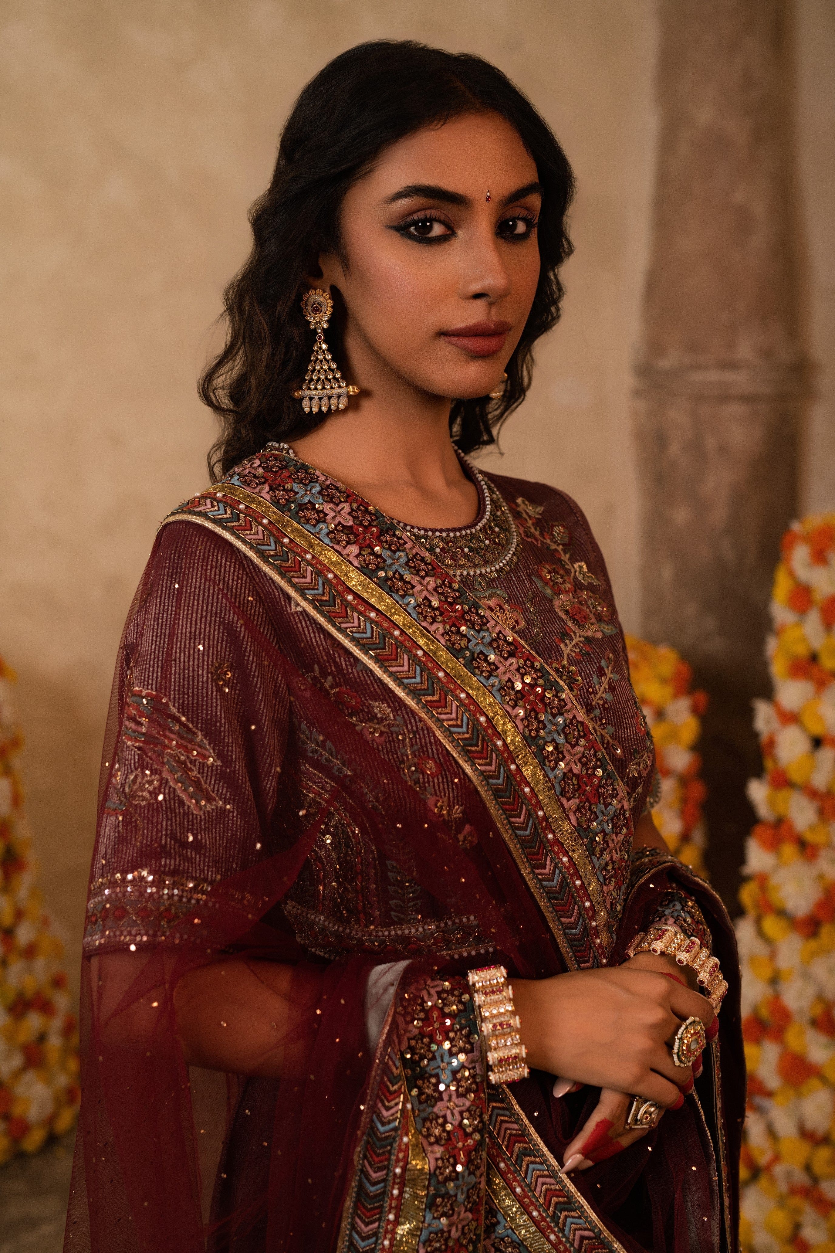 A timeless ruby anarkali adorned with detailed heritage embroidery and mirror highlights. The silhouette flows gracefully, complemented by a richly bordered dupatta. Elegant, warm, and regal?ideal for festive gatherings and intimate celebrations. This product will be exclusively handcrafted for you, making the colour/texture/pattern slightly vary from the image shown, due to multiple artisan-led techniques and processes involved.
