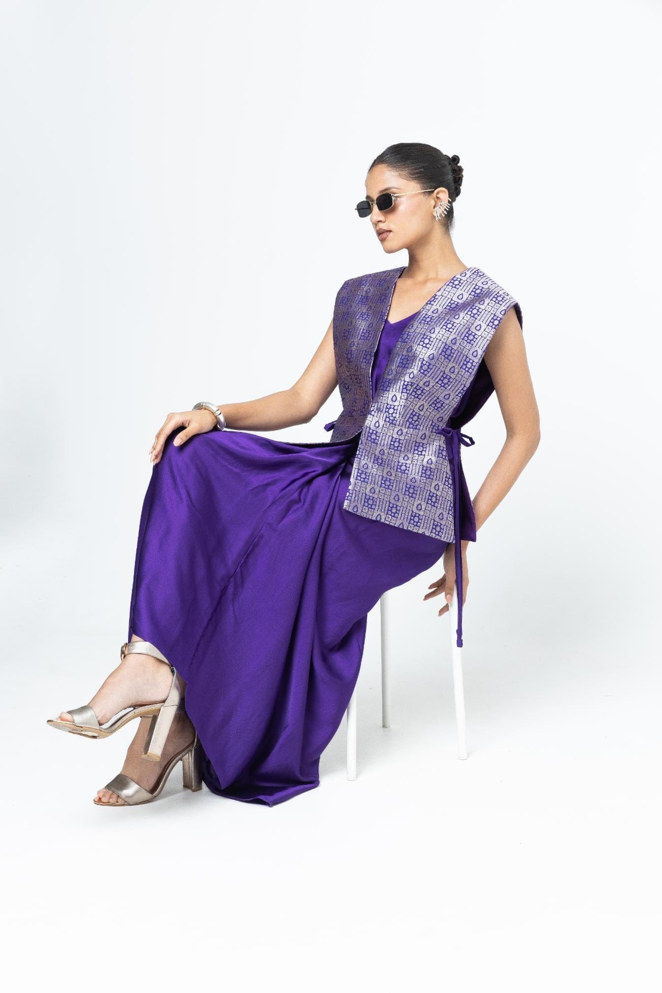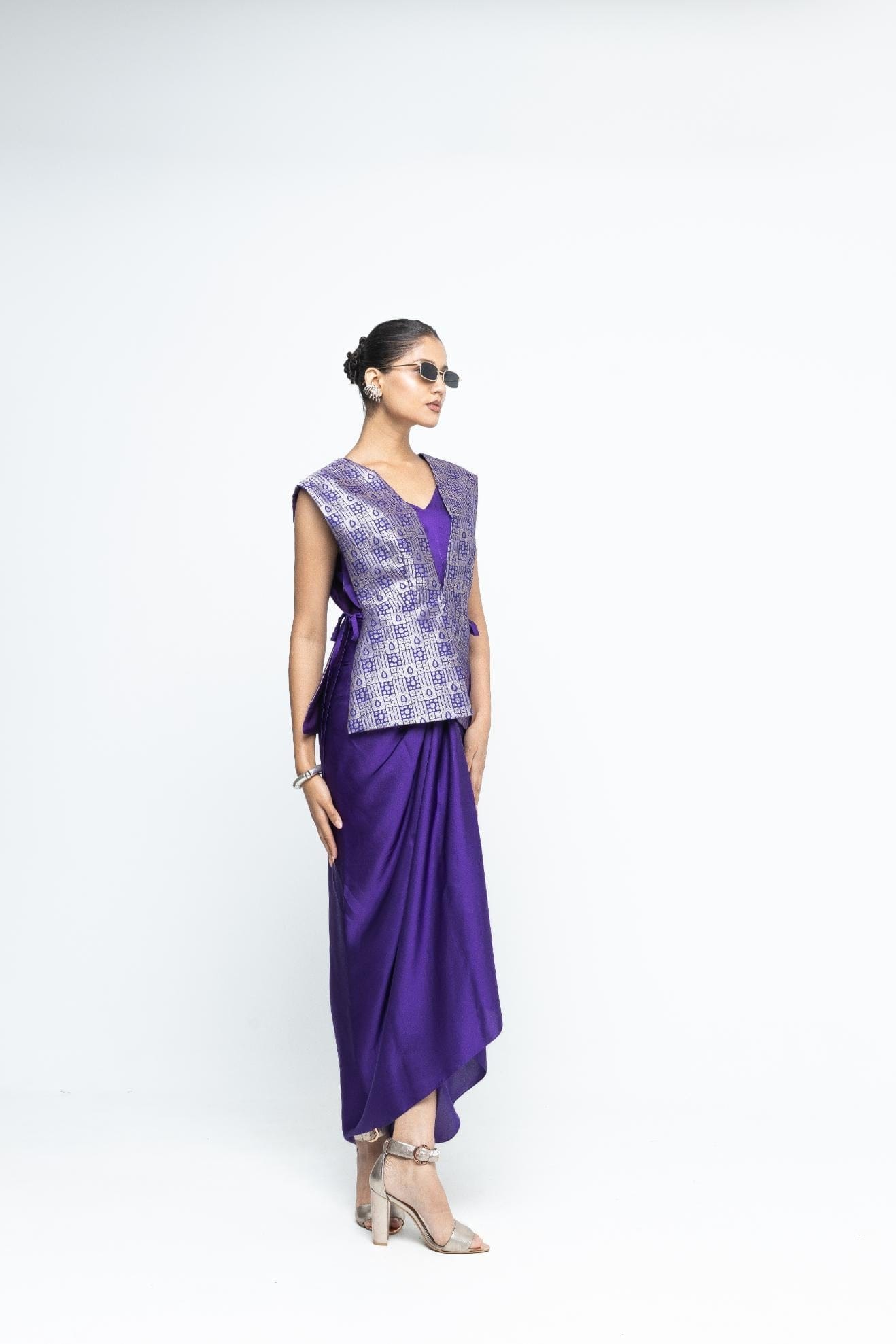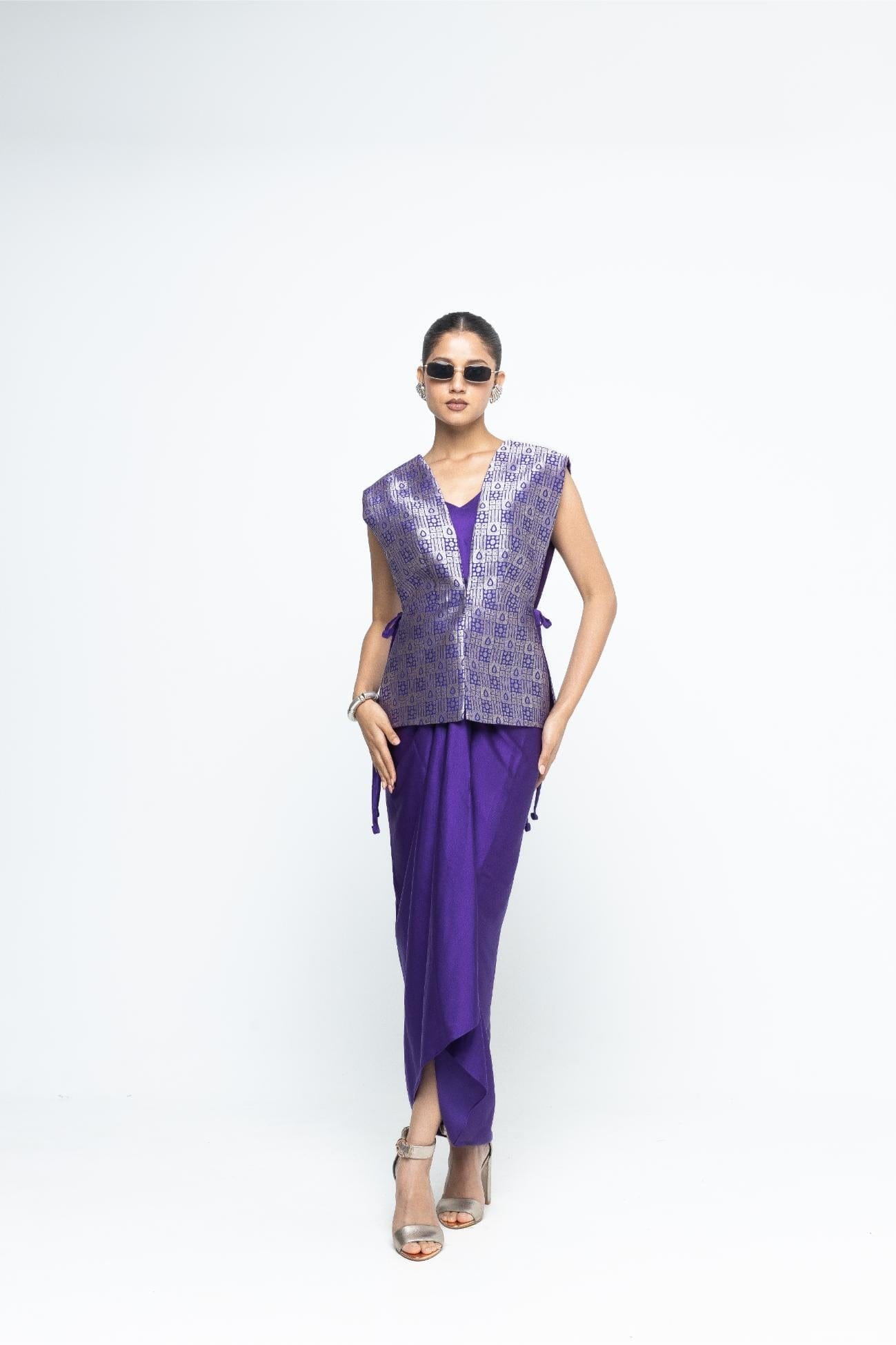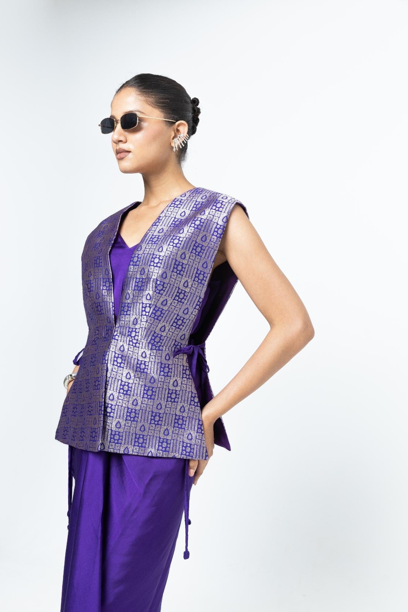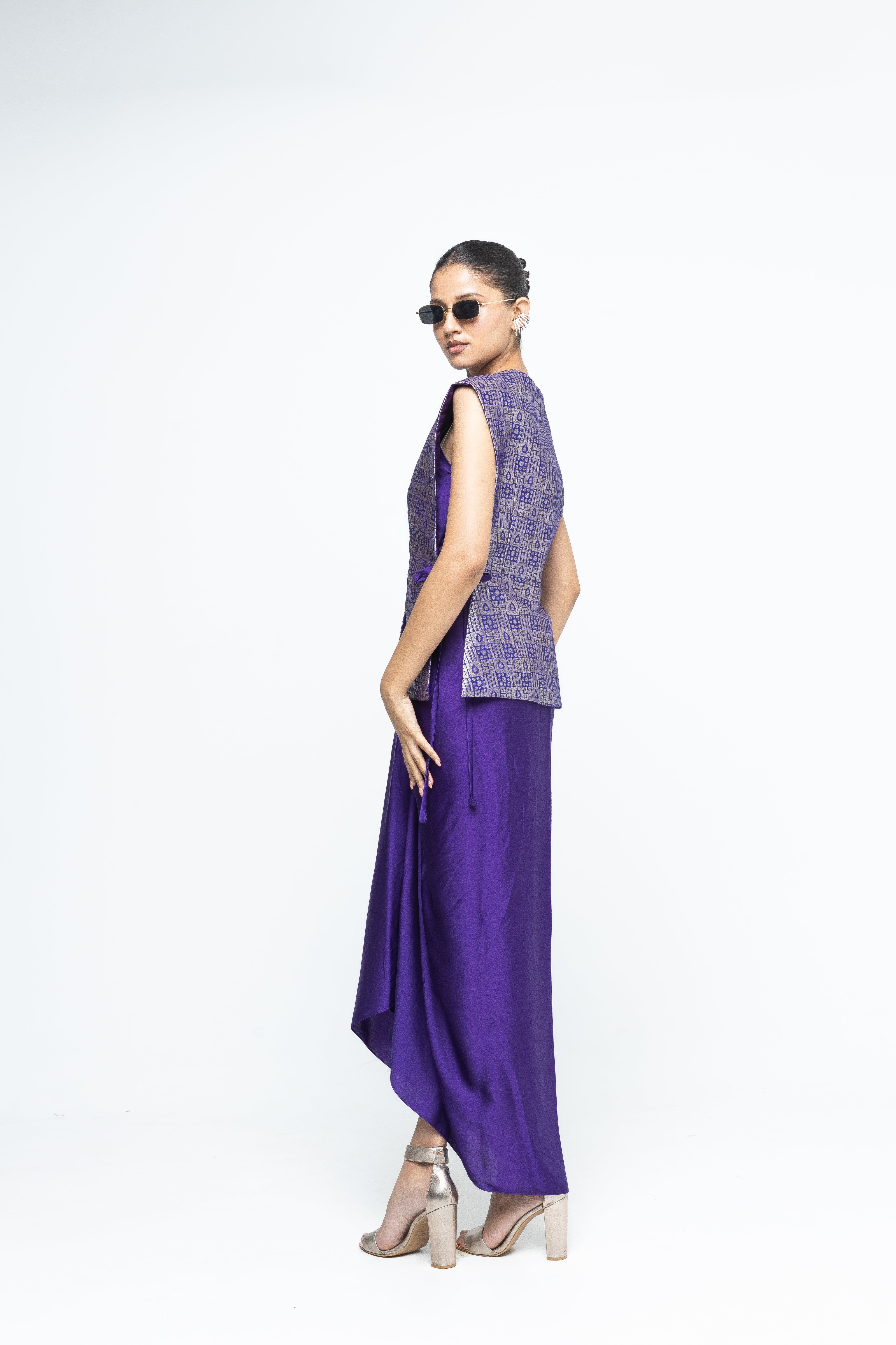 Purple Brocade Gilet with tie details on the side paired with a matching assymetrical dress